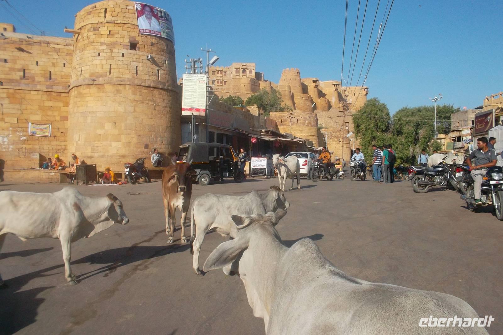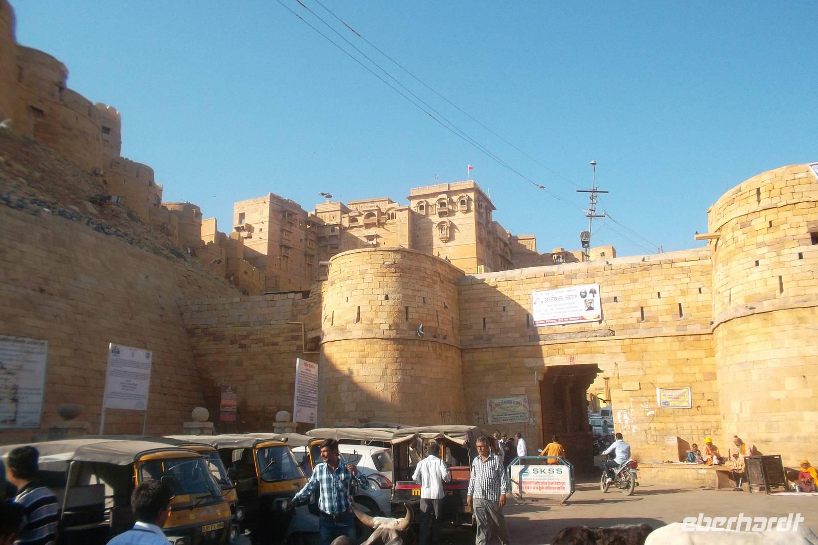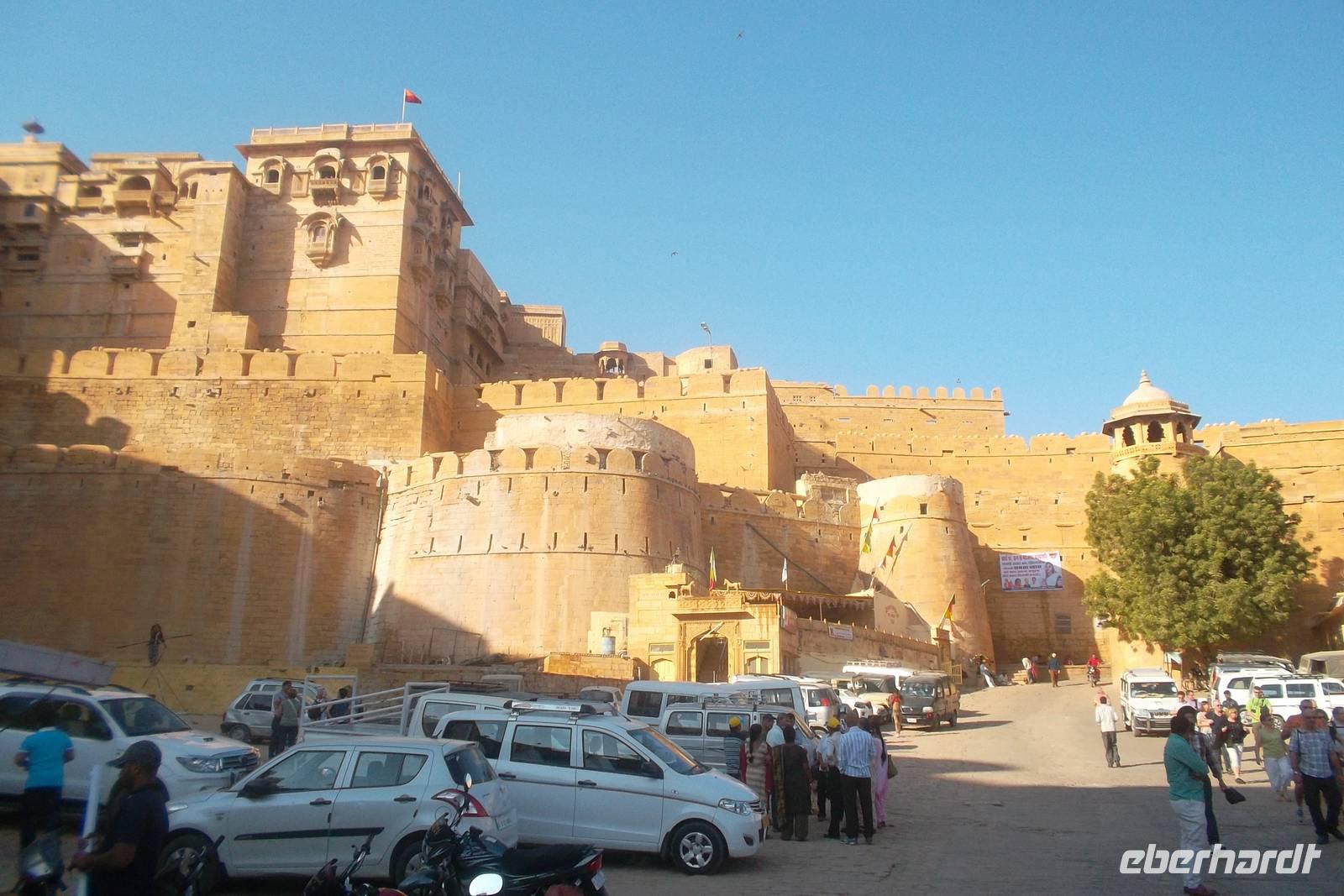 Die Altstadt von Jaisalmer wird oft als „Goldene Stadt" apostrophiert, denn ihr bevorzugtes Baumaterial ist honigfarben gelb leuchtender Sandstein. Der Ort entstand als wichtiger Handelsplatz an der Seitenlinie der historischen Seidenstraße und aus seiner Blütezeit stammen die Mauern und immer noch komplett vorhandenen 99 Türme der Zitadelle, die die immer noch völlig bewohnte Altstadt umschließt. So ist Jaisalmer ebenfalls eine der größten, noch ununterbrochen seit dem 12. Jh. bewohnten historischen Festungen der Welt.