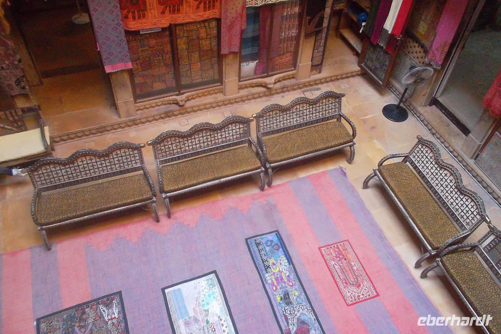 Eine bemerkenswerte Besonderheit des Gebietes sind auch die - früher in den Wüstenregionen besonders bedeutsam - durch vier Säulen gekennzeichnete Wüstenbrunnen. Diese sogenannten „Harlakhas" sind charakteristisch für alle Orte im Shekawati. Wir sahen mehrere von ihnen bei unserem Rundgang in Fatehpur und später beim Stadtbummel im nahegelegenen Nawalgarh, wo wir auch übernachteten. Auch einen der großen bemalten Havelis konnten wir ausgiebig besichtigen und uns seine ebenfalls bemalten gestaffelten Innenhöfe ansehen. Als Abschluss des Tages - und der Reise - übernachteten wir in einem besonderen Hotel - einem riesigen, restaurierten und völlig authentisch erhaltenen prächtigen Haveli!