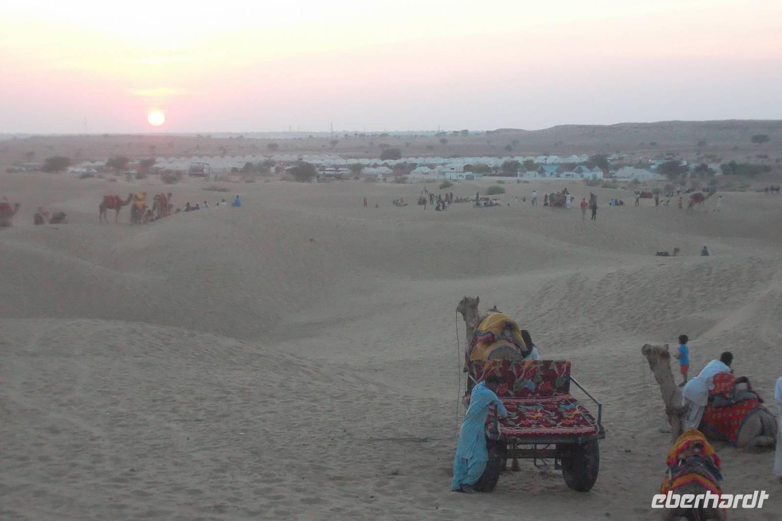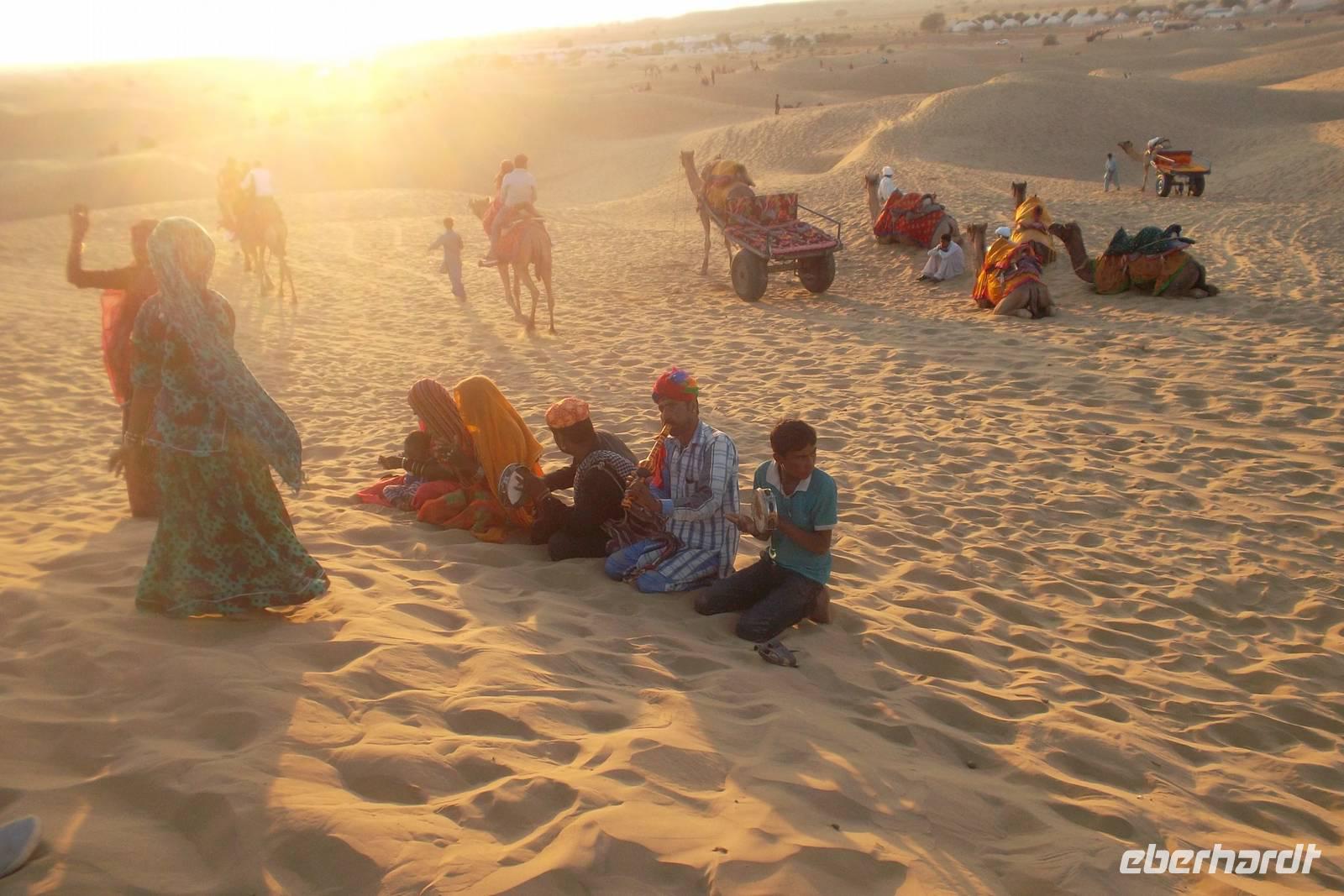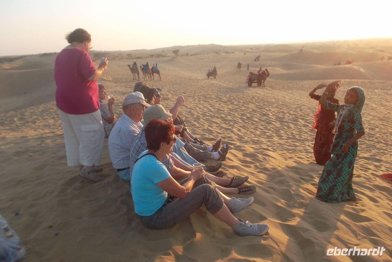 Spätnachmittags, knapp zwei Stunden vor Sonnenuntergang, fuhren wir dann mit dem Bus in Richtung Norden bis nach Sam, in die Mitte der Wüste Thar. Hier gibt es noch sahara-artig wirkende Sanddünen, die wir bei dem von allen mit Spannung erwarteten Dromedarritt kennenlernen würden. Rechtzeitig erreichten wir einen der Rastplätze, an denen die bereits fertig gesattelten Wüsten-Reittiere auf uns warteten. Einige von uns bestiegen mutig die hochbeinigen Reittiere, einige andere fuhren mit dem dazugehörenden Kamelwagen. Knapp eine Dreiviertelstunde zuckelten wir wie einst die alten Karawanen durch die Wüstensteppe und erreichten kurz vor dem Dunkelwerden die großen Sanddünen von Sam. Drapiert auf dem Kamm einer Sanddüne, mit einer Rum-Cola in der Hand, konnten wir den Tag mit einem romantischen, wie aus einem Heimatfilm stammenden Sonnenuntergang ausklingen lassen, wobei das exotische Ambiente noch von ein paar buntgekleideten Tänzerinnen und dazugehörenden Musikern begleitet und untermalt wurde ...