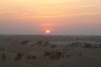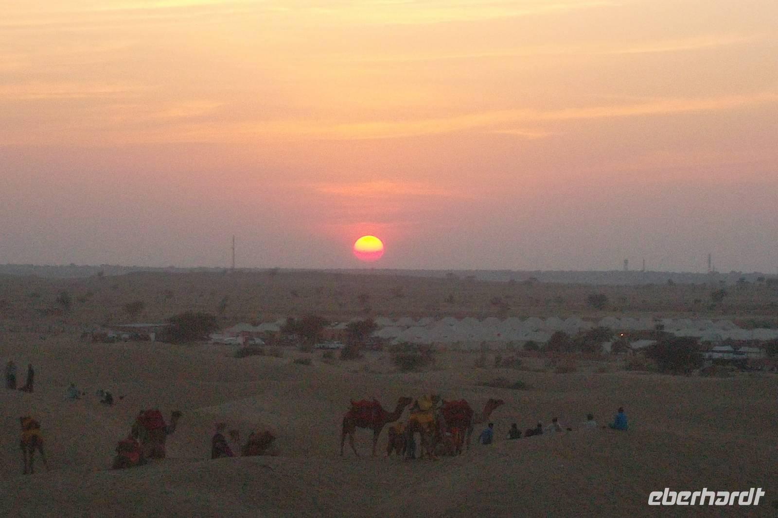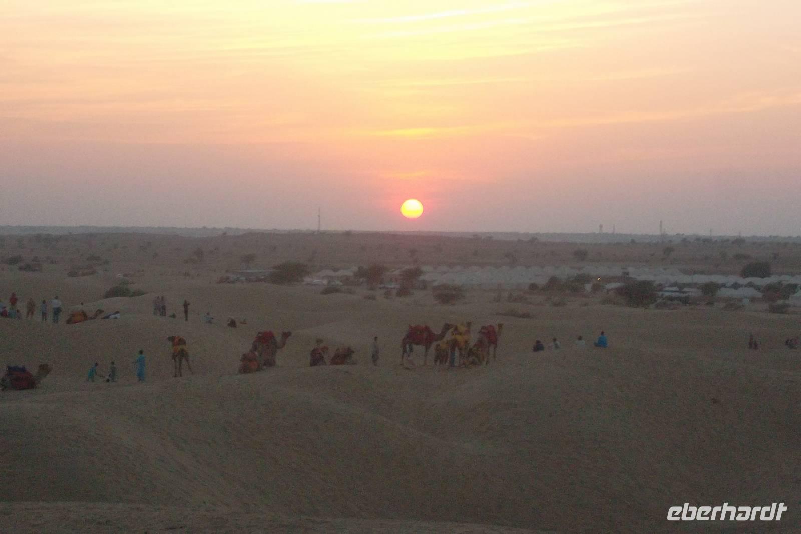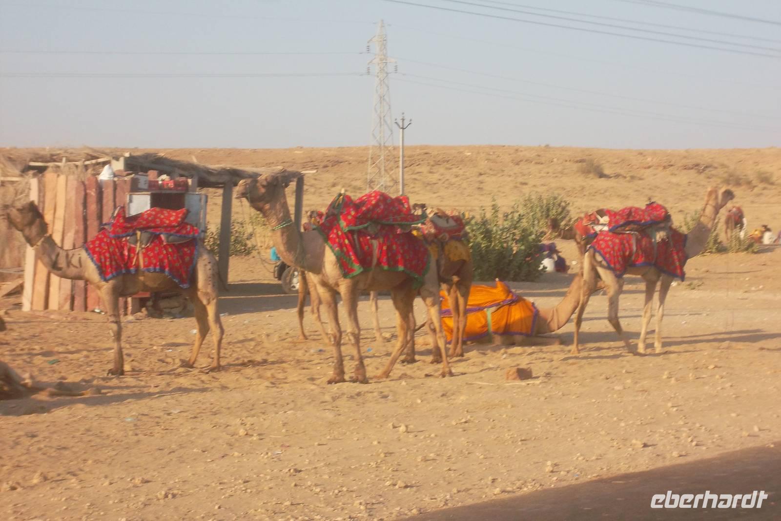 Spätnachmittags, knapp zwei Stunden vor Sonnenuntergang, fuhren wir dann mit dem Bus in Richtung Norden bis nach Sam, in die Mitte der Wüste Thar. Hier gibt es noch sahara-artig wirkende Sanddünen, die wir bei dem von allen mit Spannung erwarteten Dromedarritt kennenlernen würden. Rechtzeitig erreichten wir einen der Rastplätze, an denen die bereits fertig gesattelten Wüsten-Reittiere auf uns warteten. Einige von uns bestiegen mutig die hochbeinigen Reittiere, einige andere fuhren mit dem dazugehörenden Kamelwagen. Knapp eine Dreiviertelstunde zuckelten wir wie einst die alten Karawanen durch die Wüstensteppe und erreichten kurz vor dem Dunkelwerden die großen Sanddünen von Sam. Drapiert auf dem Kamm einer Sanddüne, mit einer Rum-Cola in der Hand, konnten wir den Tag mit einem romantischen, wie aus einem Heimatfilm stammenden Sonnenuntergang ausklingen lassen, wobei das exotische Ambiente noch von ein paar buntgekleideten Tänzerinnen und dazugehörenden Musikern begleitet und untermalt wurde ...