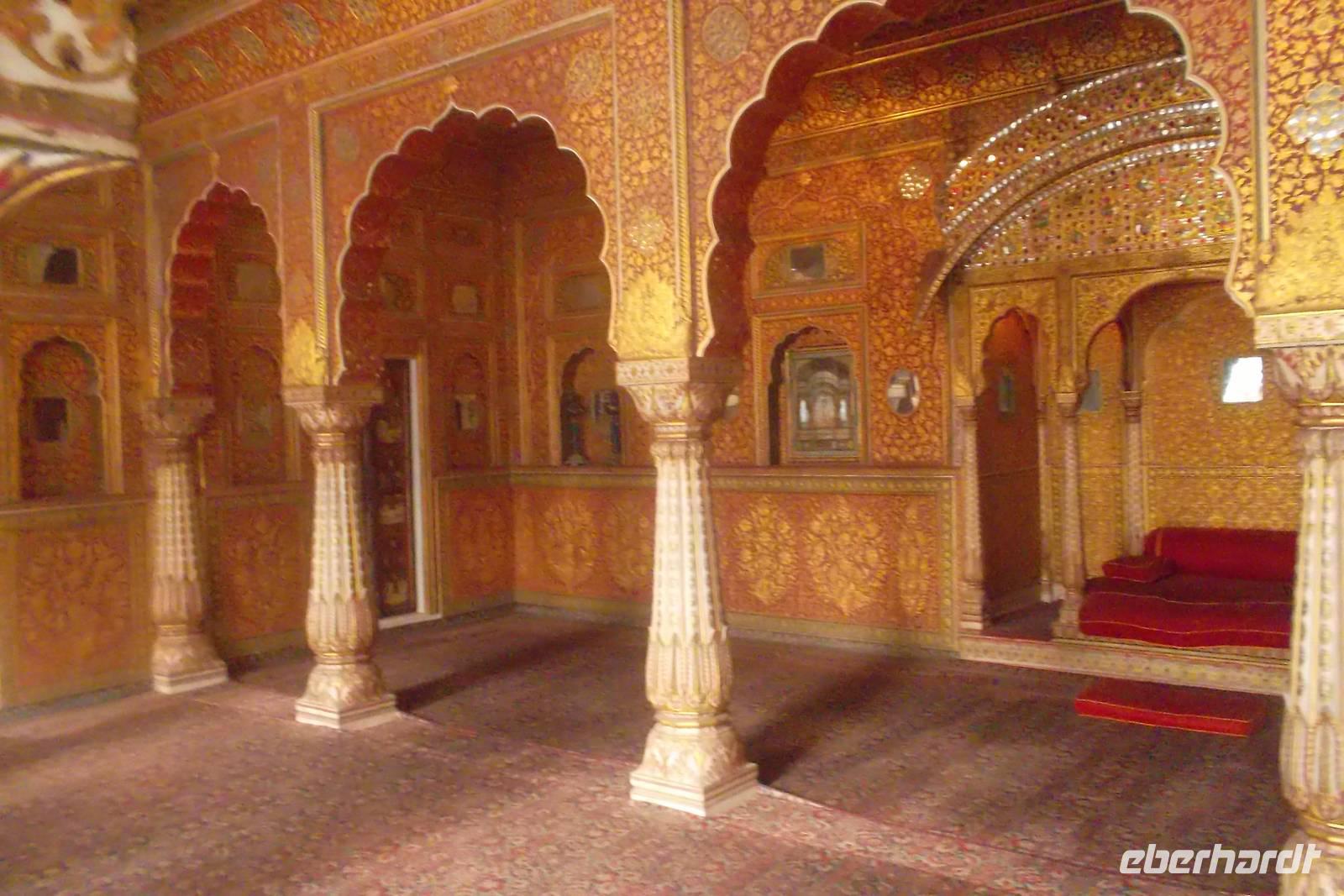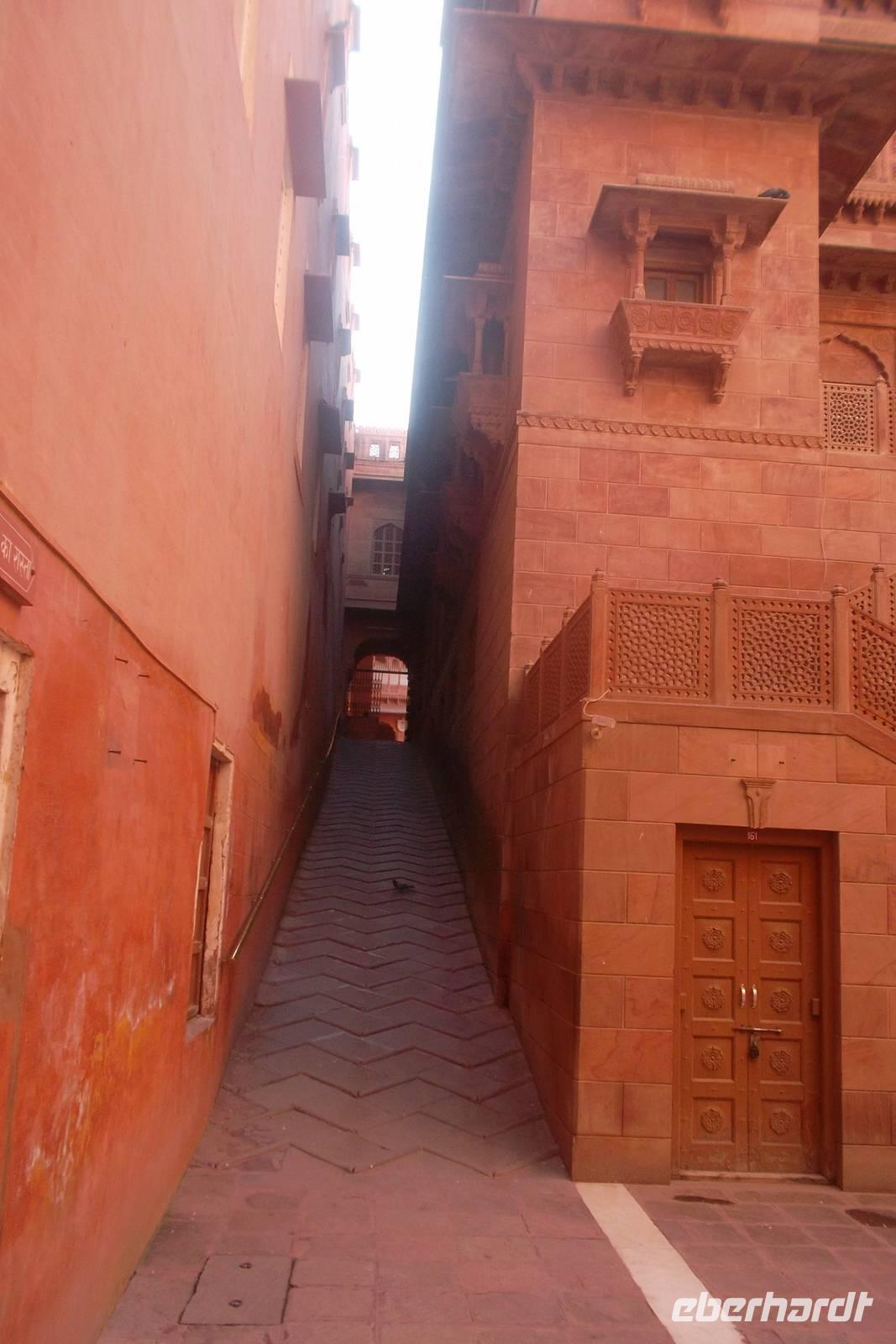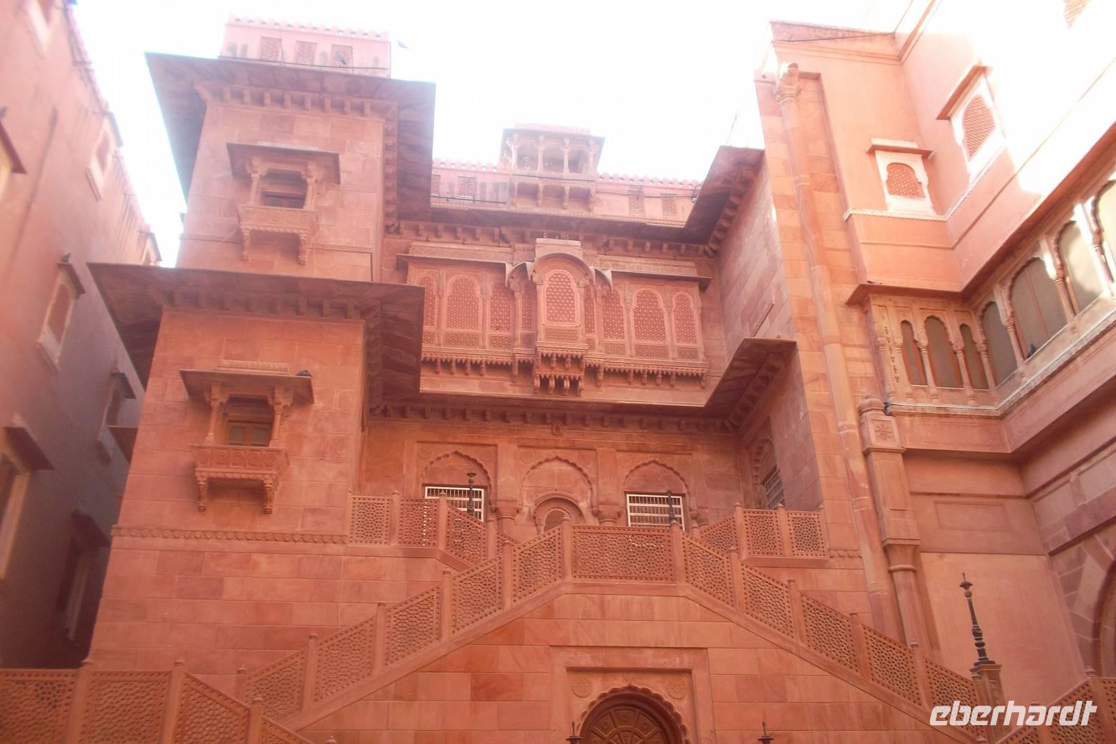 Unser heutiger früher Aufbruch sicherte uns gutes Vorankommen auf der doch recht langen Strecke. So erreichten wir schon zur Mittagszeit unseren nächsten „Etappenort" Bikaner. Die Großstadt ist ebenfalls eine als Handelsplatz entstandene historische Wüstenhauptstadt. Ihr gewaltiger, ursprünglich aus Sandstein und Gips errichteter Stadtpalast liegt aber ausnahmsweise nicht auf einem Berg, sondern ist als Festungsanlage mit gewaltigen Umfassungsmauern mitten in die Ebene gesetzt worden. Heute liegt das wehrhafte Junargarh Fort, das dennoch verziert und prunkvoll wirkt, mitten im Zentrum der um es herum entstandenen Stadt Bikaner. Der Ort wurde von Rao Bikaji aus einer Seitenlinie der Jodhpur-Rajputen im 15. Jh. gegründet und seine Nachfolger ließen im 16. Jh. die immer wieder umgebauten und modernisierten Sandstein-Befestigungen errichten. Prächtige Palasträume sind hier - im heute überwiegend als Museum genutzten Fort - zu bewundern, viele gestaltet nach bestimmten Motiven und Themen. Dazu gehören die bekanntesten Raumgestaltungen wie der Wolken- und der Blumenpalast. Einige Palastteile sind erbaut aus gelbem Marmor, oft mit weißem Marmorstaub verputzt und mit filigranen Lackarbeiten, Spiegel- und Glaseinlagen versehen und mit aufwendigen Wandmalereien ausgeschmückt. Junargarh Fort gilt heute als einer der am besten erhaltenen Rajputen-Paläste in Rajasthan und in ganz Indien, der gleich nach Betreten durch seine hübschen und strahlend weißen Innenhöfe mit verzierten Brunnen bezaubert.