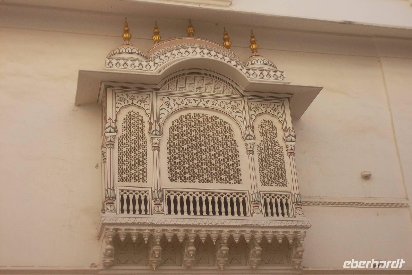 Jaipur, Verwaltungshauptstadt Rajasthans, ist fast so groß wie Berlin. Die „rosa Stadt" - wegen der bevorzugten Farbgebung ihrer Häuser so genannt - gehört zum „Goldenen Dreieck", der touristenintensivsten Zone Indiens Delhi-Agra-Jaipur, und hat so einiges zu bieten. Erstaunlicherweise ist ihr am häufigsten fotografiertes Objekt eigentlich nur eine Fassade - der fünfstöckige, nur wenige Meter tiefe „Hawa Mahal" - Palast der Winde - gehörte zum Stadtschloß-Komplex. Der aus kunstvoll bearbeitetem roten Sandstein bestehende Bau aus zahllosen sogenannten „Jaroka"-Balkonen (geschlossene Balkonerker) sticht durch hunderte Fenster hervor, die aus durchbrochenen steinernen Platten als Sichtblenden bestehen und die man in jedem einschlägigen Reiseführer als DAS Paradestück indischer Palastarchitektur finden kann. Der Name rührt von dem leichten Luftzug her, der beständig durch die durchbrochenen Fenster streicht, aber der Sinn der „Fensterarchitektur" ware es einst, den Damen des Rajputen-Hofes von Jaipur Privatsphäre und Zurückgezogenheit zu garantieren - denn verborgen durch die Fensterblenden konnten sie alles verfolgen, was auf der Straße vor sich ging, ohne selbst gesehen zu werden!