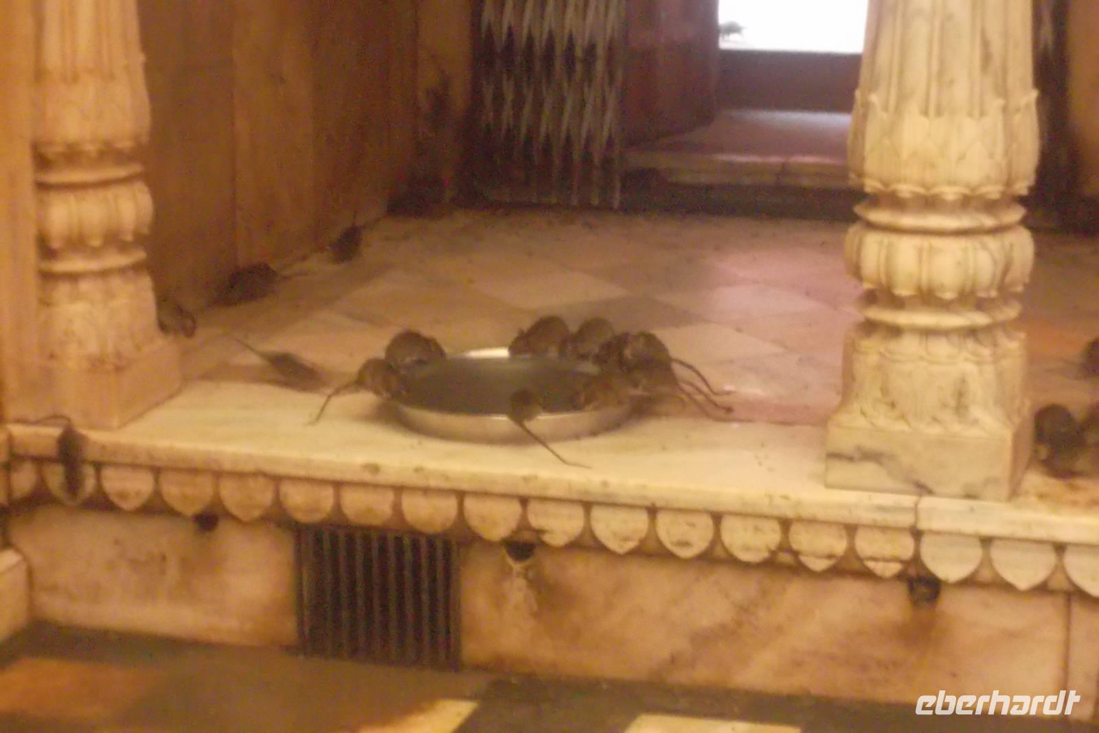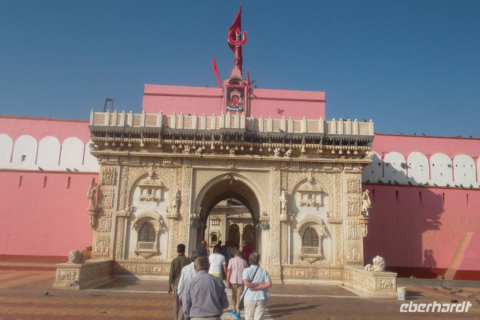 Da wir gestern Abend kaum noch Licht zu seiner Besichtigung gehabt hätten, begannen wir den heutigen Tag mit einem Besuch des berühmten „Rattentempels" Gelegen in der knapp 40 km von Bikaner entfernten Kleinstadt Deshnok, erfreut sich der „Karni Mata"-Tempel großer Beliebtheit bei der indischen Bevölkerung. Für uns Europäer ist die Begegnung mit freilaufenden - noch dazu verehrten - Ratten aber eher gewöhnungsbedürftig und daher ist die Besichtigung dieses Rattentempels „fakultativ". So geht es auch aus unserer Katalog-Ausschreibung hervor - keineswegs ist das Betreten dieses für uns seltsam wirkenden Sakralbauwerks ein „Muss"! Allerdings ist es dies wohl bei den zahllosen indischen Pilgern das ganze Jahr über , denn gläubige Hindus verehren hier im Tempel der „Karni Mata eine Inkarnation der Fruchtbarkeitsgöttin Durga. Der Kult manifestiert sich in etwa zwanzigtausend hier freilaufenden Ratten verehrt der Legende nach dergestalt, dass die Ratten als Dichter wiedergeboren werden würden. Überhaupt: zum Hinduglauben gehören Schutz und Verehrung jeglicher Art von Leben - daher werden Ratten und andere Tiere hier nicht als Ungeziefer, sondern positiver gesehen als bei uns in Europa.
