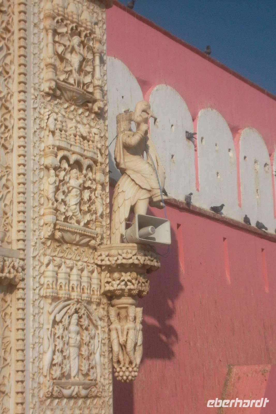 Einer der Tageshöhepunkte war dann aber der Besuch der Jain-Tempel von Ranakpur. Neben der ähnlich gewaltigen und verzierten Anlage der Dilwara-Tempel von Mount Abu gelten die in der zweiten Hälfte des 15. Jahrhunderts errichteten Jain-Tempel von Ranakpur als die größten ihrer Art in Indien und gehören zu den wichtigsten Pilgerzielen dieser Religionsgemeinschaft. Zwar ist der dem Heiligen „Wegbereiter" der Jain-Religion Adinath gewidmete Tempel zunächst eher unscheinbar, aber verzückt sofort jeden Besucher: im Inneren erwarten ihn 1444 mit Kerbschnitzerei reich verzierte Säulen aus weißem Marmor. Die Form des Tempels als die eines Chaumukha- (bedeutet etwa „viergesichtigläßt die Haupt-Götterfigur in die vier Himmelsrichtungen blicken - in jede ein Gesicht. Diesem Plan folgend, ist nach allen Seiten der mehrgeschossige Zentralraum von offenen Säulenhallen umgeben, die das Tempelinnere zu einer eindrucksvollen Show herrlichen jainistischen Kunsthandwerksmachen. Dabei wurde die Kunst an einem der härtesten zu bearbeitenden Gesteine ausgeführt und die Künstler wurden - je nach Feinheit der ihnen zugeteilten Arbeit - zur Entstehungszeit täglich nach dem vorzuweisen Gesteinsabfall bezahlt. .