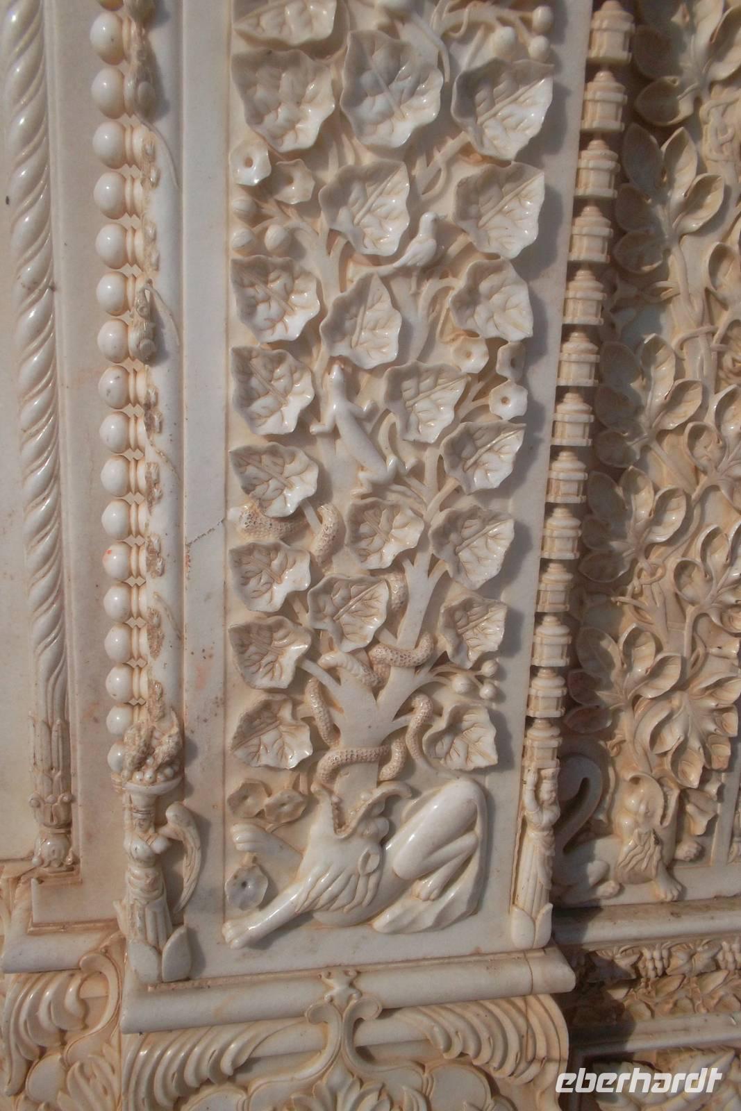 Der zentrale Kuppelbau ist vollendet harmonisch gestaltet, aus Marmor aus Rajasthan erbaut und mit herrlichen Einlegearbeiten aus Edel- und Halbedelstein und feinster Steinschnitzerei geschmückt.