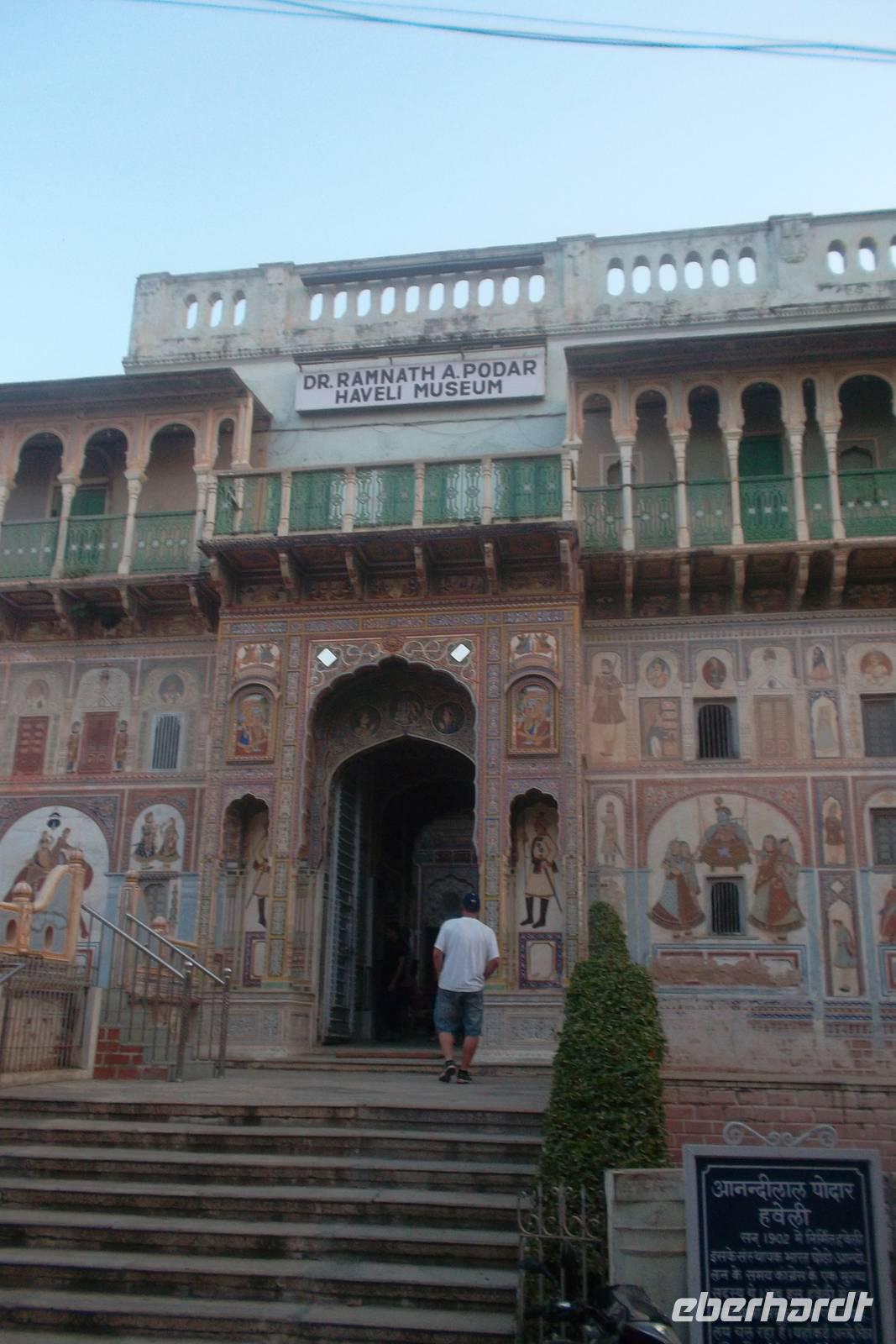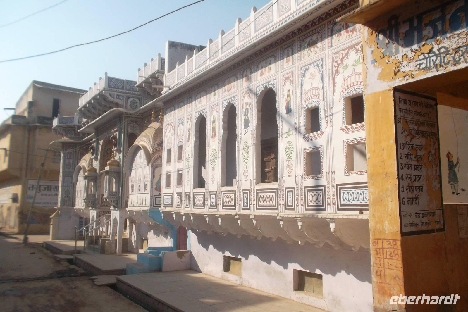 Nach Besuch des Rattentempels, bei dem es uns tatsächlich gelang, BEIDE hier lebende weiße Ratten zu sehen - was der Legende des Tempels nach viel persönliches Glück nach sich zieht! - fuhren wir weiter und gelangten nachmittags ins „Shekawati-Gebiet" der bemalten Kaufmannspaläste rund um den Ort Mandawa. Eine Nebenlinie der historischen Seidenstraße führte hier hindurch und bescherte den Handelsplätzen Reichtum. Das manifestierte sich im Bau prächtiger Wohnpaläste für die reichen Kaufleute. Diese „Havelis" wurden hier mit prachtvollen Wandmalereien versehen - sozusagen eine Alternative für die geschnitzten Haveli-Fassaden, die wir von Jaisalmer kannten. Im Herz des Gebietes liegt die alten und hoffnungslos überfüllt scheinende Stadt Fatehpur, deren verwinkelte und enge Gassen einige der bekanntesten Havelis des „Shekawati"-Gebiets beherbergen. Leider sind die meisten der Prunkvillen nicht nur verlassen oder von Verwalterfamilien bewohnt, viele sind regelrecht verkommen oder brechen in sich zusammen. Dennoch zeigten viele der alten Paläste noch den Abglanz einstiger Pracht und den „morbiden Charme" einer ruinösen Pracht architektonischer Besonderheiten und verbleichender Schönheit.