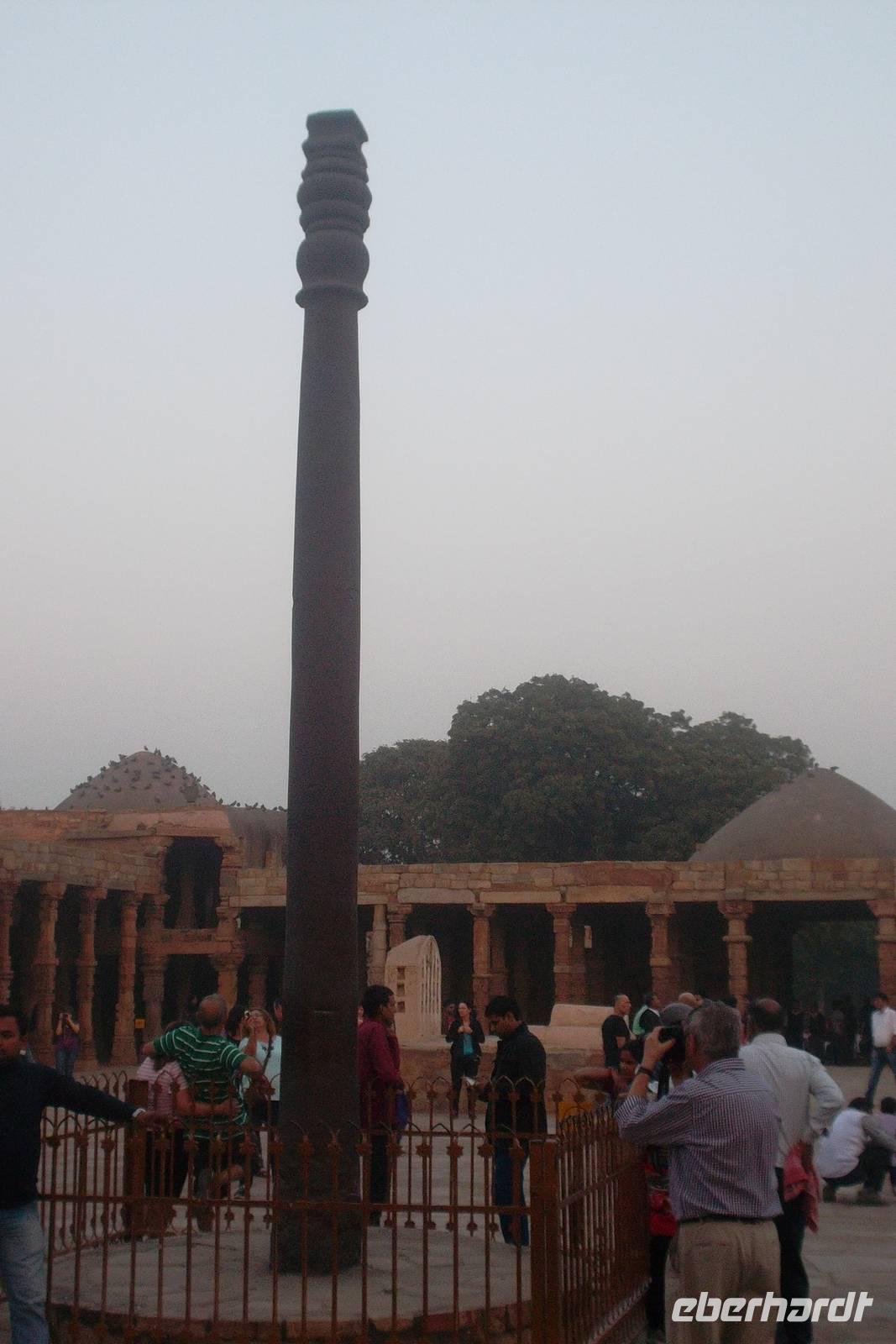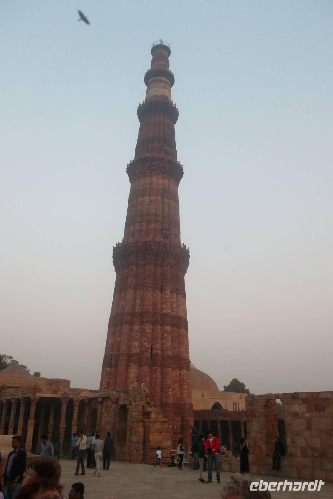 Das timing war zwar knapp, aber wir schafften es, rechtzeitig vor Sonnenuntergang und bei noch erträglichen Fotolicht-Verhältnissen einer besonderen Sehenswürdigkeit Delhis einen Besuch abzustatten. Etwas außerhalb gelegen errichteten die ersten muslimischen Herrscher hier errichteten Ende des 12. Jh. eine Moschee, zu deren Bau sie Teile alter Hindutempel verwendeten. Als besonderer Höhepunkt entstand das gewaltige Minarett. Das Qutub Minar ist mit 72 m Höhe eines der höchsten muslimischen Bauwerke und war lange Zeit das höchste in ganz Asien. Stolz über den Sie über die Hindus errichteten die muslimischen Herrscher es als Sieges- und Wachturm, Wahrzeichen und Minarett für den Gebetsruf. Seit 1993 gehört das prächtige Bauwerk des Islam zum UNESCO-Weltkulturerbe, bei dem besonders sein Farbwechsel aus verschieden Sandsteinen ins Auge fällt - denn er zeigt sich bei jeder Art von Beleuchtung in anderen Kombinationen. Im Hof der danebenliegenden Moschee-Ruine findet sich als beliebtes Foto-Motiv auch die berühmte „nichtrostenden Eisensäule".