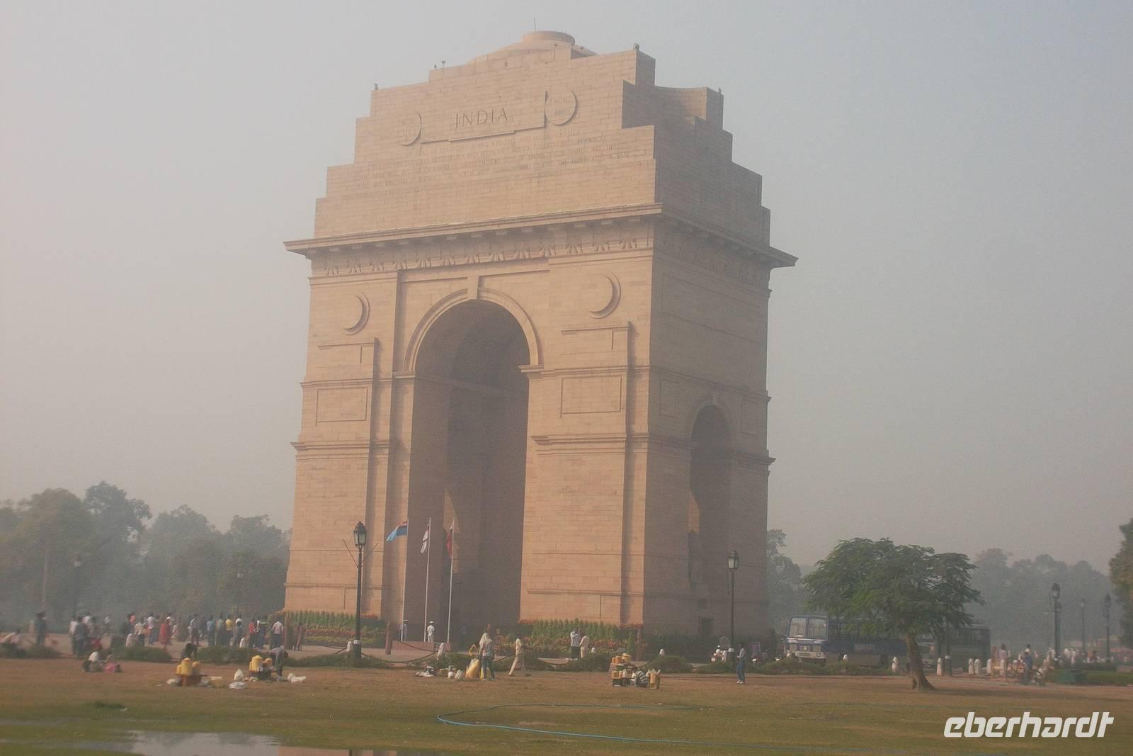 Symmetrisch liegen sich hier im Regierungsviertel, an das man nicht immer so nahe und problemlos herankommt, die Paläste des Präsidenten und des Vizepräsidenten gegenüber und unweit davon erkennt man den gewaltigen Rundbau des Parlamentsgebäudes von Indien. Genau eine englische Meile lang ist die von hier ausgehende Paradestraße, die am berühmten India-Gate endet. Das war nach einem Fotostopp im Regierungsviertel unser nächstes Ziel. An diesem 42 m hohen Triumphbogen ist immer etwas los, drängen sich Schaulustige, schlendern Familien mit ihren Kindern, bieten Händler Snacks, Spielzeug und allerlei Kleinigkeiten feil. Neu Delhis vielleicht bekanntestes und umdrängtestes Monument wurde 1921 vom damals berühmten englischen Architekten Sir Edwin L. Lutyens entworfen - zum Gedenken an die Inder, die im ersten Weltkrieg gefallen waren. Daher sind im Inneren des torähnlichen Bauwerkes 90.000 Namen eingraviert und es befindet sich das „Grab des unbekannten" Soldaten mit ewiger Flamme - gemeinsam bewacht von Soldaten aller Waffengattungen der indischen Berufsarmee.
