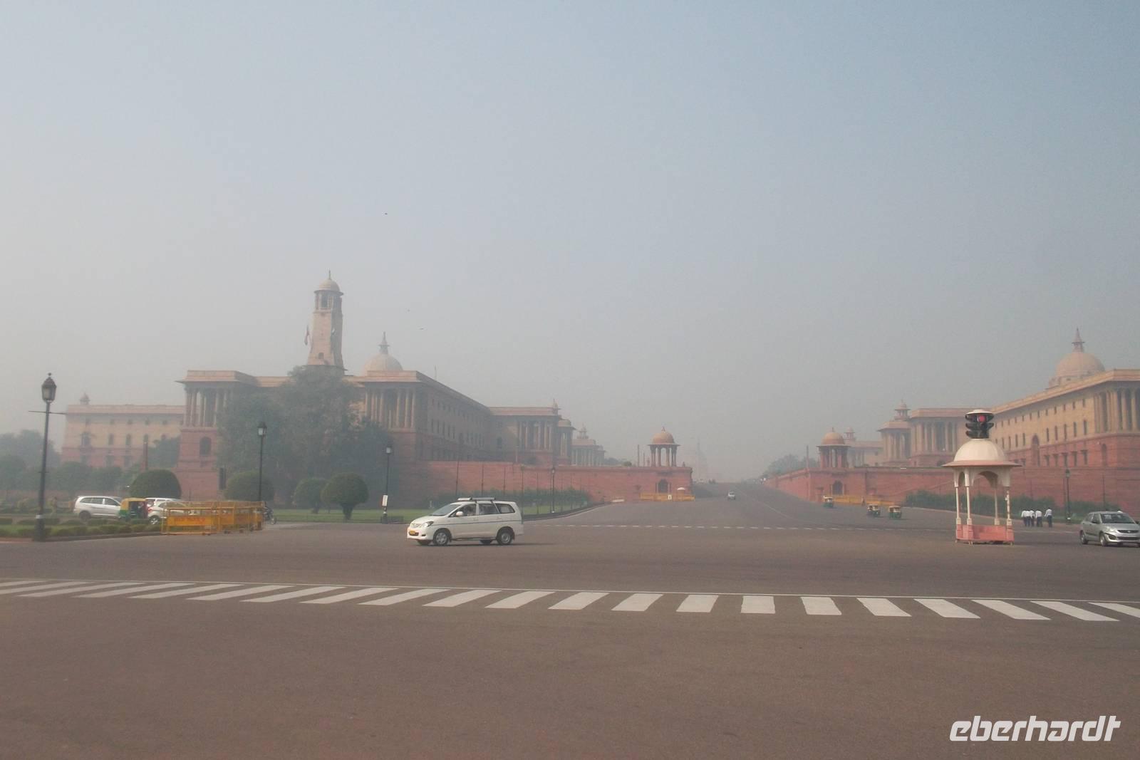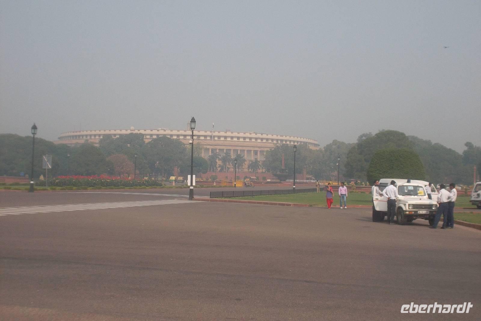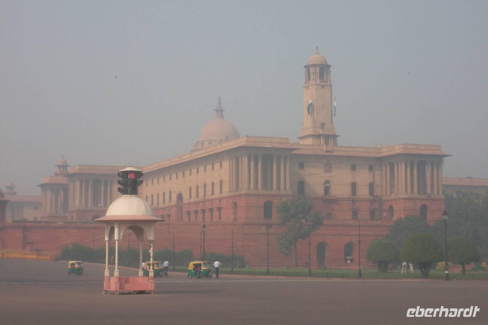 Da heute Sonntag war, ging es noch nicht gleich mit ganz wildem Verkehr los - denn unser erstes Ziel war das Regierungsviertel. Die Stadt Delhi ist sehr alt und hatte verschiedene Bauphasen, aber eines ihrer Viertel ist noch sehr jung - eine direkte Hinterlassenschaft der britischen Kolonialzeit. Genau dieses war erstes Besuchsziel - jenes NEU-Delhi, das seit 1911 als britischer Verwaltungssitz der Kronkolonie Indien erbaut wurde. Zwanzig Jahre nach Baubeginn wurde dann die britische Verwaltungshauptstadt von Kalkutta hierher verlegt. Nach der Unabhängigkeit 1947 übernahm der damals junge Staat Indien und machte das einstige britische Zentrum zum „Nationalen Hauptstadt-Territorium Neu-Delhi". Damit wurde das weitläufige Areal Regierungssitz von „Bharat Ga?arajya". So heißt die größte Demokratie der Welt mit mehr als 1,2 Milliarden Einwohnern in der Landessprache.