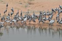 Um 09.00 fahren wir ab in die Wüstenstadt Jaisalmer. Wir halten in der Oasenstadt Ossian und besichtigen sie. Auf der Weiterfahrt kommt uns eine große Dromedarherde entgegen, die zur Tränke geht, was sehr schöne Photos einbringt, denn natürlich halten wir sofort an. Als Extra bauen wir einen Abstecher in die Oase Khichan ein, wo es an mehreren Wasserstellen Tausende Jungfernkraniche gibt, welche von den Dorfbewohnern über den Winter gefüttert werden. Daher kommen wir auch dicht an diese wunderschönen Vögel heran. Als wir weiterfahren, bleiben wir an zwei hartnäckig verschlossenen Bahnübergängen fast 45 Minuten hängen - halt indische Verkehrsverhältnisse. Wir fahren dann auch einen weiteren Extrapunkt an, die Wallfahrtsstadt Ramdeora und besuchen sie. Dann geht es weiter nach Jaisalmer, wo wir später im Hotel ankommen.