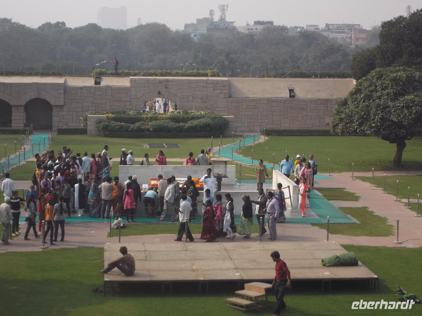Nach dem Aufenthalt in Indiens größter Moschee galt unser nächster Besuch dem Rajghat, der Stätte, an der einst Mahatma Ghandis Körper nach Hindusitte dem Feuer übergeben wurde. Bis heute genießt der Gründer Indiens überall große Verehrung, die auch durch seinen Beinamen „Mahatma" (="große Seele") ausgedrückt wird.