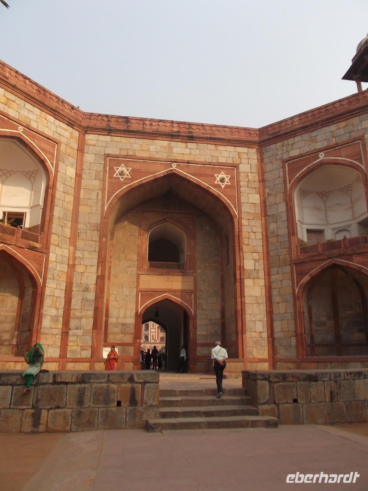 Der Nachmittag begann mit einem Besuch am Grabmal des Humayun, des zweiten der einst bedeutenden Mogulherrscher, der im 16. Jh. lebte. Der in rotem Sandstein gehaltene und mit weißem Marmor prächtig abgesetzte Bau gehört nicht nur zum UNESCO-Weltkulturerbe, er gilt unter Kennern mitunter auch als architektonischer Vorgänger des berühmtesten aller indischen Gebäude, des Taj Mahal, das wir am nächsten Tag sehen würden. In nur achtjähriger Bauzeit hatten die Architekten damals den einzigartigen Bau errichtet und bei diesem Grabmal in seiner berühmten weißen Kuppel erstmal die damals neue und revolutionäre Technik der Doppelkuppel verwendet. Dafür fehlen bei diesem relativ früh errichteten Mausoleum die Stuckarbeiten, Wandmalereien und Intarsienverzierungen mit floralen Motiven, die bei nachfolgenden herrschaftlichen Grabmonumenten typisch wurden.