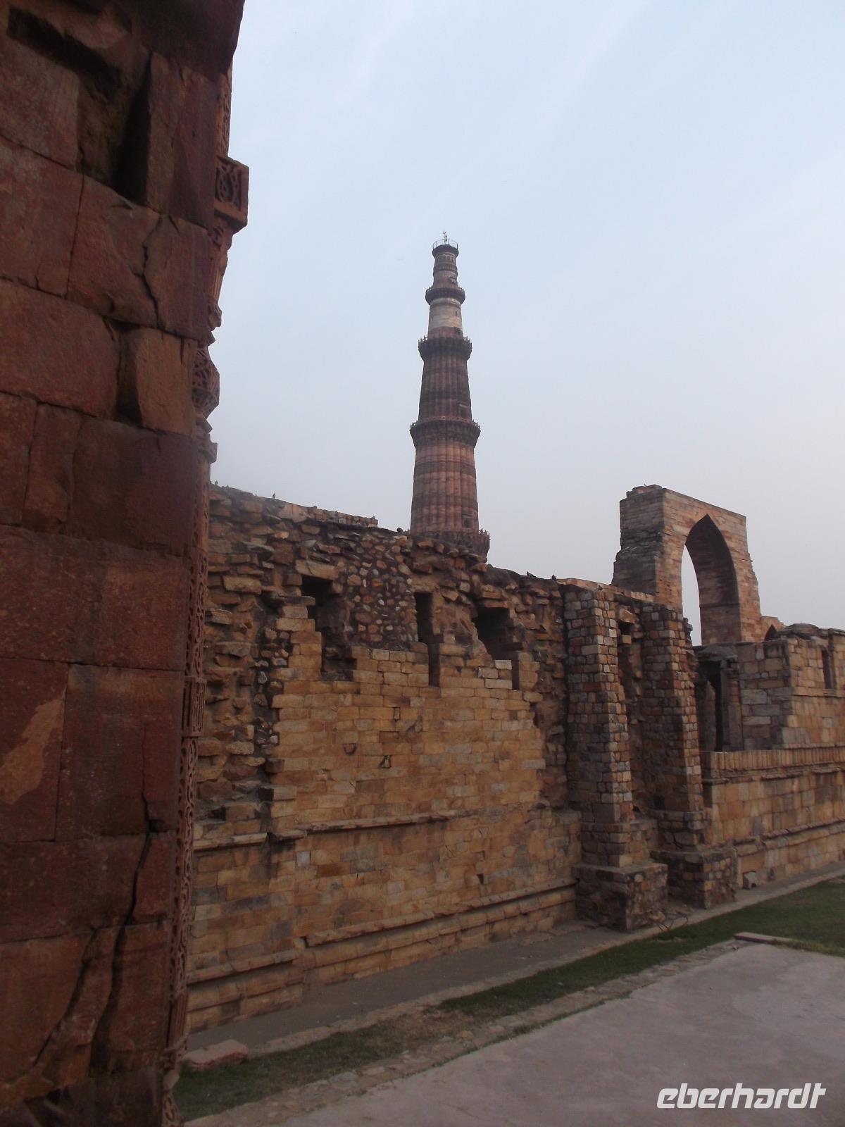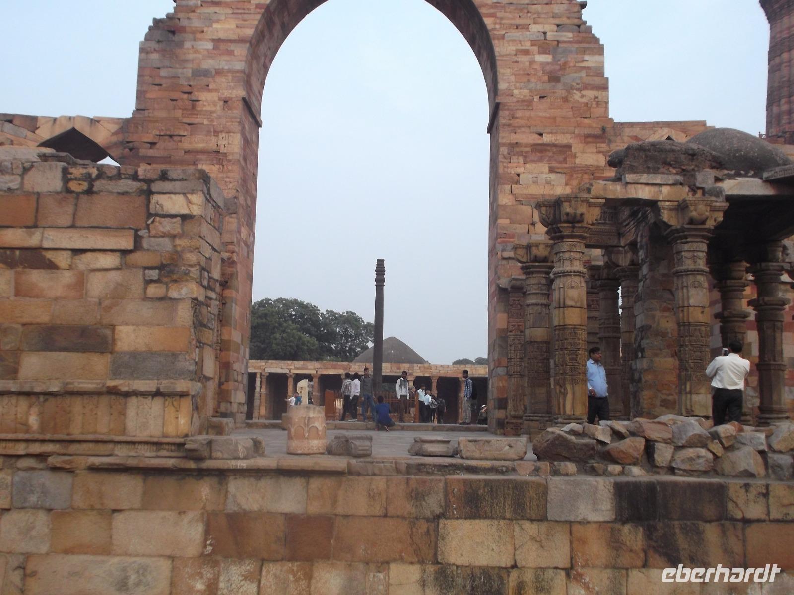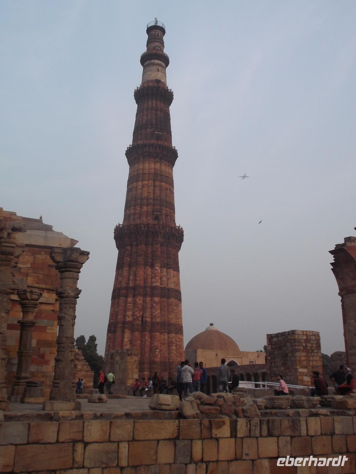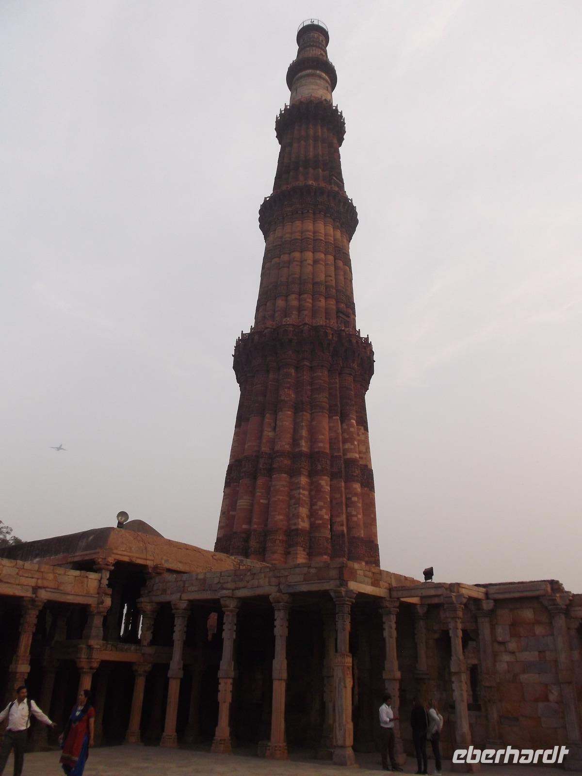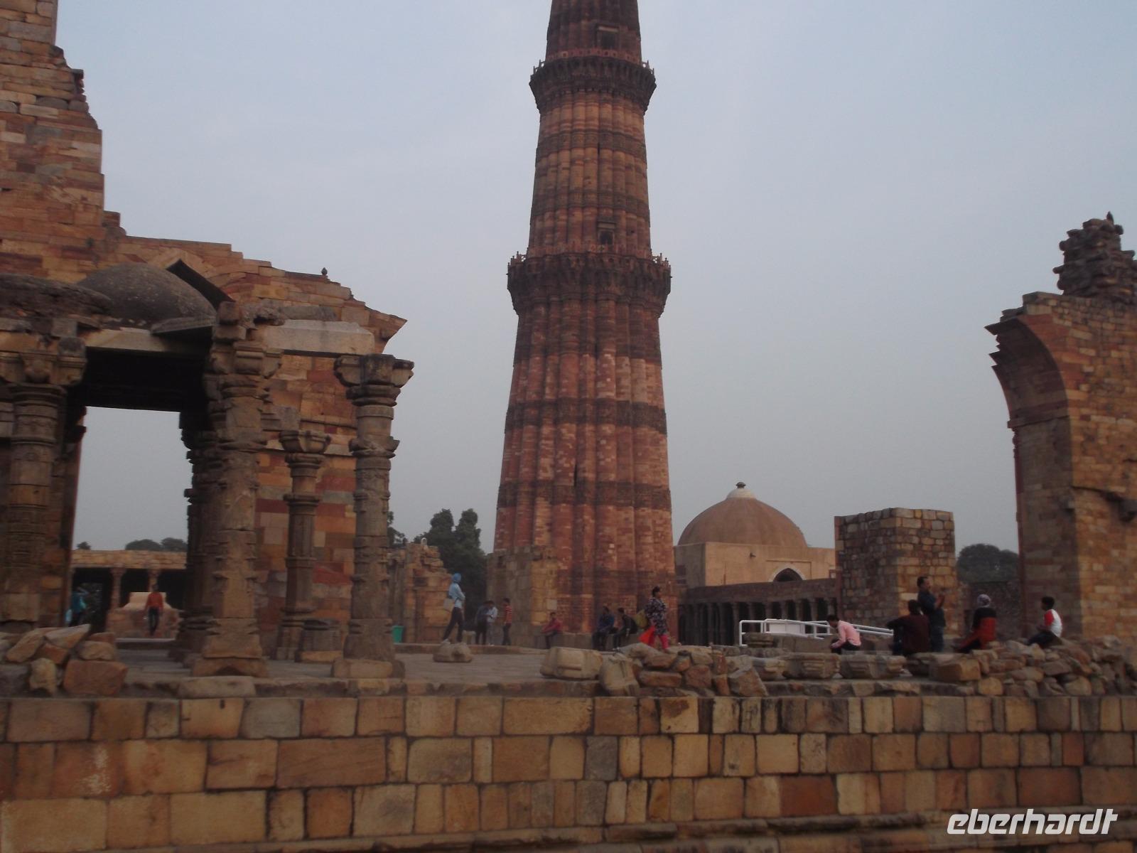 Eine weitere Besichtigung, bevor recht früh der nahe Sonnenuntergang die Lichtverhältnisse änderte, hatten wir dann noch am Qutb Minar, dem Minarett einer der ältesten Moscheen in Indien. Das 72 m hohe Bauwerk, lange Zeit das höchste in ganz Asien, wurde als Minarett, Wach- und Siegesturm im 13. Jh. als Zentrum des Sultanats Delhi erbaut. Seit 1993 zählt der Turm zum UNESCO-Weltkulturerbe und gilt als eines der höchsten und schönsten Bauwerke der islamischen Frühzeit. Sein Farbwechsel aus verschieden bunten Sandsteinen ist bemerkenswert und bietet abhängig von der jeweiligen Beleuchtung eine regelrechte Show. Hier hatten wir Freizeit für Fotos - natürlich auch von der berühmten „nichtrostenden Eisensäule" im Hof des Qutb Minar.