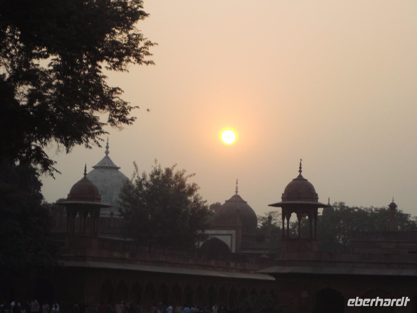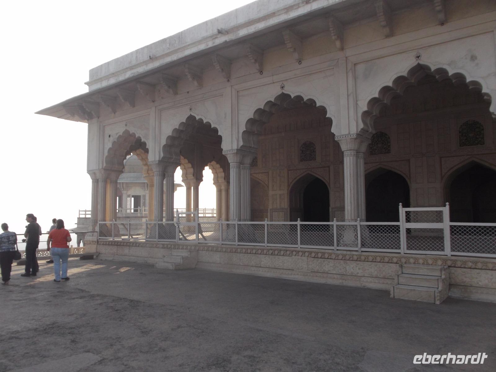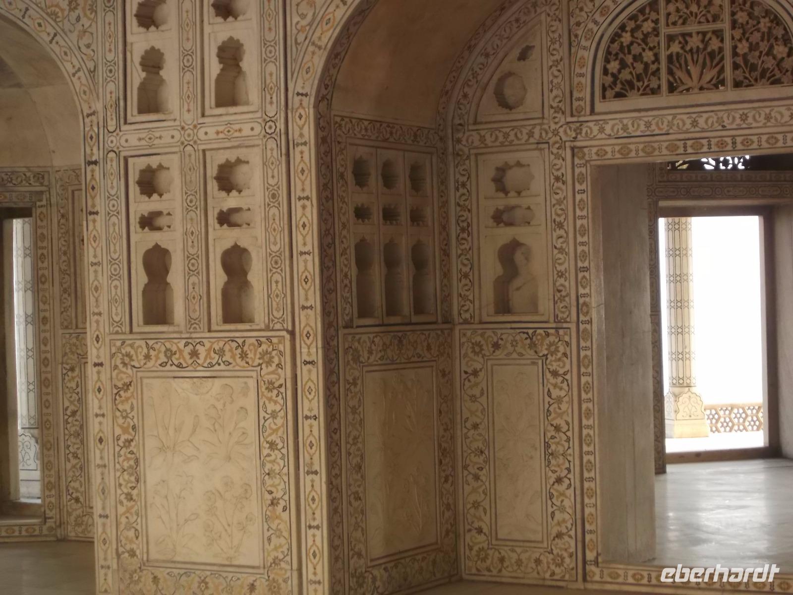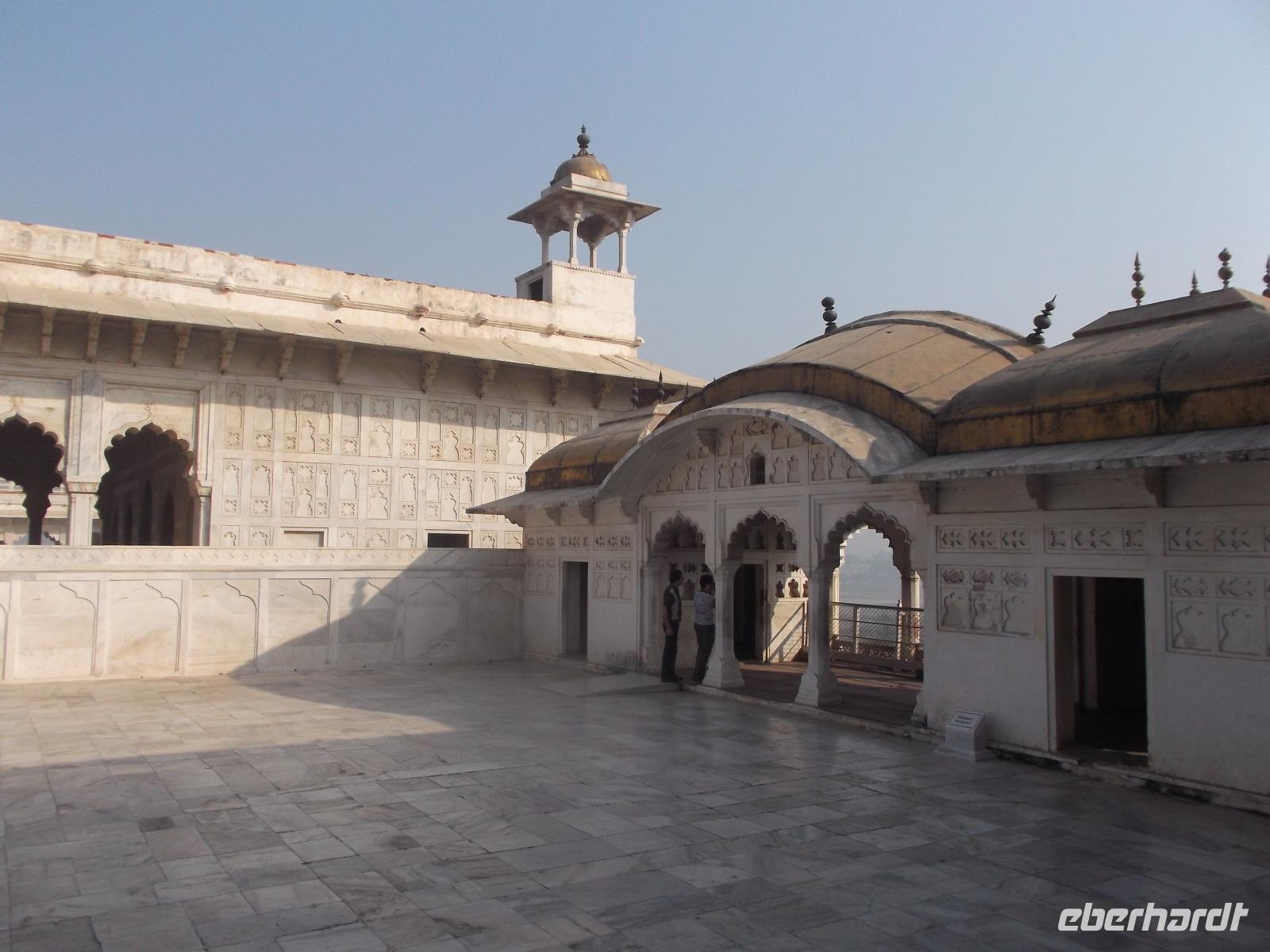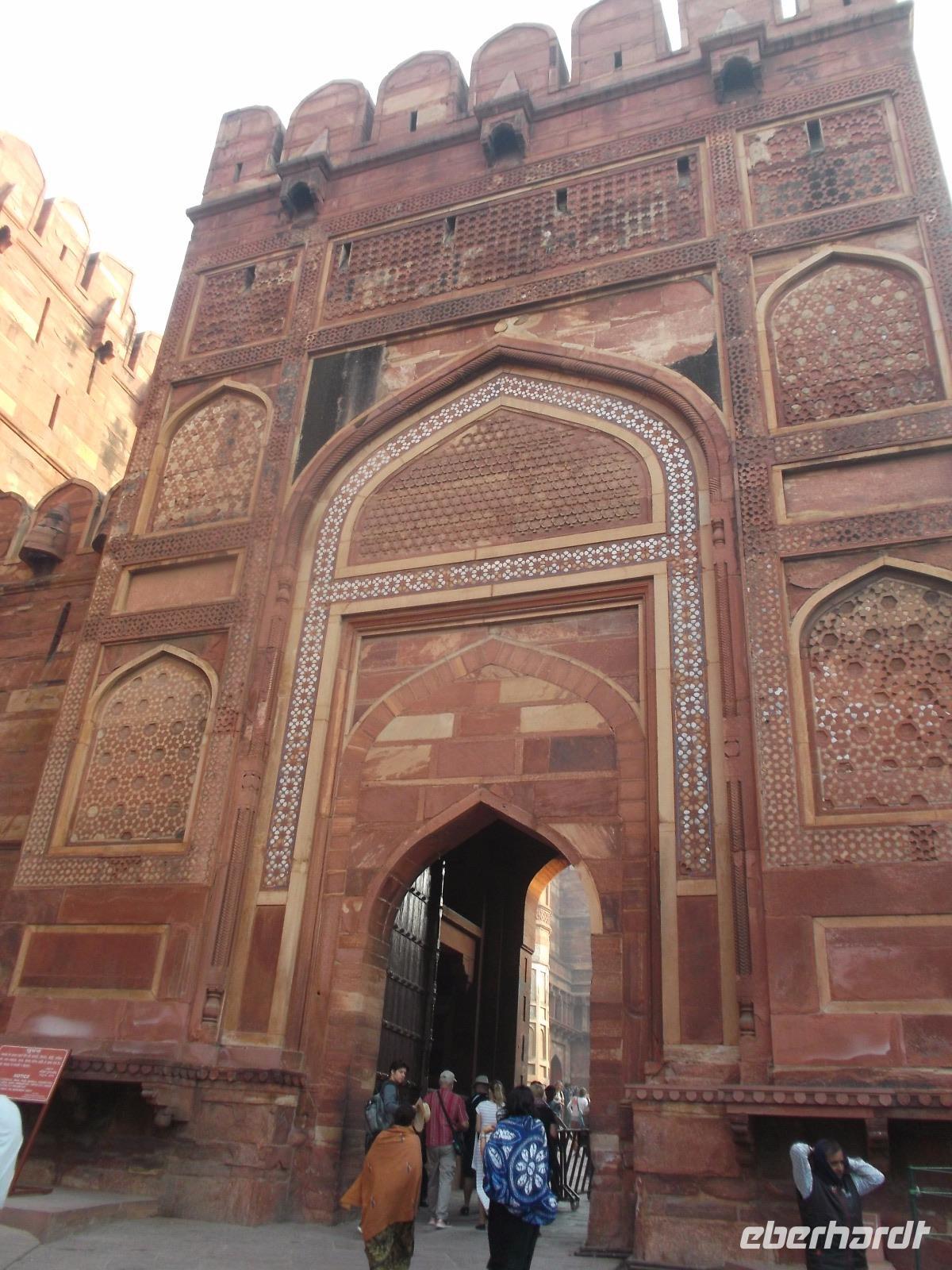 Mehrfach zur Zeit der Mogul-Kaiser war Agra Hauptstadt und ihre berühmte alte Festung, das „Rote Fort" - so genannt wegen dem roten Sandstein, aus dem man es erbaute - steht schon seit 1983 auf der UNESCO-Weltkulturerbe-Liste. Mehr als zwei Kilometer lang sind seine zusätzlich durch Wälle und Gräben gesicherten Umfassungsmauern. Damit hat der alte Mogul-Regierungssitz in etwa die Größe einer mittelgroßen Stadt im europäischen Mittelalter. Viele Teile des weitläufigen prächtigen Palastes zeugen noch von seiner einstigen Repräsentationsfunktion - z. B. gibt es hier noch eine äußere, öffentliche, und eine innere, private, Audienzhalle. Prachtvolle ehemalige Frauengemächer aus Marmor gruppieren sich um einen einst abgeschirmten Innenhof und neben den alten Palastbauten aus rotem oder teilweise mit poliertem Stuck überzogenem Sandstein bilden mehrere Höfe und Gärten, teilweise mit Wasserspielen, sehenswerte Attraktionen. Auch die großen marmornen Sänften ähnelnden Schlafgemächer, die zum Fluss Yamuna und dem auf der anderen Flusseite liegenden Grabmal Taj Mahal hinüberblicken, sahen wir - hier ließ der letzte der großen Mogulherrscher, Aurangzeb, seinen Vater Schah Jahan, der das Taj Mahal hatte erbauen lassen und den sein Sohn Aurangzeb entmachtet hatte, in den letzten acht Lebensjahren gefangenhalten.