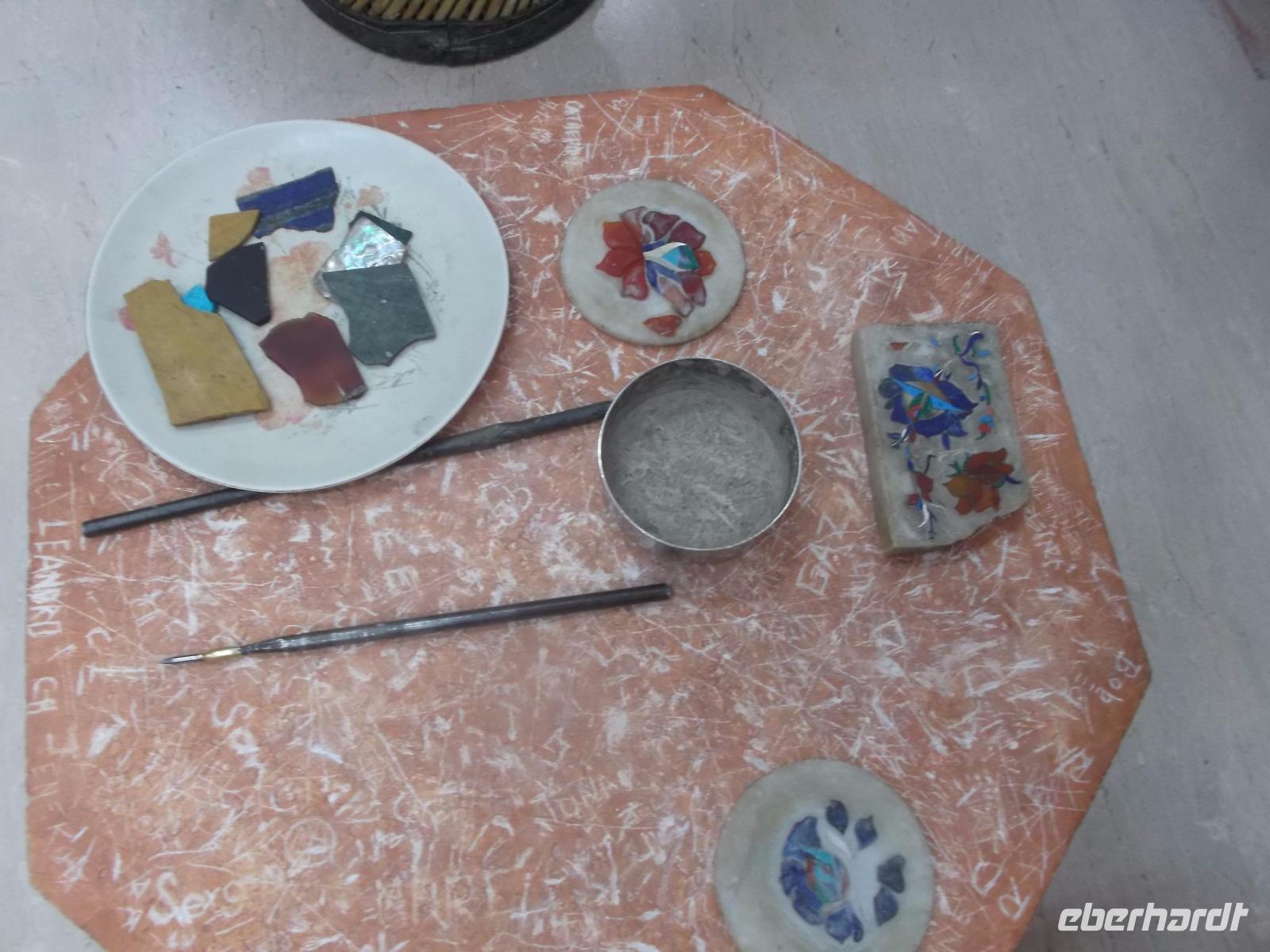 Nach Verlassen des wohl meistfotografierten Objektes in Indien erfuhren wir noch in einem traditionellen Handwerksbetrieb für Marmorintarsien und Stein-Einlegearbeiten, wie einst die Verzierungen des berühmten Gebäudes zustande kamen: Seit der Erbauungszeit sind die Familien der Künstler hier angesiedelt und bis heute bewahren sie ihre einzigartige Handwerkskunst und arbeiten von Hand wie einst am Taj Mahal.