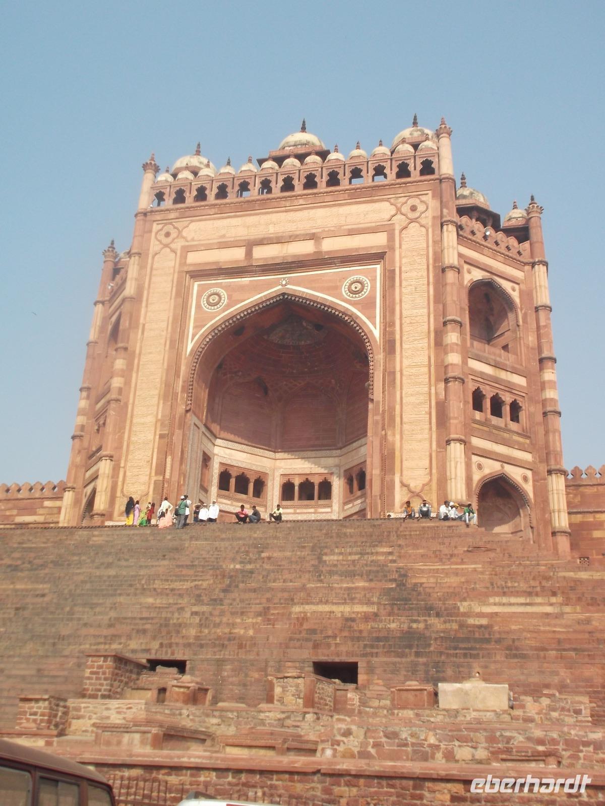 Später gab er diesen Standort aber auf - wohl wegen Wassermangels. Heute muss man den Umweltschutz beachten und so gelangt man nur noch per Elektro-Shuttlebus in die alte Stadt. Unseren Rundgang im historischen Gelände begannen wir am religiösen Bezirk von Fathepur Sikri, der als spektakulären Zugang Indiens höchstes je gebautes Eingangstor zeigt. Imposant erhebt sich das als Buland Darwaza - „Siegestor" - bezeichnete Bauwerk, gewidmet dem Sieg Akhbars über Gujrat und erbaut im 16., Jh. mit seiner 32stufigen Treppe 54 m hoch vor dem Moscheenbezirk.
