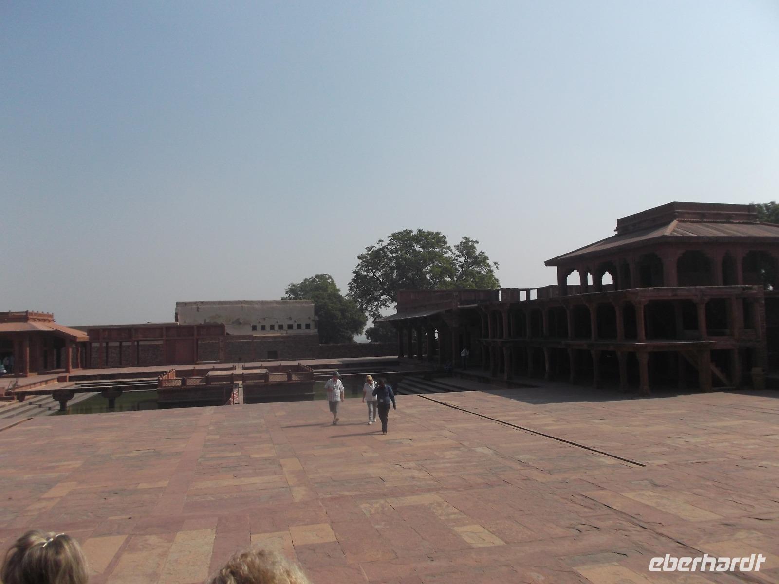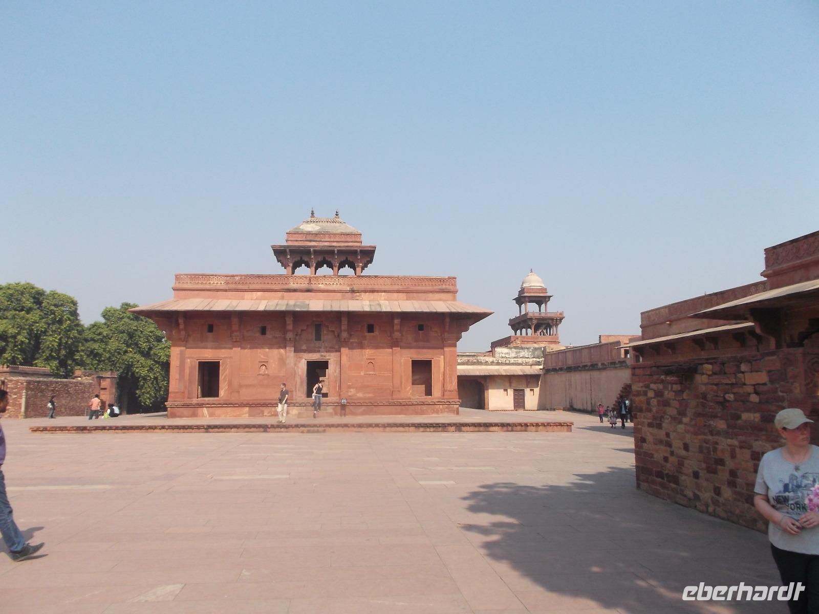 Interessant ist hier auch das sogenannte „Schatzhaus" des Herrschers mit seinen dicken Wänden voller Hohlräume für die Aufbewahrung von Kostbarkeiten und den ehemaligen privaten Beratungs- und Audienzpalast des Großmugul. Hier gibt es die reich verzierte sogenannte „Säule der Religionen", die eines der vermutlich interessantesten, aber auch bekanntesten und berühmtesten Details der „Geisterstadt" Fathepur darstellt. Ihre Verzierungen aus wundervoll in Sandstein ausgeführten Kerbschnitzereien enthalten in vielfältigen Muster einen Zusammenschnitt von Motiven aus verschiedenen Religionen und sind so auch ein gelungenes Zeugnis für die damals an Akhbars eigentlich grundsätzlich muslimischem Hof gelebte religiöse Toleranz.