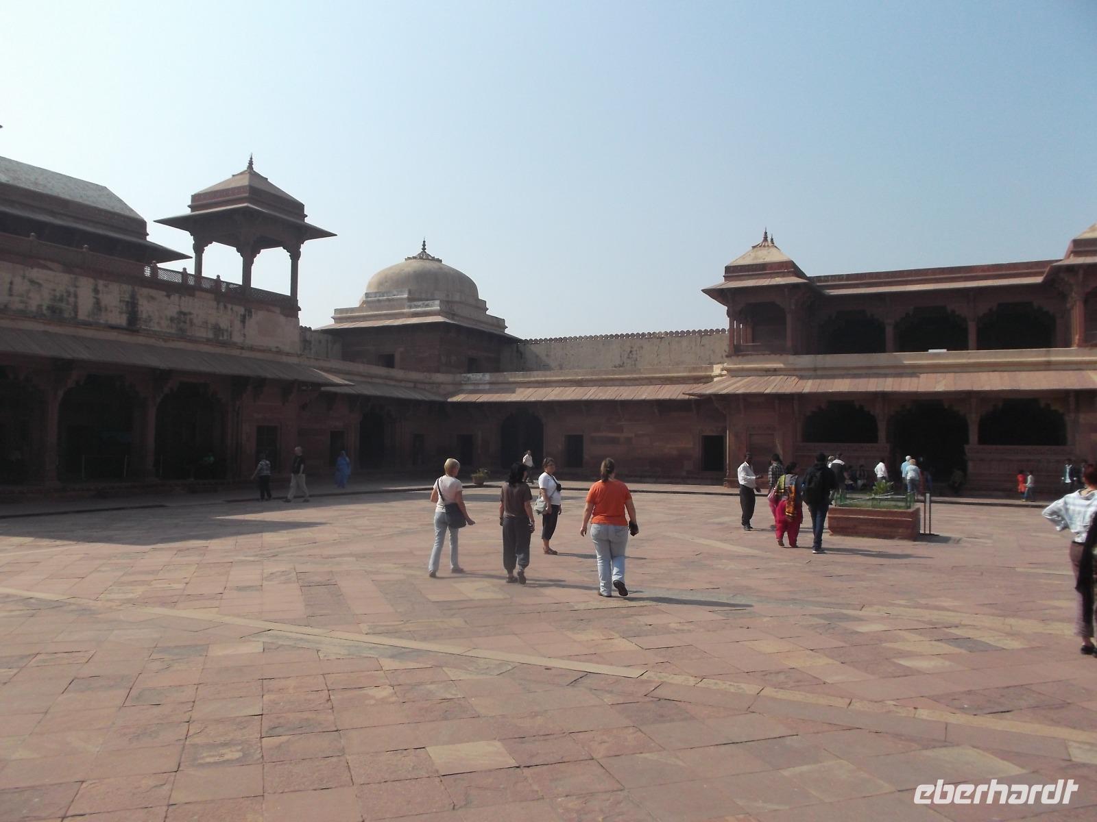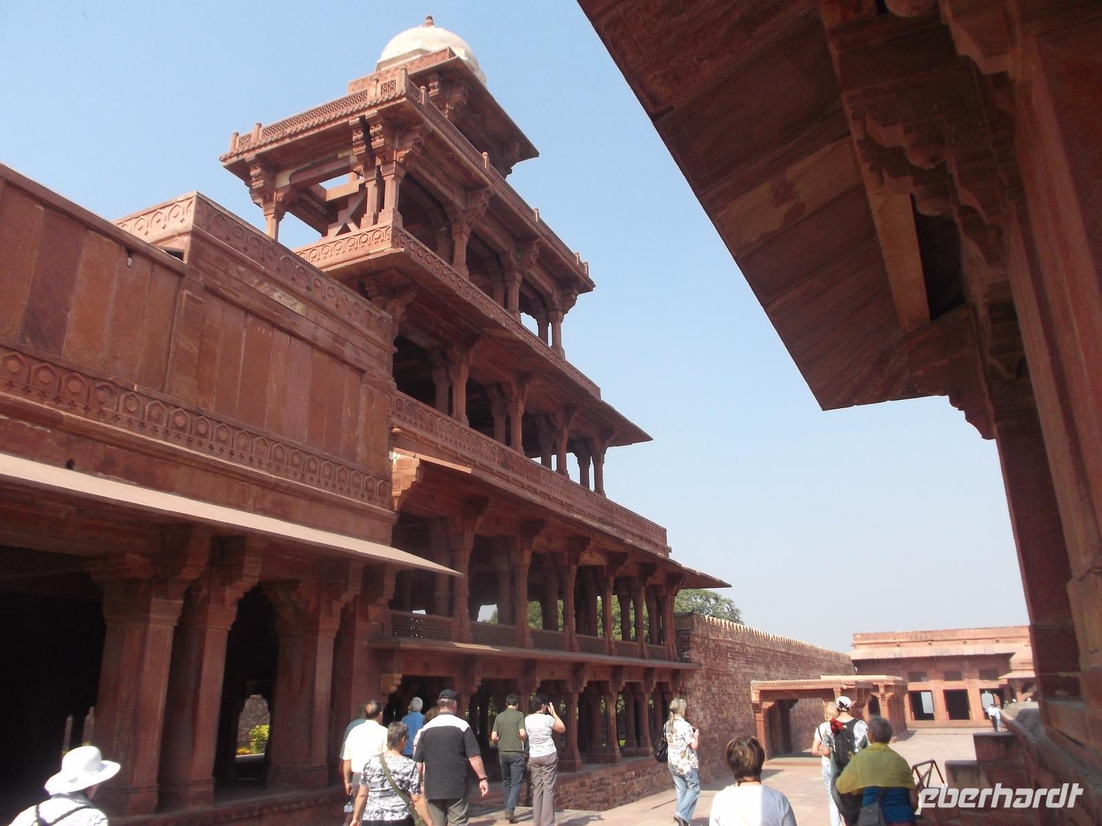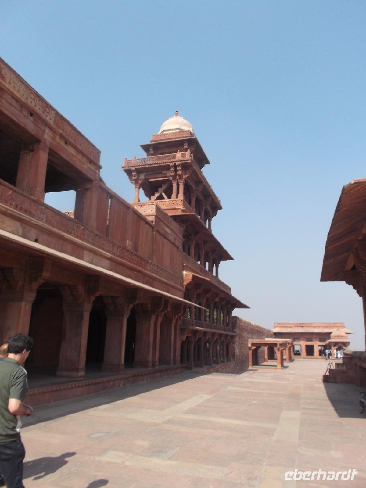 Von hier aus marschierten wir zu Mogul Akhbars ehemalige Hauptstadt, die wir in Höhe der ehemaligen Haremsgemächer betraten. Beherrscht wird deren um große Innenhöfe gruppierter Komplex vom „Palast der Jodhabai" der mit verzierten Balkonen und Dachpavillions die die für Rajasthan so typische Mischung traditionell hinduistischer mit traditionell muslimischen Stilelemente aufweist. Da die Frauen den Palastbezirk nicht verlassen und sich auch Fremden nicht zeigen durften, kamen Händler unter strenger Bewachung in die Höfe und breiteten ihre Waren aus, die die Haremsdamen dann vom sichtgeschützten Balkon aus betrachteten. Gefiel etwas, mussten Dienerinnen die interessantesten Dinfge zur besseren Begutachtung nach oben bringen ... Die bis heute nie zerstörten und gut erhaltenen Anlagen von Fatehpur Sikri lassen die Besucher in gewisser Weise teilhaben an der Geschichte und lassen die traditionelle Lebensweise bei Hofe recht anschaulich erahnen. Der Bereich der Audienzhalle erhebt sich dann in die Höhe des einstigen luftigen „Windpalastes", der sich nach oben verjüngt und auch „Panch Mahal" (fünfstöckiger Palast) genannt und von 176 Säulen getragen wird. Das leicht wirkende Bauwerk ist geeignet für die heißen Sommer in Fatehpur und blickt zum „Vergnügungshof" und den Palästen von Akhbars Frauen.