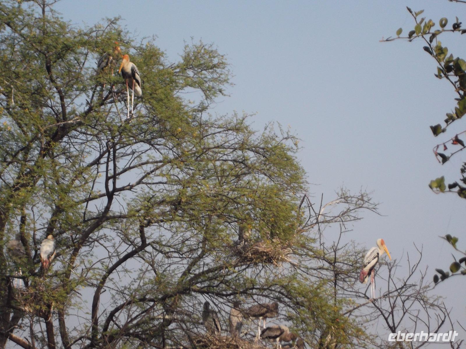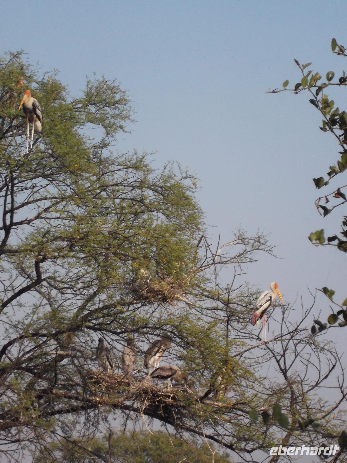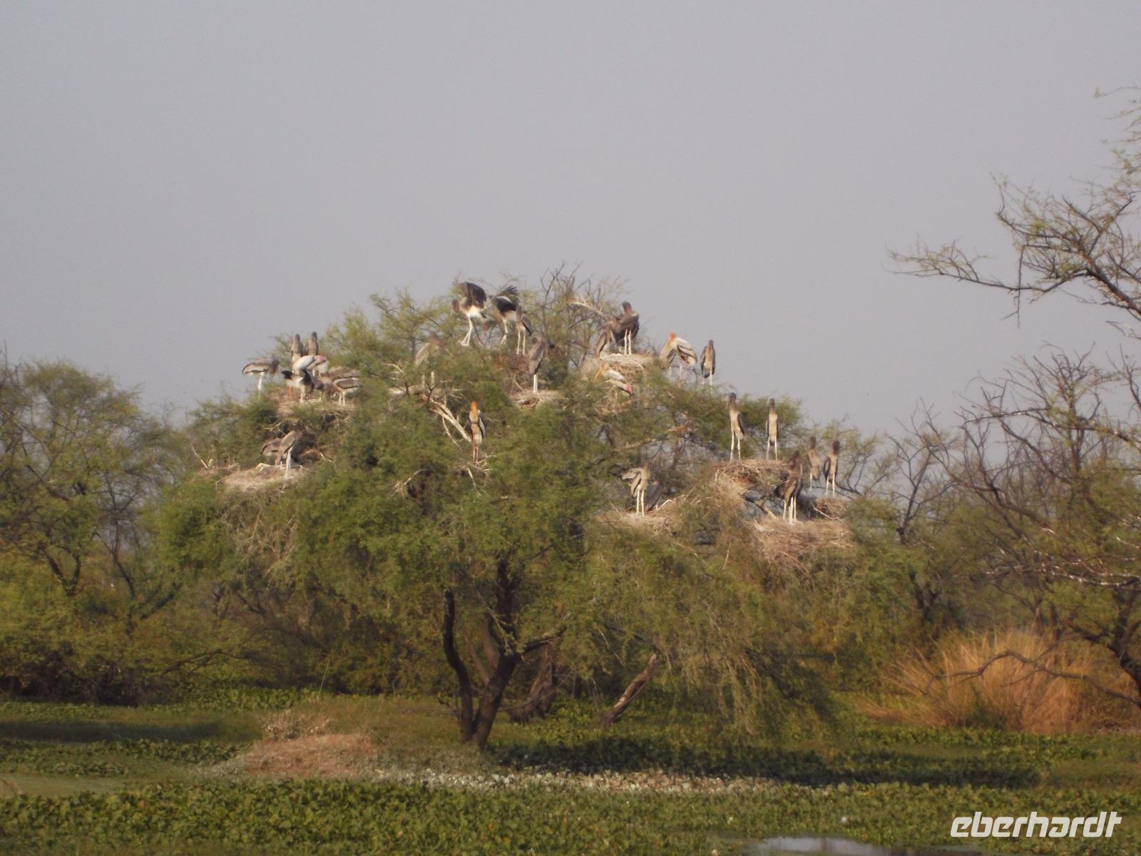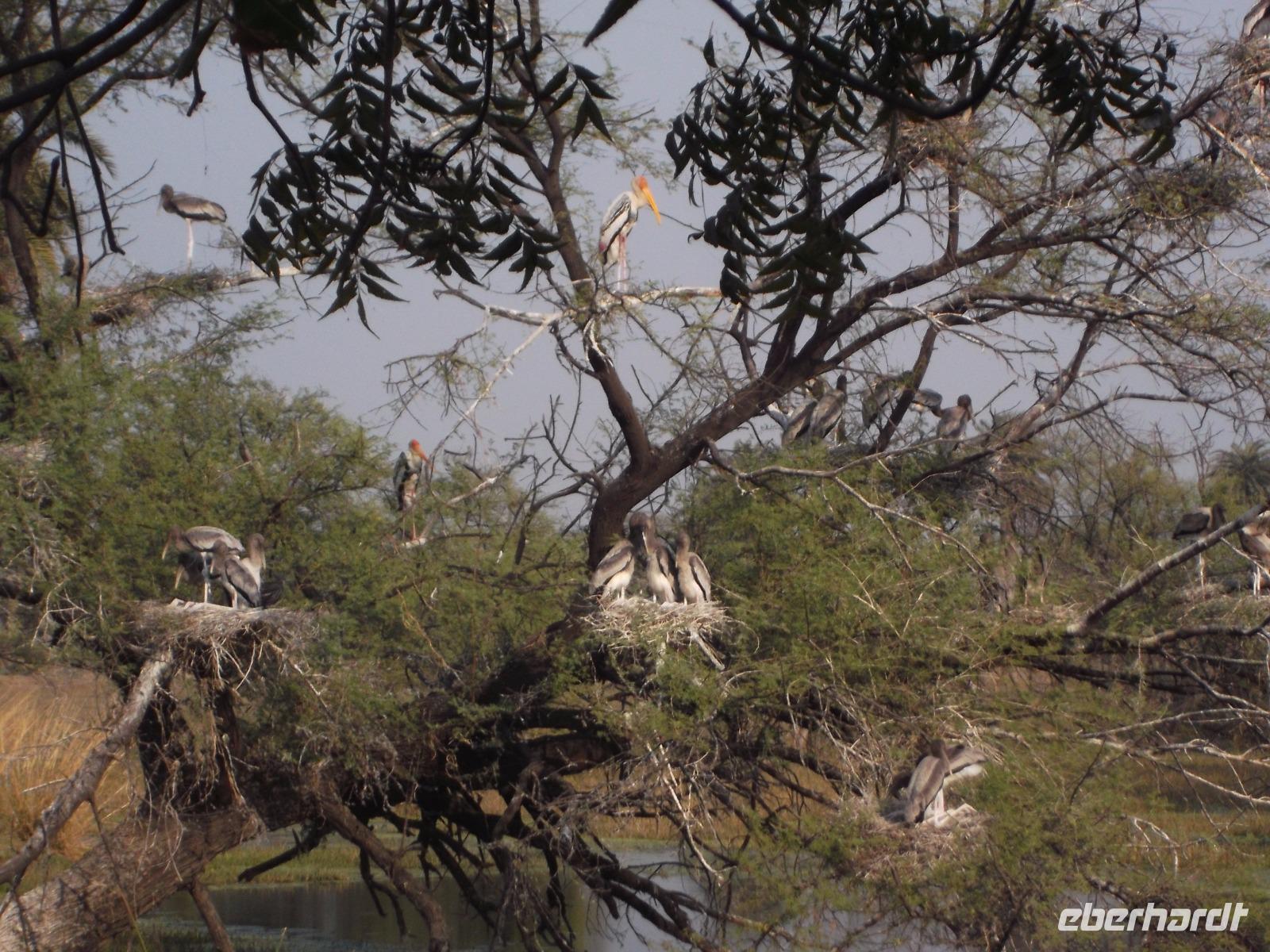 Nach dem Besuch von Fatehpur Sikri gab es unterwegs ein Mittagessen, bevor wir uns dem Keoladeo-Nationalpark, Indiens kleinstem NP, widmeten. Der überwiegend aus Sumpfland bestehende nur etwa 29 km² große Park ist vor allem im November attraktiv. Dann nisten hier hunderttausende Vögel hunderter verschiedener Arten. Besonders bekannt ist der Park, den wir während einer etwa zweistündigen Rikschah-Safari etwas näher kennenlernten, vor allem für seine Buntstörche. Fotos unglaublich dicht von den großen Vögeln bevölkerter Bäume konnten wir hier machen und dem unaufhörlichen Geklappers tausender Vogelschnäbel lauschen.