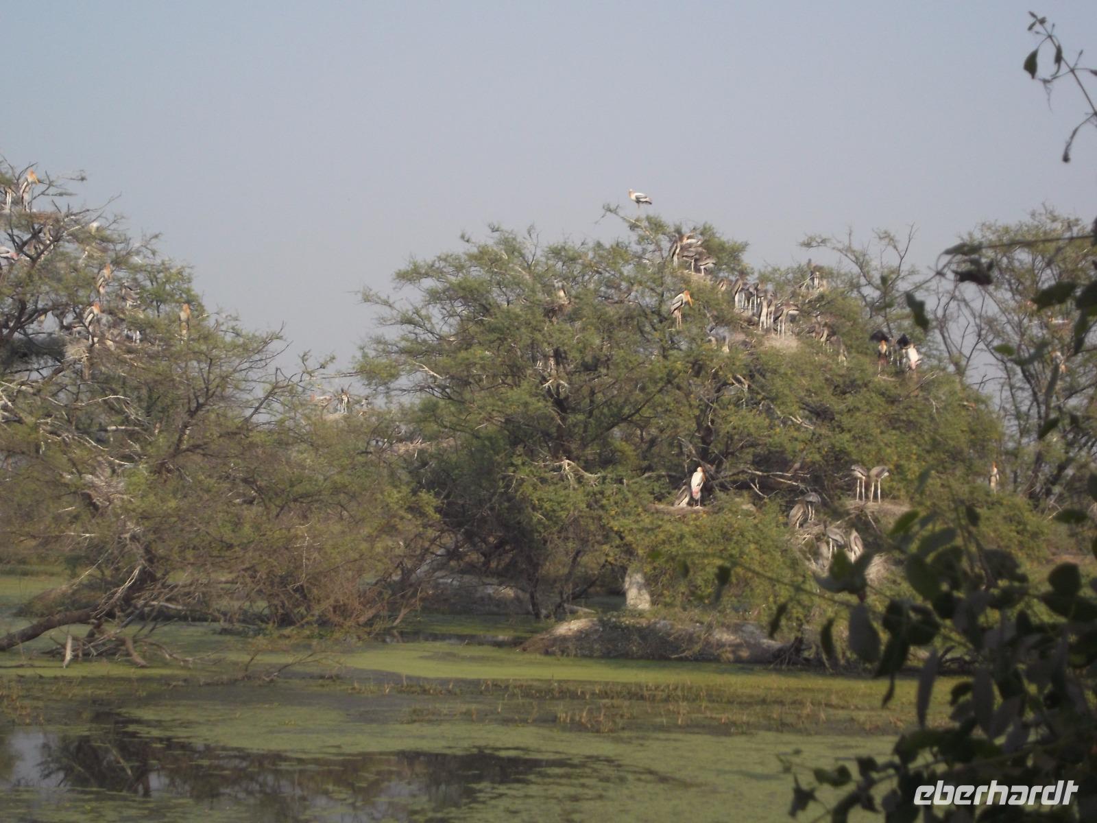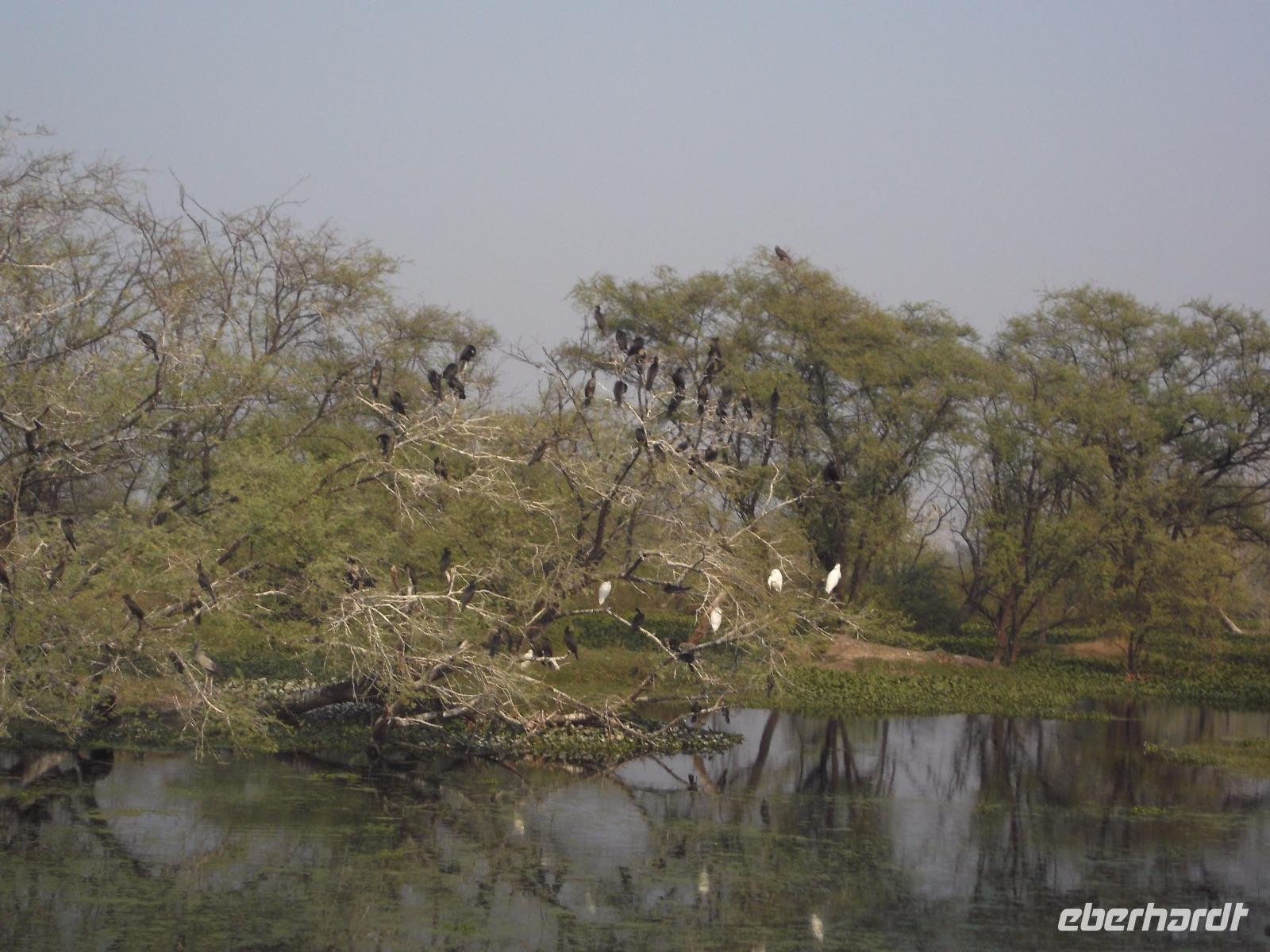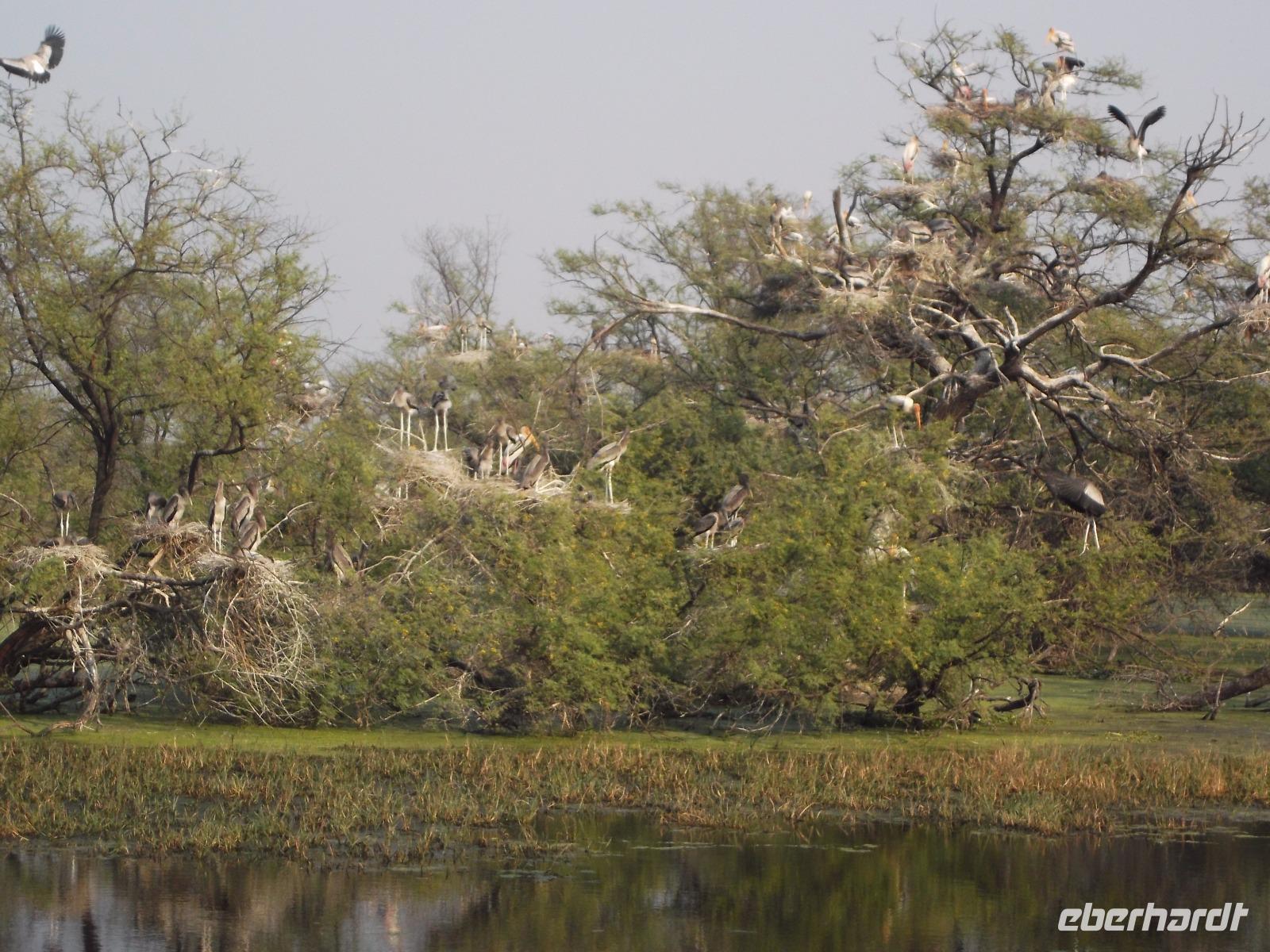 Nach dem Besuch von Fatehpur Sikri gab es unterwegs ein Mittagessen, bevor wir uns dem Keoladeo-Nationalpark, Indiens kleinstem NP, widmeten. Der überwiegend aus Sumpfland bestehende nur etwa 29 km² große Park ist vor allem im November attraktiv. Dann nisten hier hunderttausende Vögel hunderter verschiedener Arten. Besonders bekannt ist der Park, den wir während einer etwa zweistündigen Rikschah-Safari etwas näher kennenlernten, vor allem für seine Buntstörche. Fotos unglaublich dicht von den großen Vögeln bevölkerter Bäume konnten wir hier machen und dem unaufhörlichen Geklappers tausender Vogelschnäbel lauschen.