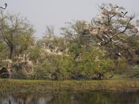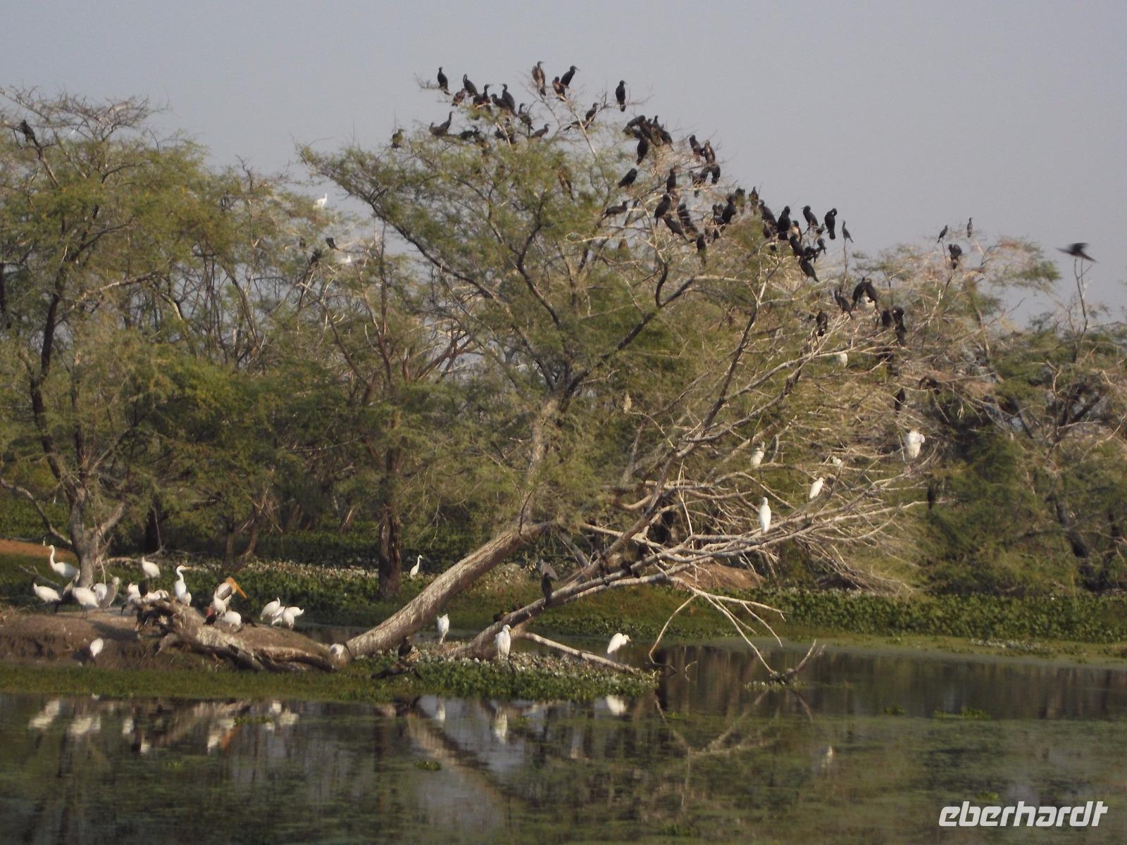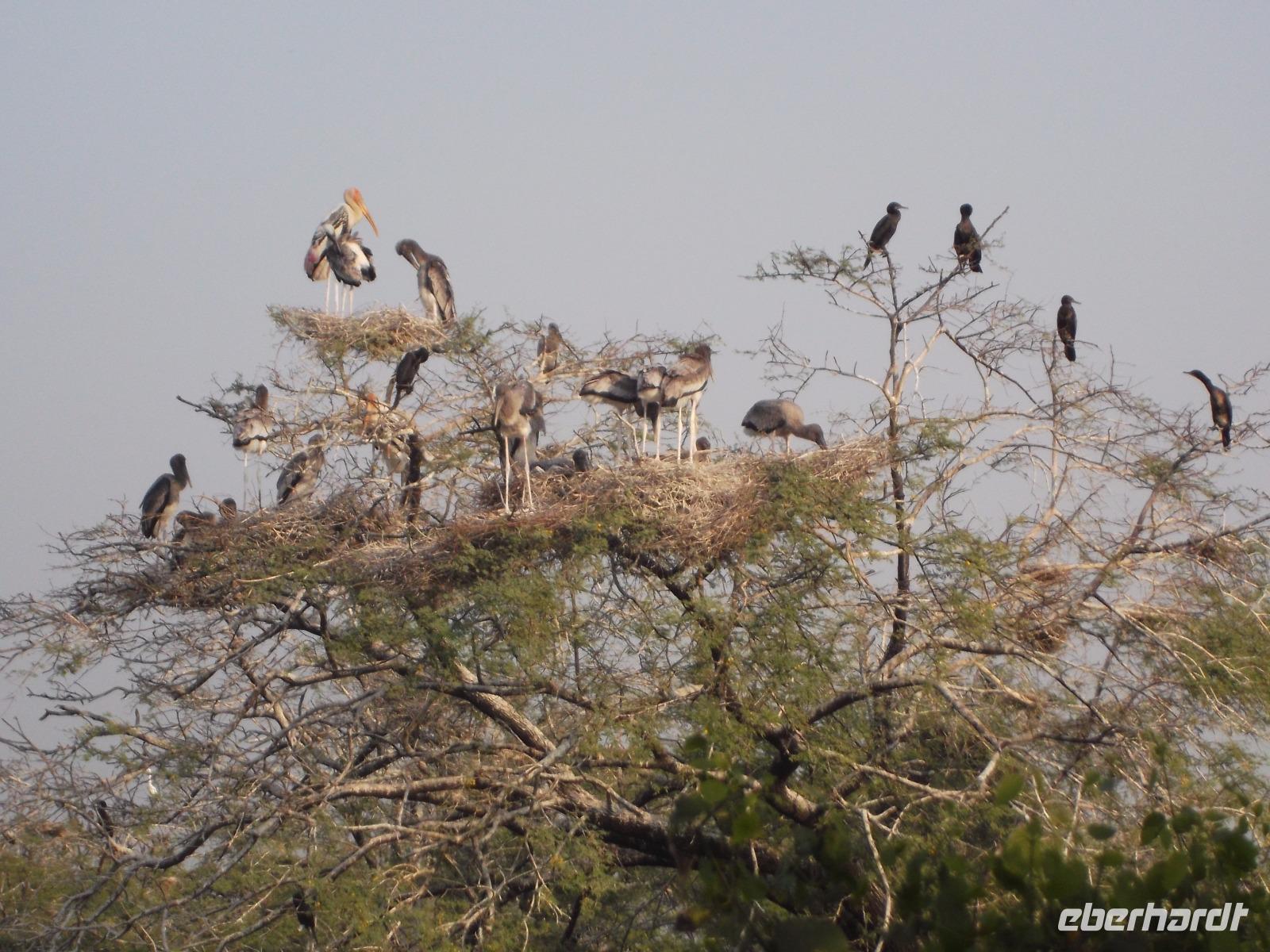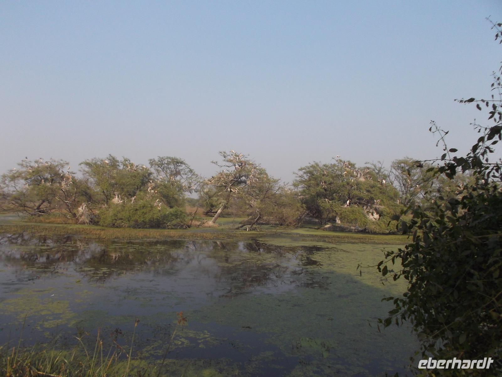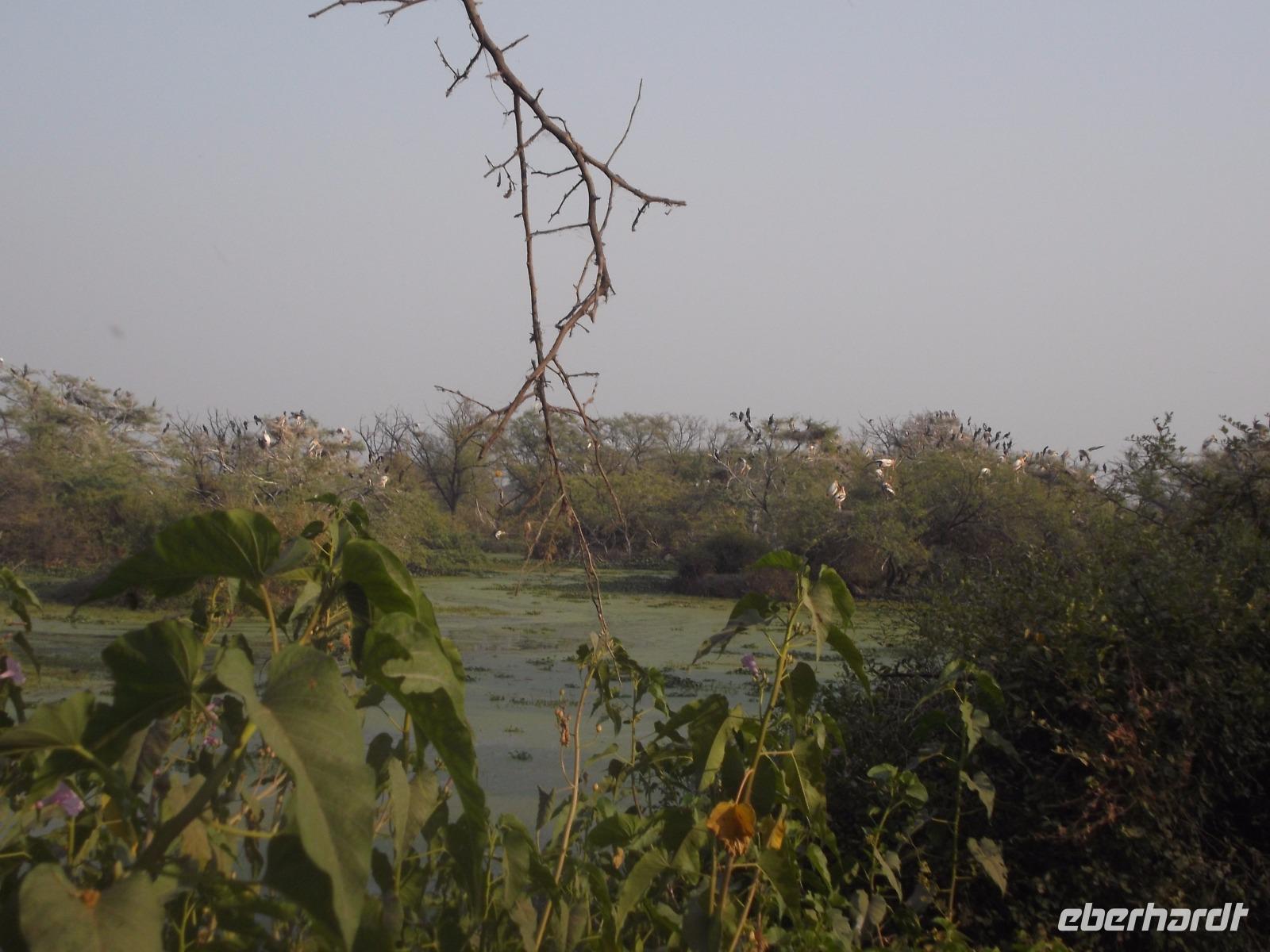 Nach dem Besuch von Fatehpur Sikri gab es unterwegs ein Mittagessen, bevor wir uns dem Keoladeo-Nationalpark, Indiens kleinstem NP, widmeten. Der überwiegend aus Sumpfland bestehende nur etwa 29 km² große Park ist vor allem im November attraktiv. Dann nisten hier hunderttausende Vögel hunderter verschiedener Arten. Besonders bekannt ist der Park, den wir während einer etwa zweistündigen Rikschah-Safari etwas näher kennenlernten, vor allem für seine Buntstörche. Fotos unglaublich dicht von den großen Vögeln bevölkerter Bäume konnten wir hier machen und dem unaufhörlichen Geklappers tausender Vogelschnäbel lauschen.