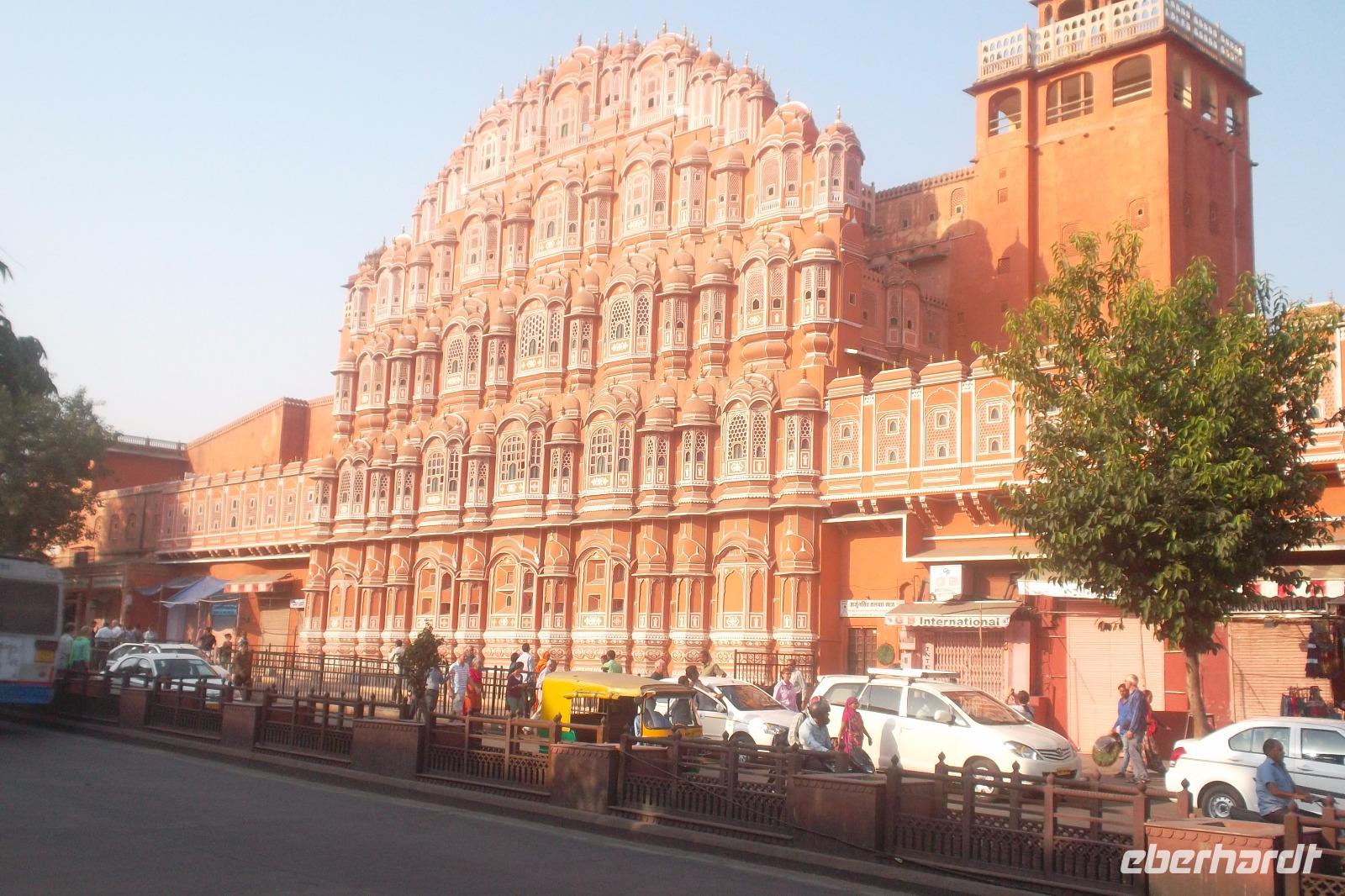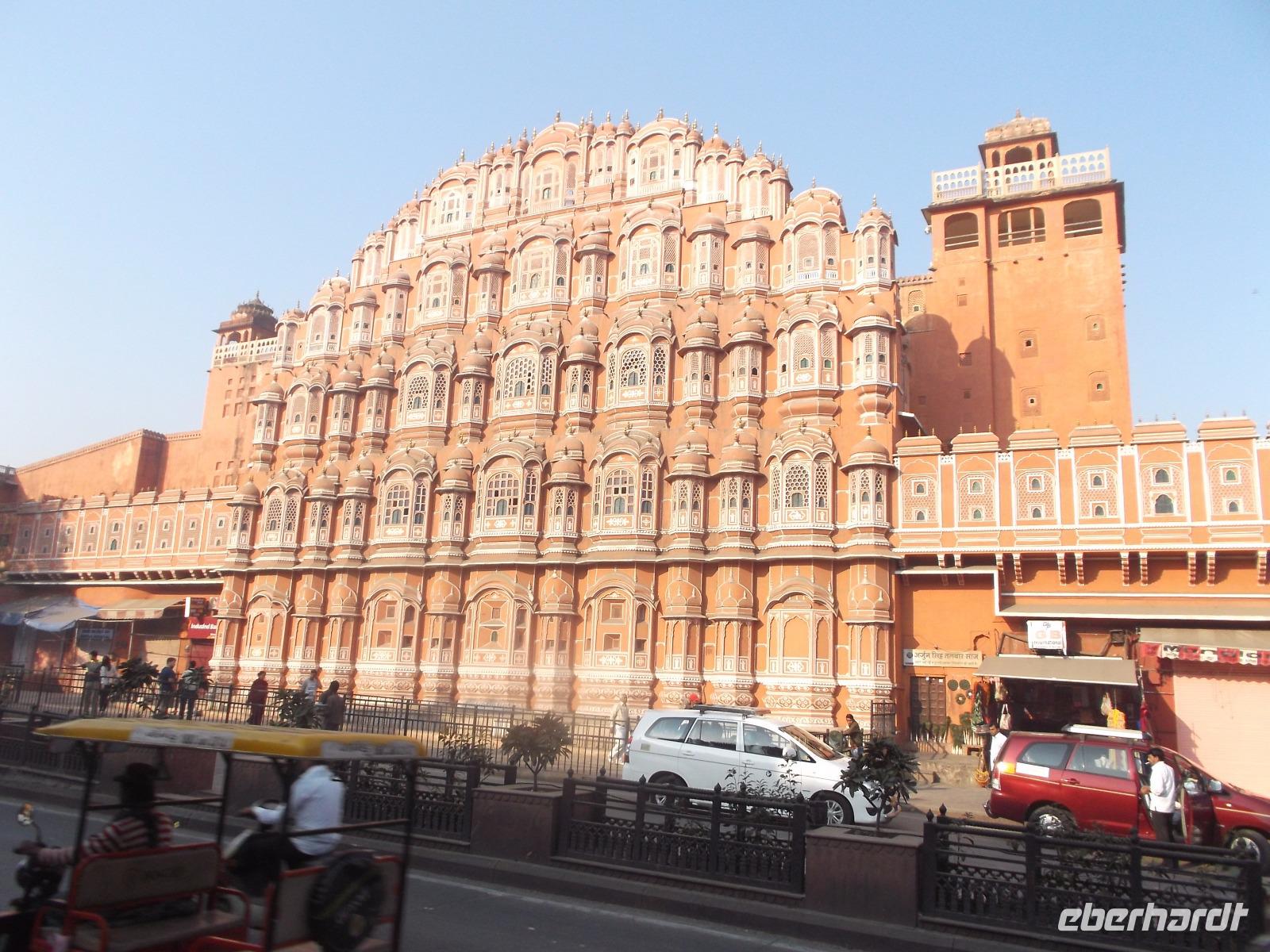 Etwas außerhalb der heutigen Metropole Jaipur liegt der ursprüngliche historische Regierungssitz, das Amber Fort. Auf dem Weg dorthin legten wir zunächst einmal einen Fotostopp ein an Jaipurs vielleicht bekanntestem und fotogensten Bauwerk - dem berühmten Hawa Mahal, dem „Palast der Winde". Bekannt und reizvoll ist dies eigentlich nur eine zum Stadtschloß-Komplex gehörende Straßenfassade. Malerisch und kunstvoll aus rotem Sandstein gearbeitet, weist sie hunderte Fenster auf, die einst den Damen des Herrscherhofes von Jaipur die Möglichkeit gab, neugierigen Blicken verborgen durch die Fensterblenden zu verfolgen, was auf der Straße vor sich ging. Dafür sorgten die Fensterläden, dünne. kunstvoll durchbrochene steinerne Platten, die Sicht von innen nach außen ermöglichten, aber als Sichtblenden vor Hineinsehen schützten. Die Hawa Mahal-Fassade fehlt in kaum einem indischen Reiseführer.