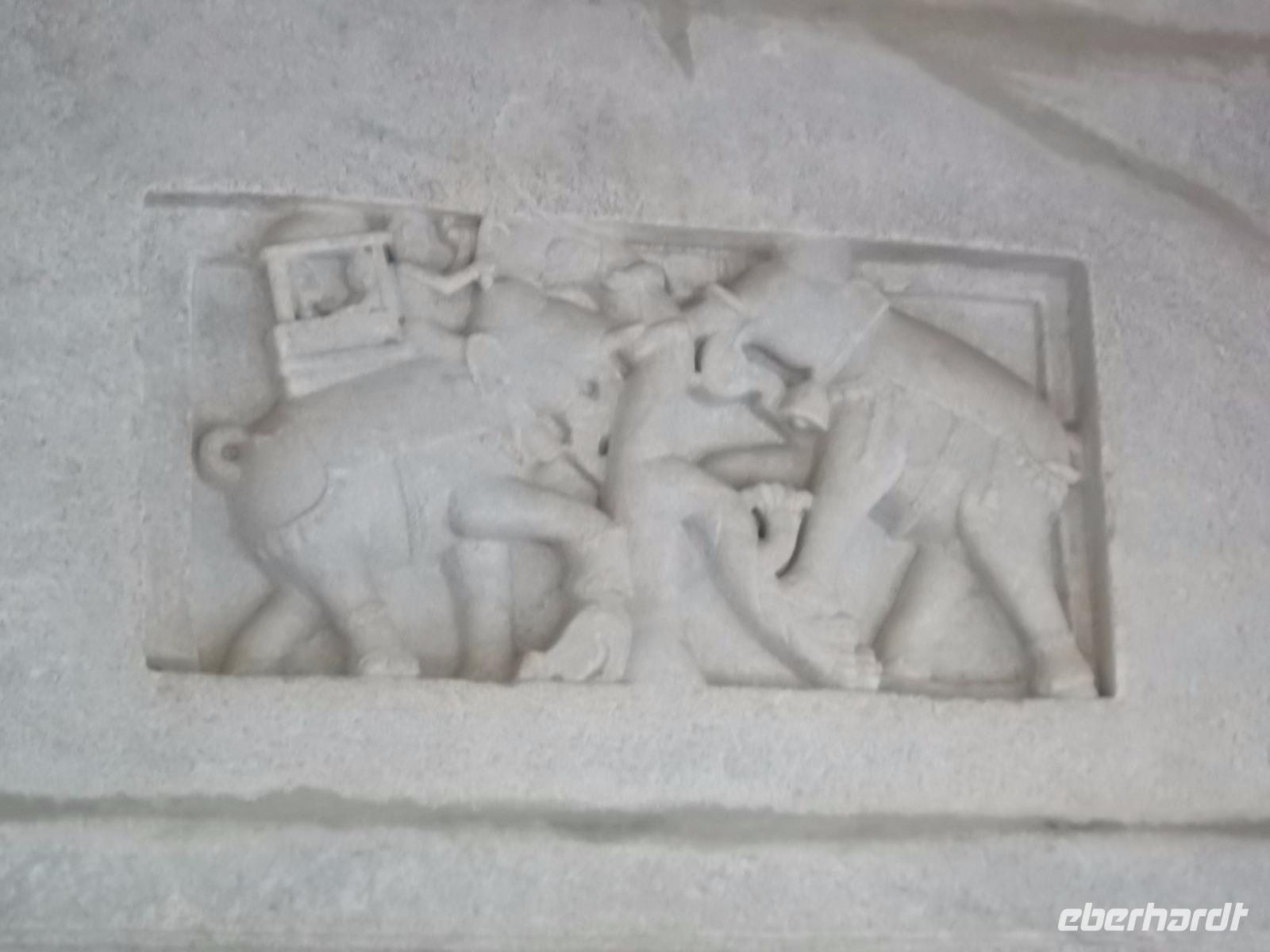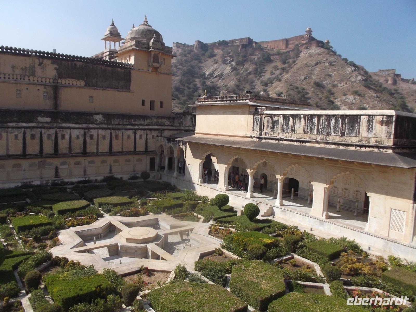 Unser erstes Abenteuer hier war ein Elefantenritt von der „Talstation" den Burgberg hinauf. Ganz in Tradition der Maharadschas sitzen heute die Touristen auf der Plattform auf dem Rücken der buntgeschmückten Elefanten und überwinden so ohne eigene Anstrengung den Höhenunterschied des steilen Burgbergs. Diese Beförderung auf dem Elefantenrücken ist für viele Gäste etwas ganz Besonderes, und auch in unserer Gruppe genossen wir die Schaukelei ein paar Minuten hinauf bis zum ersten großen Vorhof des Amber-Palastes. Die bunten Außenfassade des Amber Forts wirkt schon wie ein Kunstwerk, aber wenn man die Treppe zum zweiten Vorplatz überwunden hat, dann beeindrucken die bemalte Fassade des inneren Palastes sowie die gewaltige ehemalige Audienzhalle ganz aus Marmor. Als wir dann den inneren Palast betraten, konnten wir gleich noch die private Audienzhalle bewundern, deren Wände mit tausenden geschickt eingesetzten Spiegelscherben verziert sind. Im Palastinneren stößt man überall auf. Verzierungen durch Intarsien und Malerei sowie die historischen Kühlanlagen, die so ähnlich bis heute in indischen Bauten verwendet werden. Im Sommer hielten sie die Temperaturen im Palast auch bei größter Hitze erträglich, in dem kaltes fließendes Wasser geschickt eingesetzt durch die Kühlkanale rann und auch Tücher, Vorhänge und dünne, Teppiche benetzte, die zudem von Dienern mittels Seilzügen früher fächelnd bewegt wurden, was kühlenden Luftzug erzeugte.