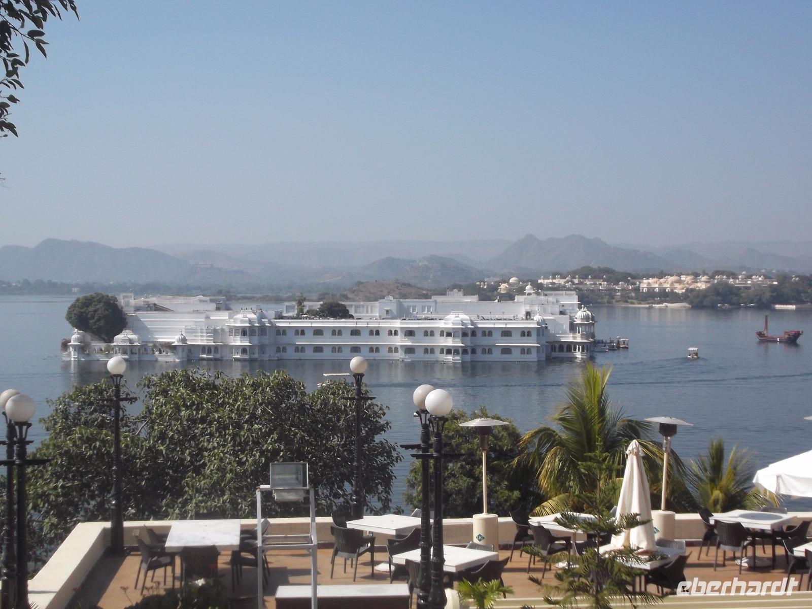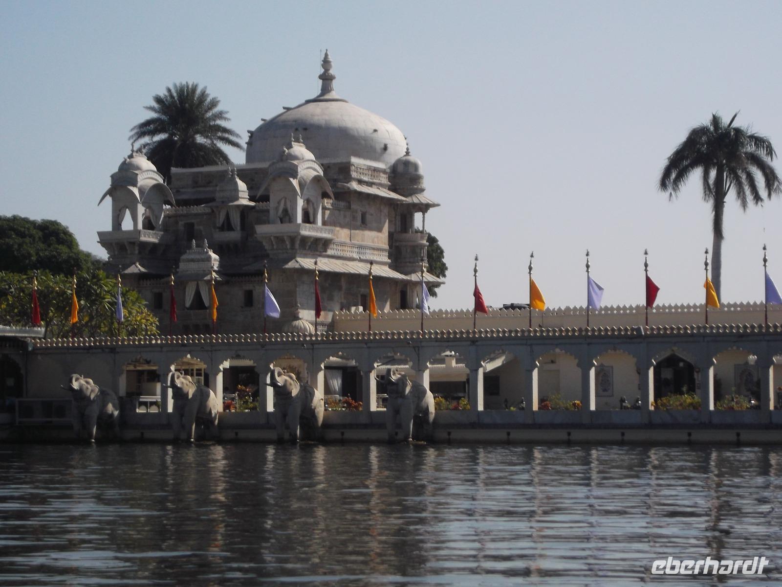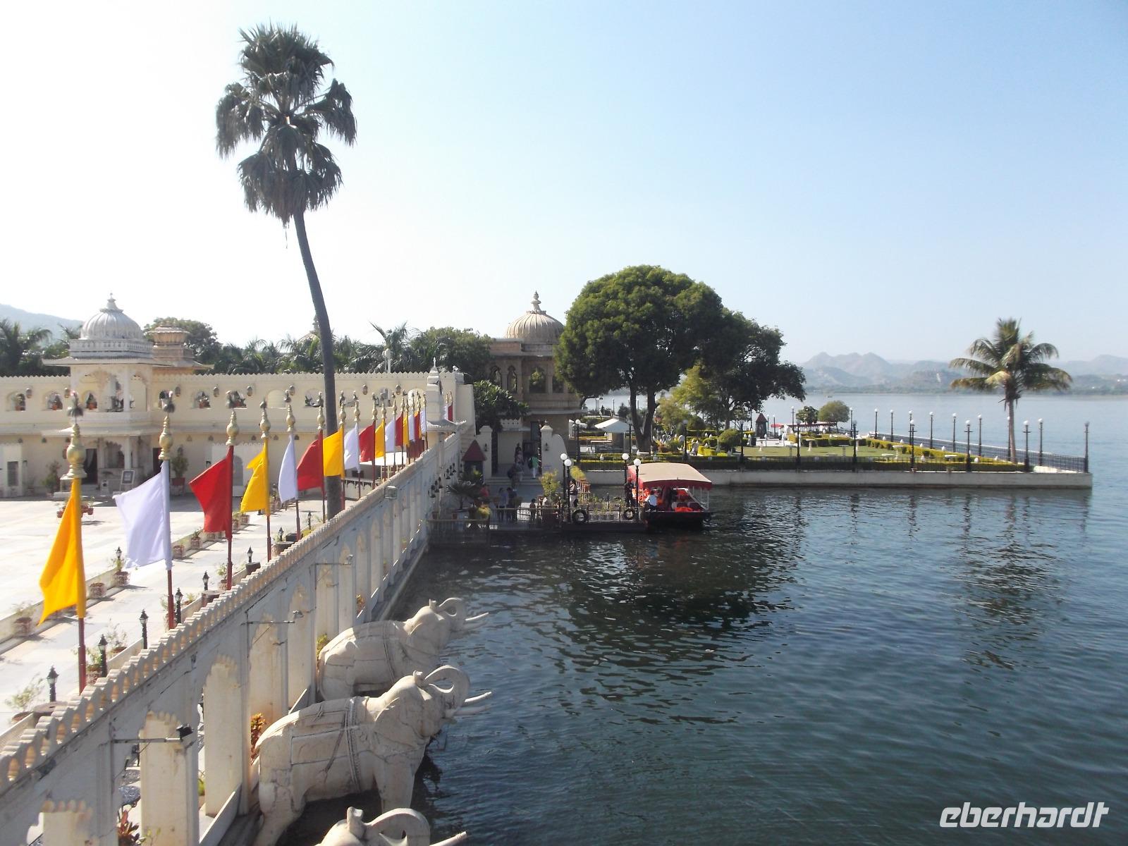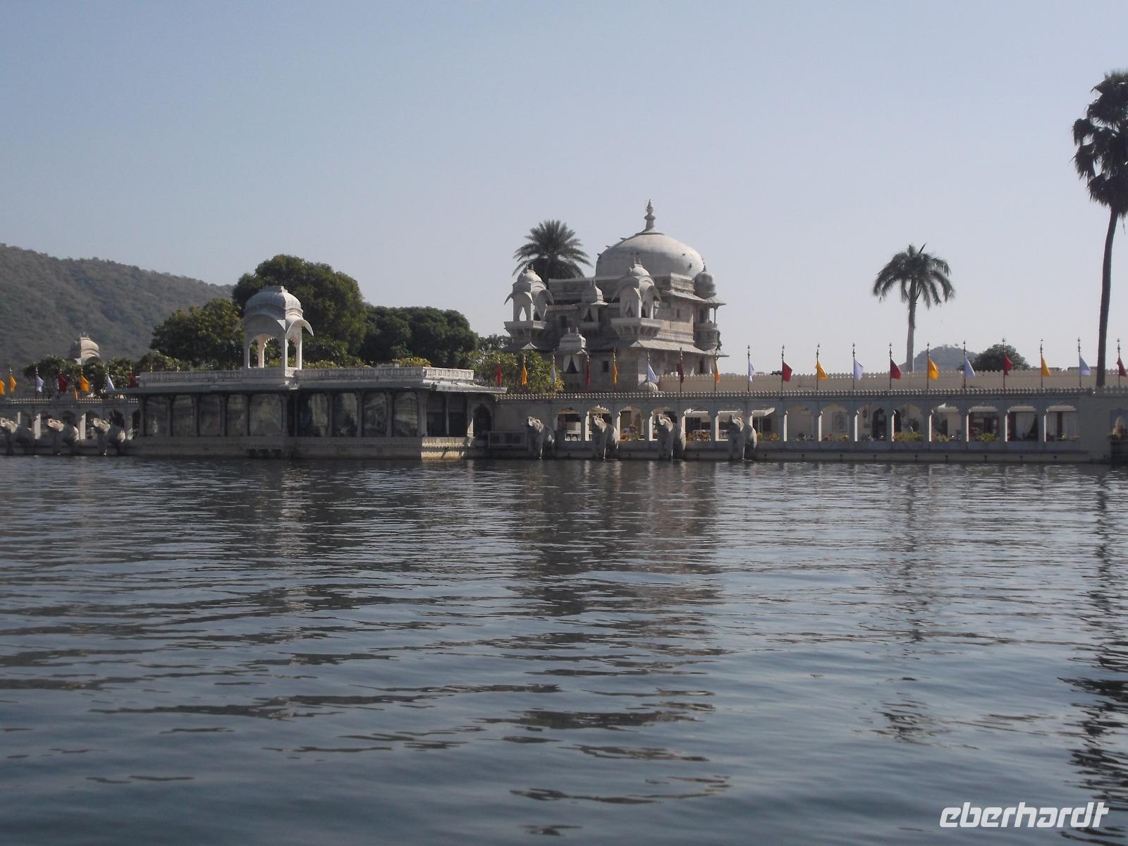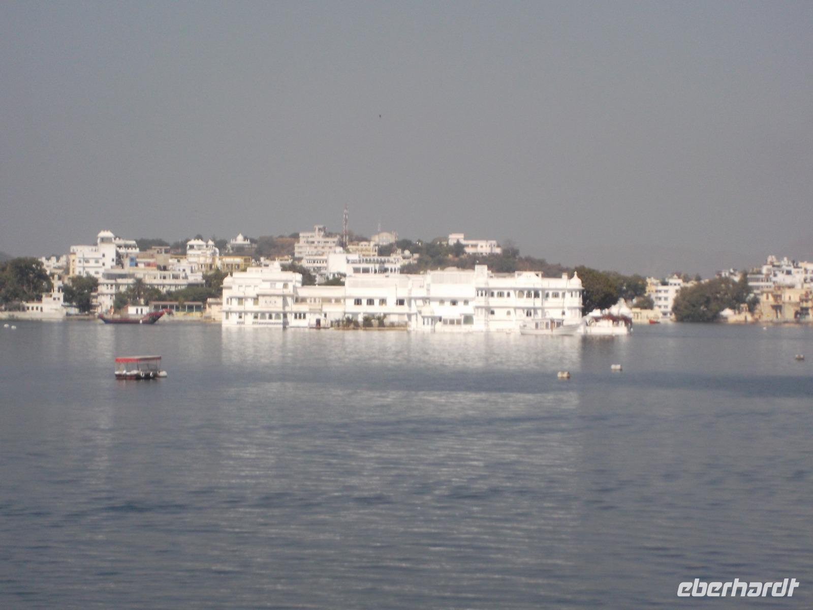 Auf dem Wasser des künstlich angelegten großen Monsun-Sees scheint eines der Wahrzeichen Udaipurs regelrecht zu schwimmen: ein alter Maharadscha-Palast, das heutige Seehotel. Schneeweiß anzusehen gehört es zu den Objekten, die Udaipur den Beinamen „die weiße Stadt" einbrachten und es ist aus demselben Material wie das Taj Mahal. Das flach auf einer Insel liegende Gebäude wirkt manchen seltsam bekannt - es diente schon oft als Filmkulisse. Die berühmtesten Kinofilme beispielsweise sind der James-Bond-Film „Octopussy" mit Roger Moore in der Hauptrolle und ein klassischer berühmter deutscher Zweiteiler: „Der Tiger von Eschnapur" und „das indische Grabmal", wurde 1958/1959 von Regisseur Fritz Lang gedreht, mit Paul Hubschmidt in der Hauptrolle.
