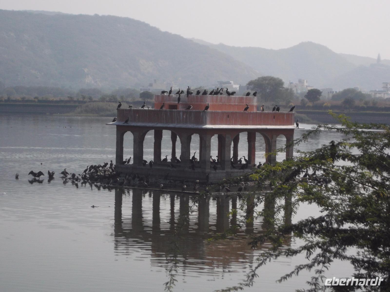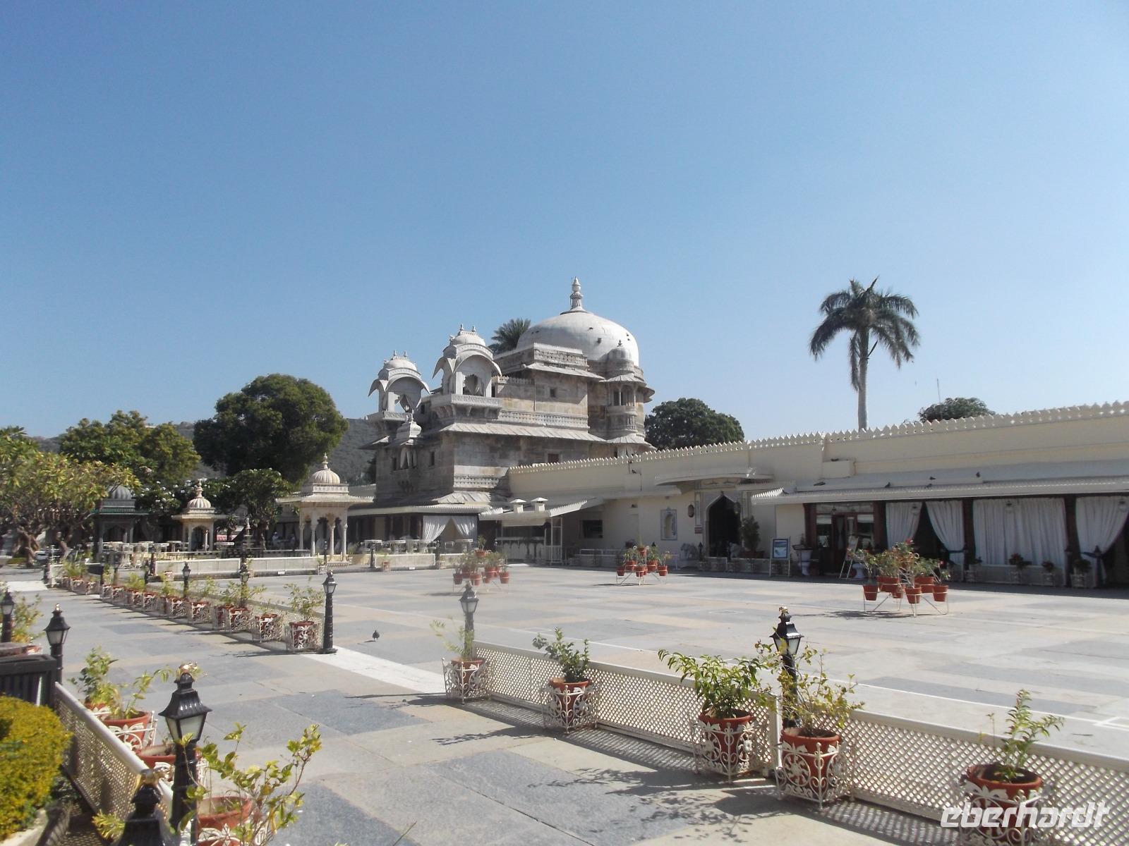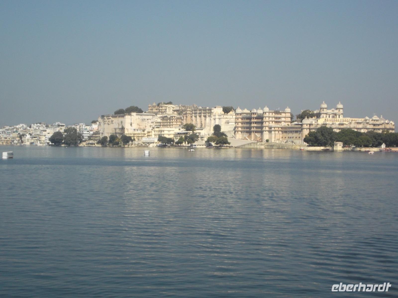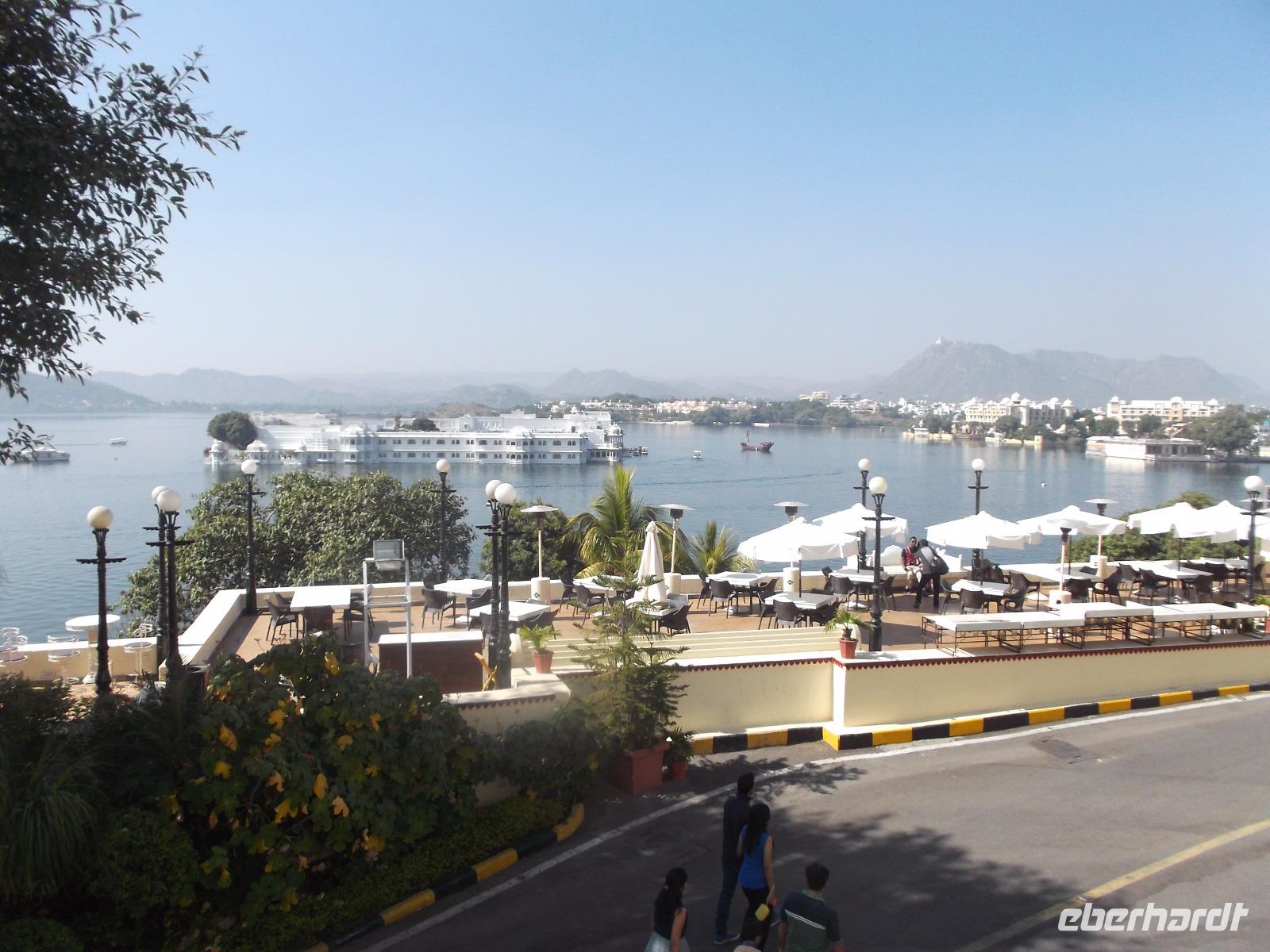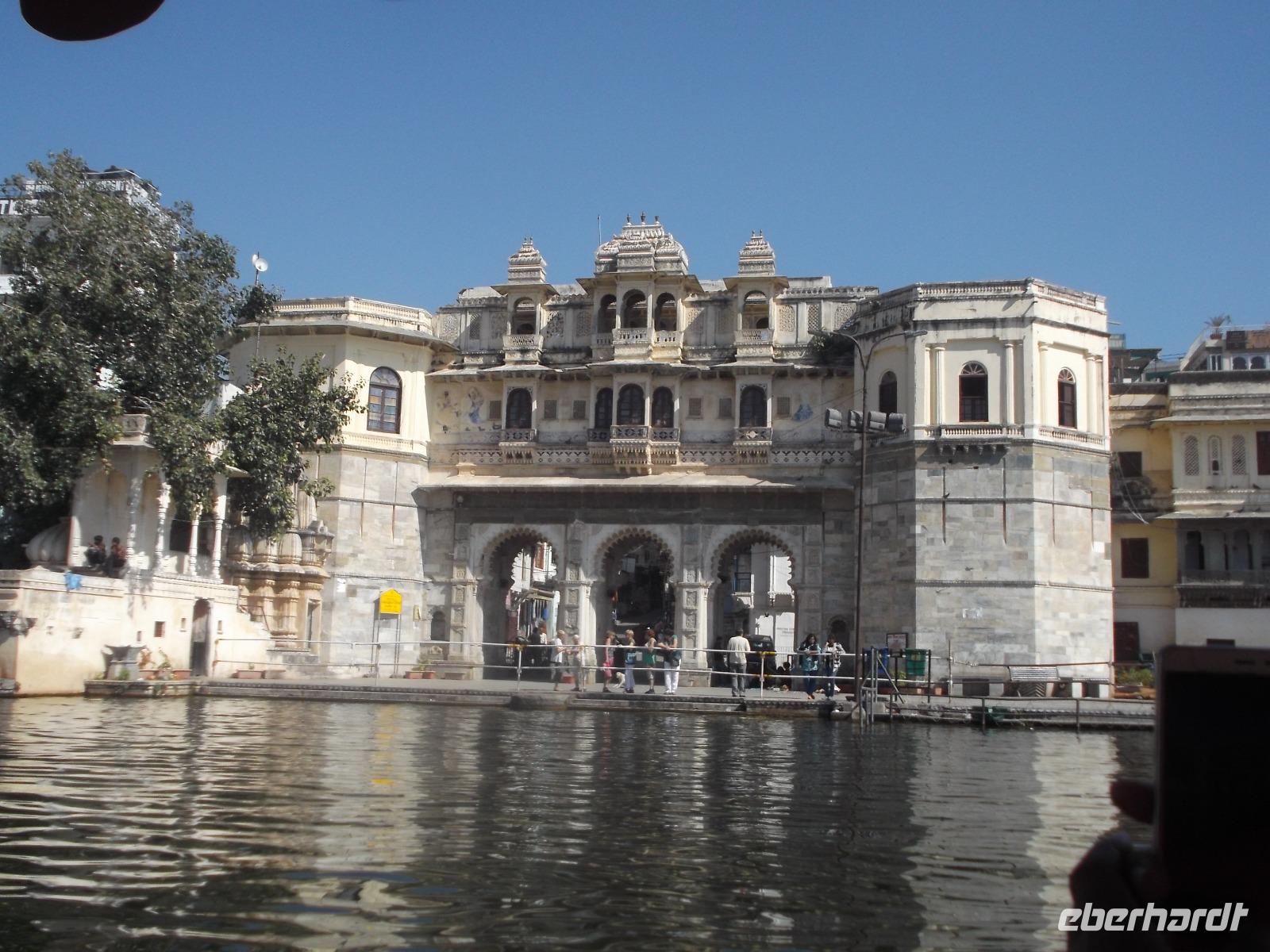 Auf dem Wasser des künstlich angelegten großen Monsun-Sees scheint eines der Wahrzeichen Udaipurs regelrecht zu schwimmen: ein alter Maharadscha-Palast, das heutige Seehotel. Schneeweiß anzusehen gehört es zu den Objekten, die Udaipur den Beinamen „die weiße Stadt" einbrachten und es ist aus demselben Material wie das Taj Mahal. Das flach auf einer Insel liegende Gebäude wirkt manchen seltsam bekannt - es diente schon oft als Filmkulisse. Die berühmtesten Kinofilme beispielsweise sind der James-Bond-Film „Octopussy" mit Roger Moore in der Hauptrolle und ein klassischer berühmter deutscher Zweiteiler: „Der Tiger von Eschnapur" und „das indische Grabmal", wurde 1958/1959 von Regisseur Fritz Lang gedreht, mit Paul Hubschmidt in der Hauptrolle.