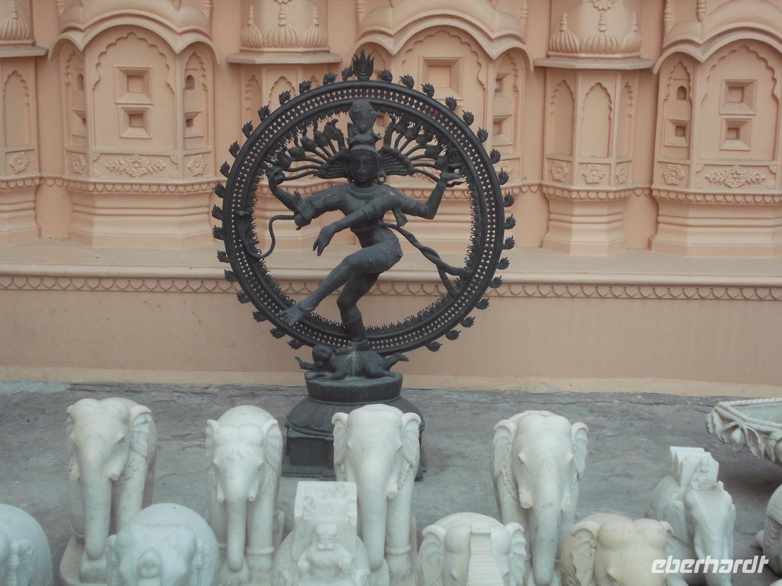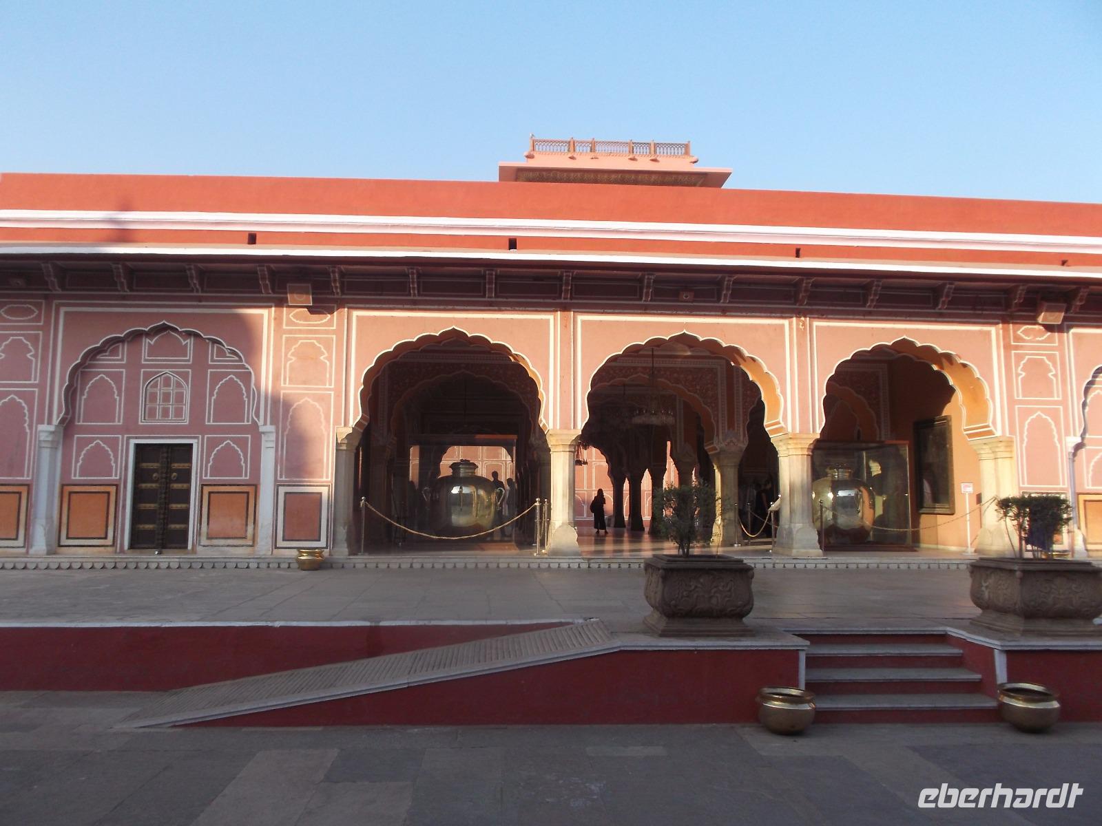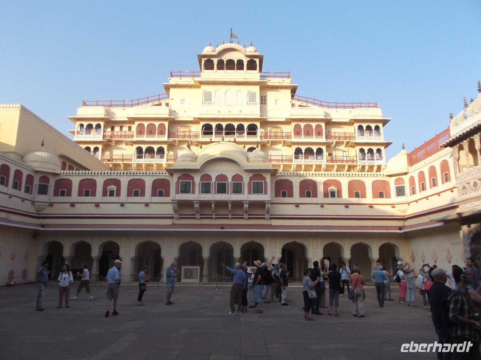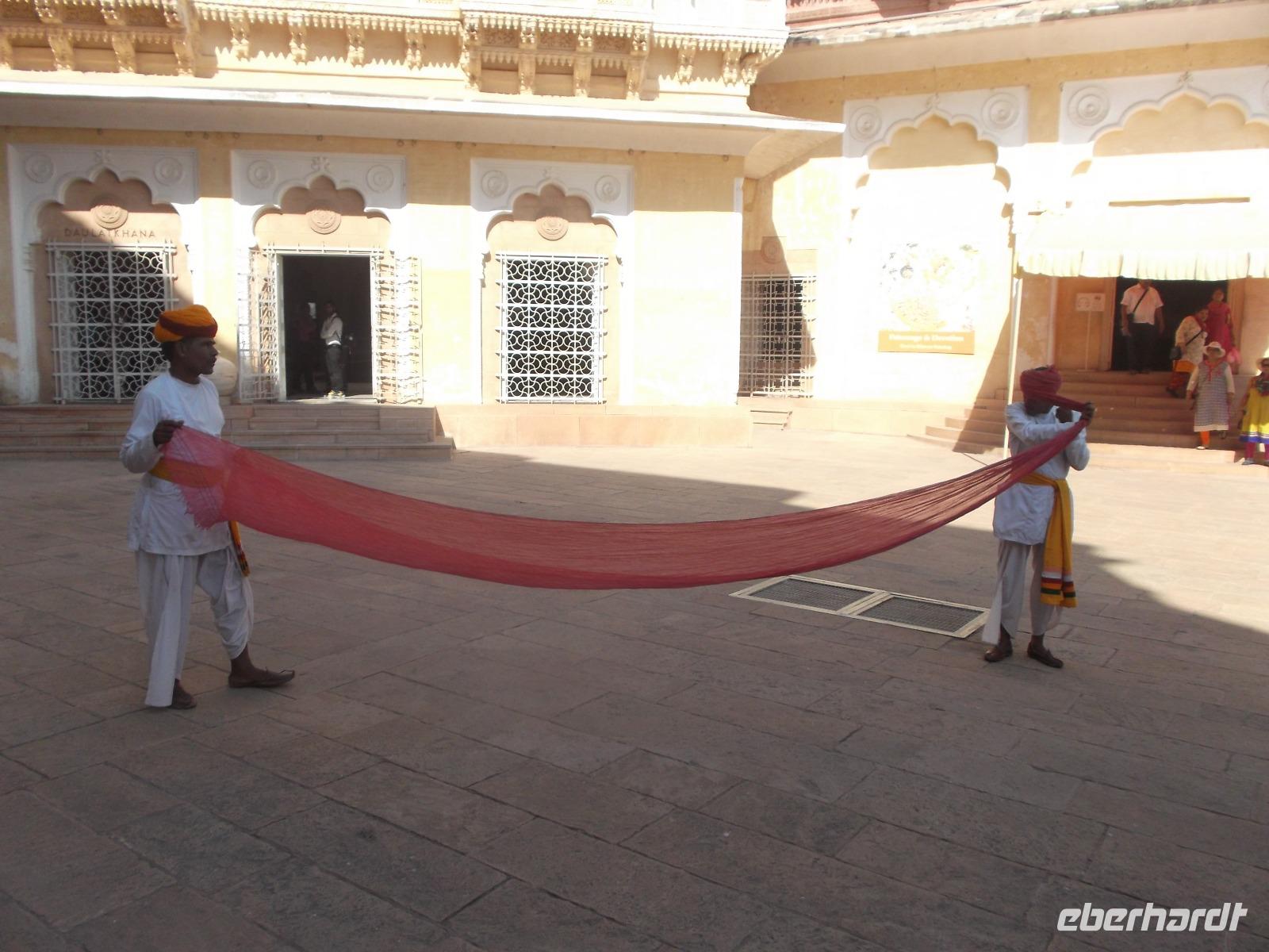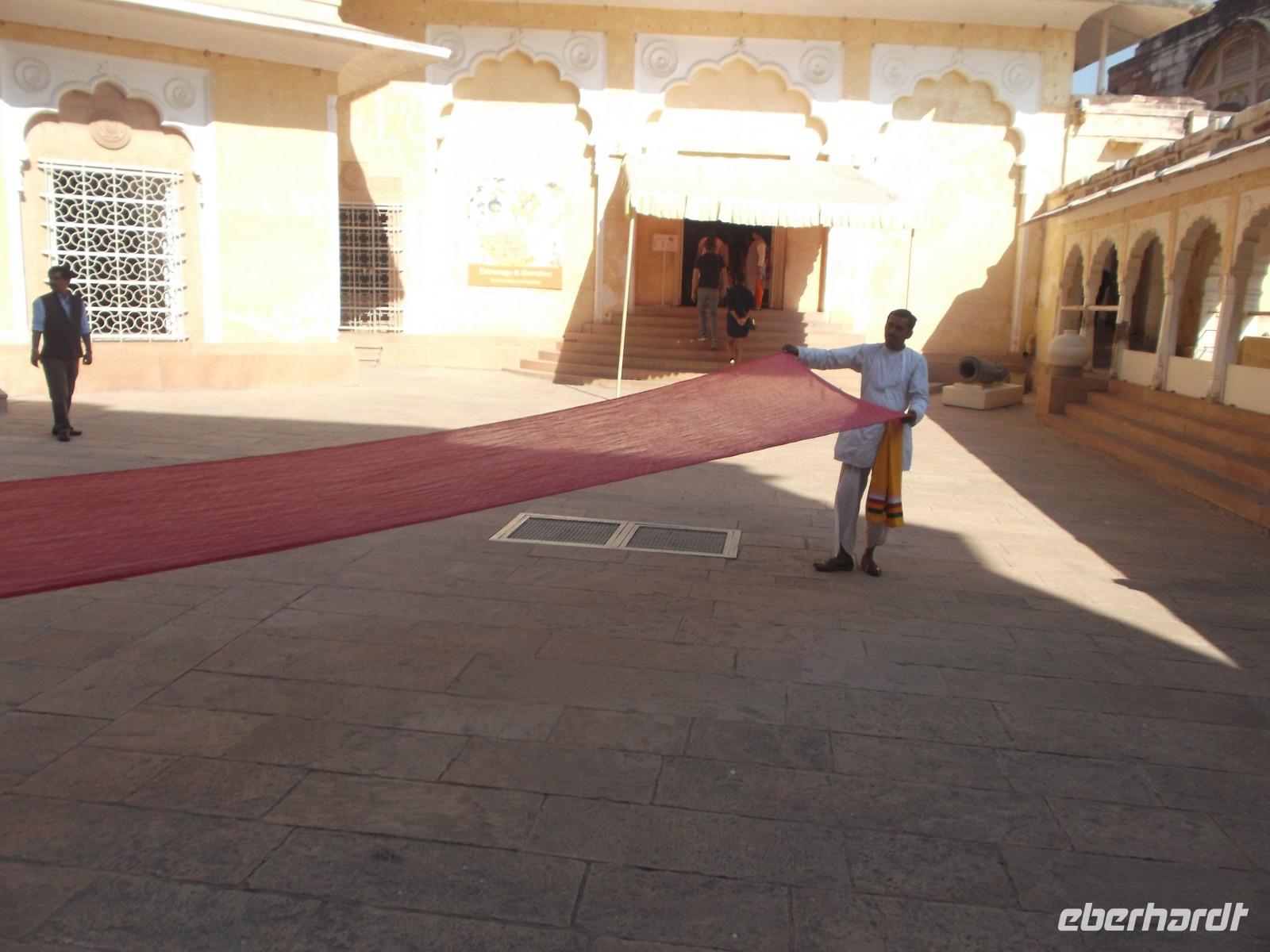 Später sahen wir noch den Stadtpalast, teilweise noch vom Maharaja bewohnt. Erst vor etwa 120 Jahren wurde der Gebäudekomplex erbaut, aber in traditionellem Stil gehalten. Neben dem privaten, der Öffentlichkeit nicht zugänglichen Teil enthält er heute auch Schauräume und Museen. Zum Tagesabschluss besuchten wir eine Kooperative zur Textilherstellungund erfuhren viel Wissenswertes über die immer noch per Hand ausgeführten Textildruckverfahren und die spezielle Art der Teppichherstellung in Indien mit besonderer Knotendichte und Nachbehandlung der geknüpften Teppiche.