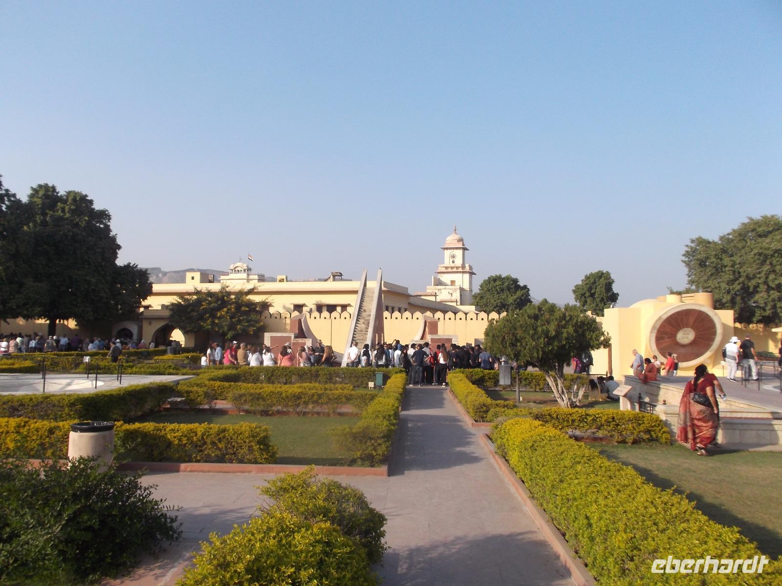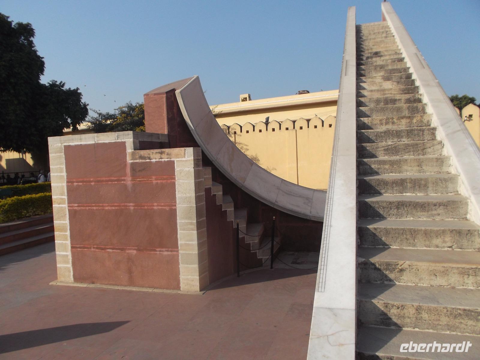 Wir besichtigten das Amber Fort und kehrten dann in die Stadt Jaipur zurück, nicht ohne einen Fotostopp an dem in einem künstlich angelegten Stausee thronenden Wasserpalast „Jal Mahal" einzulegen. Nach kurzem Mittagsimbiß folgte die nächste aufregende Besichtigung - seit 2010 zählt auch das berühmte Steinerne Observatorium „Jantar Mantar" zum UNESCO-Weltkulturerbe. Der Name bedeutet übersetzt etwa „Magisches Gerät" und noch sieben derartige Observatorien sind weltweit erhalten. Die älteren, im Iran und in Usbekistan liegenden steinernen Himmelsbeobachtungszentren inspirierten indische Herrscher, die insgesamt fünf derartiger Bauten an besonderen Orten in Indien errichten ließen. Rajputenherrscher Maharaja Jai Singh II. ließ im 18. Jahrhundert in Jaipur Geräte zur Beobachtung von Sonne, Mond und Sternen und Berechnung und astrologischer Verwertung ihrer Daten errichten. Das „Jantar Mantar" in Jaipur ist nicht nur das größte seiner Art, sondern auch unerwartet exakt: auf unglaubliche zwei Sekunden genau misst hier die größte Sonnenuhr der Welt mit ihrem 32 m hohen Turm als Zeiger die Zeit anhand des Standes der hier nahezu immer scheinenden Sonne.