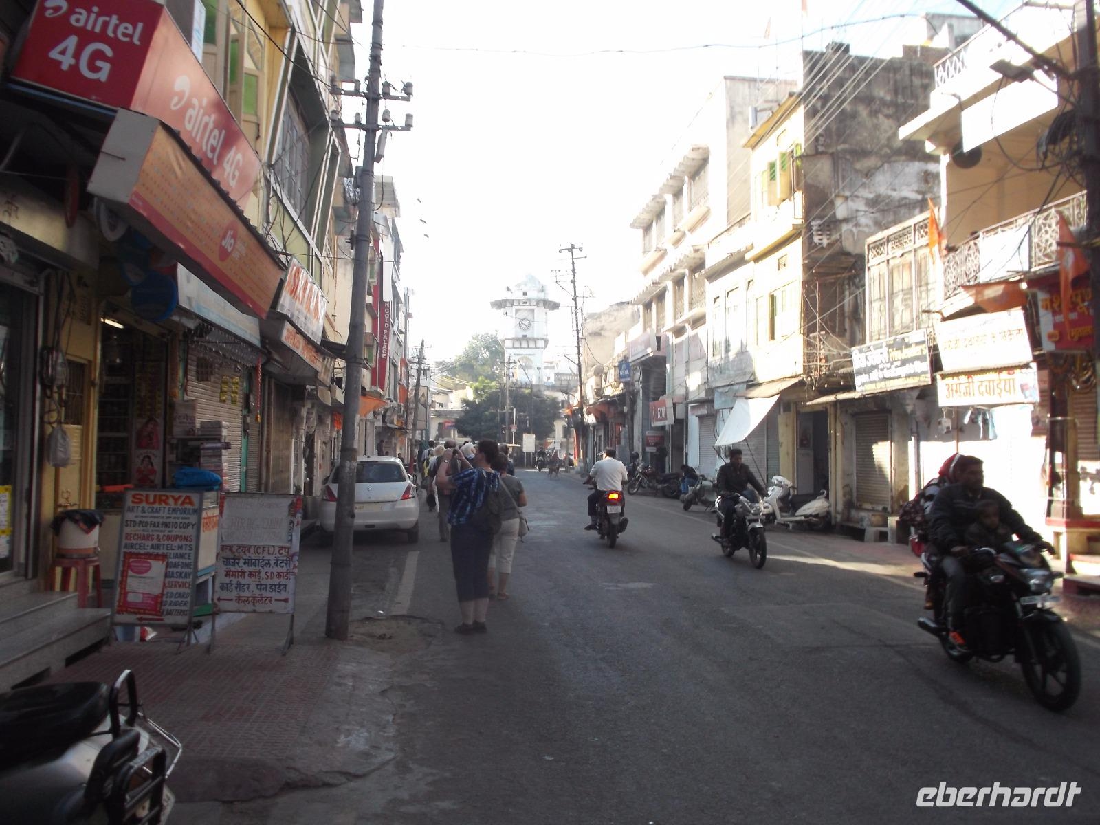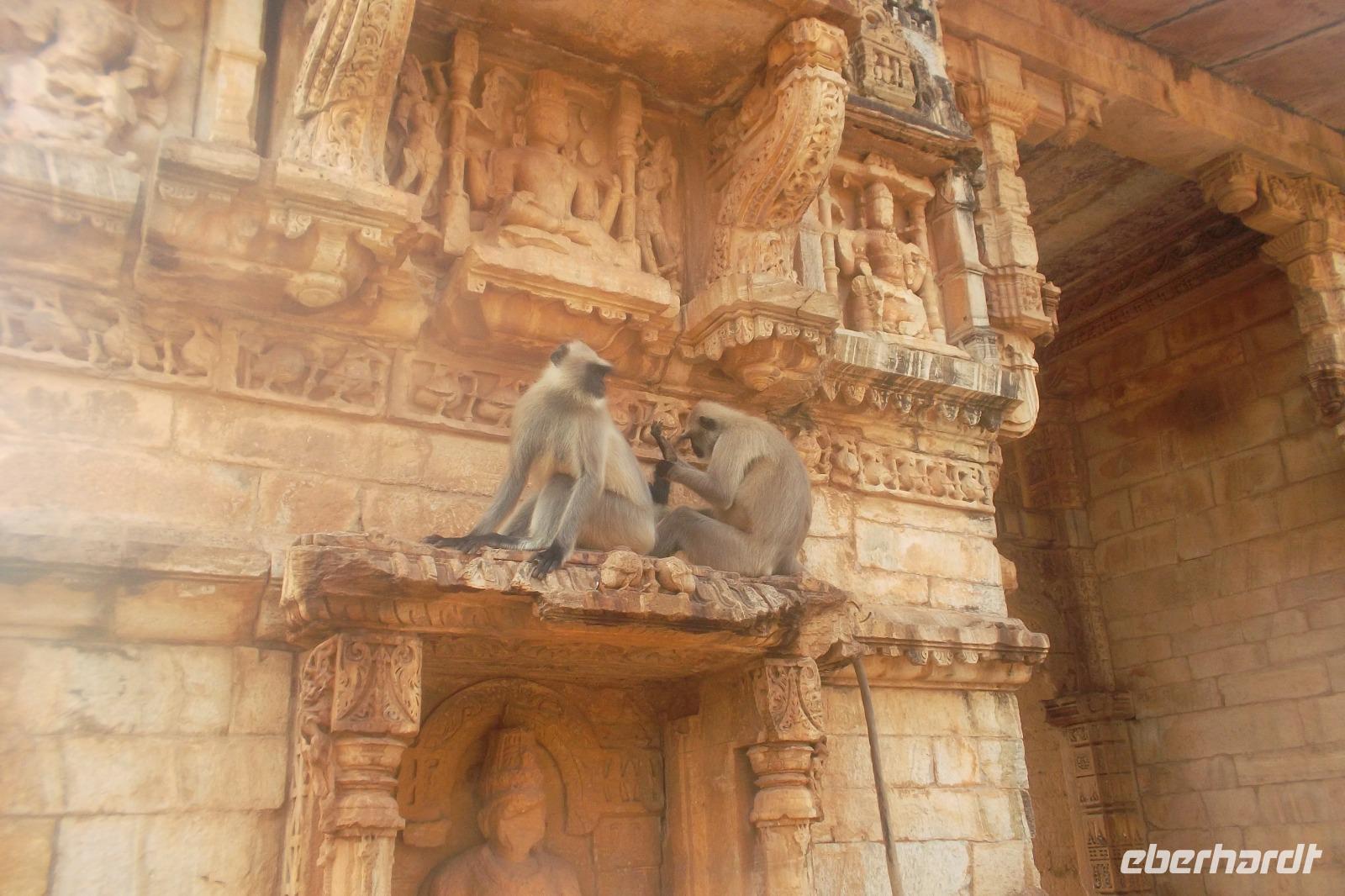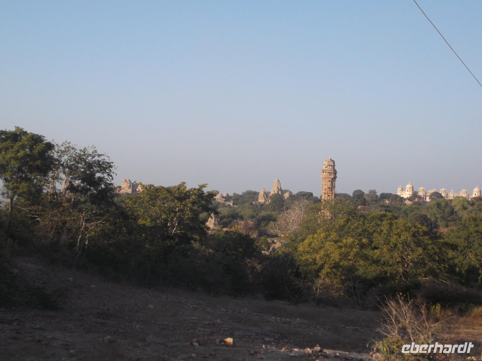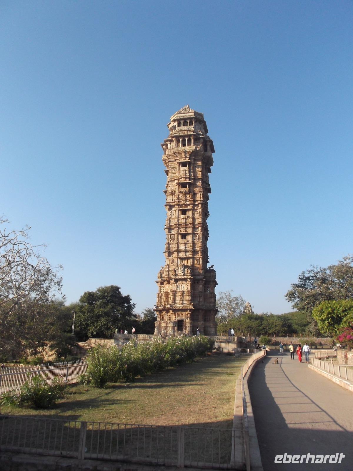 Eine interessante längere Unterbrechung gab es aber doch: Nach und nach verließen wir die flachen Gebiete und näherten uns dem Aravalli-Gebirge, einem Mittelgebirge,, dass sich insgesamt hunderte Kilometer durch Indien zieht - von Gujarat durch ganz Rjasthan bis nach Haryana, wo es bis fast an die Gangesniederung reicht. Am Beginn der ersten Höhenzüge, waren wir gegen Mittag in Chittaurgarh, jenem Ort, der heute eine der größten permanent bewohnten Festungen der Welt ist und einst als Hauptstadt des Rajputen-Königsreiches Merwar fungierte. Da sich die stolzen Hindu-Herrscher dieses Königreichs den kriegerischen. muslimischen Mogulkaisern nicht unterwerfen wollten, verließen sie Chittaurgarh und gründeten an anderer Stelle die neue Hauptstadt Udaipur. Nachdem wir am Rande der Festungsstadt Chittaurgarh unser Mittagessen hatten, gab es - sozusagen zum Nachtisch - als besonderes Extra einen Abstecher in die Zitadelle. Da die Altstadt für Busse nicht passierbar ist, fuhren wir mit mehreren Dreiradtaxen den relativ langen Weg auf den etwa 180 m hohen Felsrücken, auf dem die Zitadelle liegt. Gewaltige mehrfache Befestigungsringe mit engen Stadttoren schirmen die Altstadt ab und zeugen von einstiger Macht und Größe. Unser Hauptziel und das berühmteste historische Bauwerk von Chittaurgarh ist der Siegesturm des Herrschers Rana Kumbha, der sogenannte „Vijaya Stambha". Der reichverzierte Bau aus dem 15. Jh. wirkt mit seinen 37 m Höhe würdevoll und kräftig. Um ihn herum sieht man die Reste von Tempeln und Burganlagen, in denen sich heute zahlreiche Affen aufhalten. Nach etwas Besichtigungszeit und einem weiteren Fotostopp kehrten wir mit den Taxen zu unserem Bus zurück und fuhren dann zu unserem Übernachtungsziel, der neuen Hauptstadt von Mewar, Udaipur. Unser Hotel lag direkt in dessen verwinkelter Altstadt.
