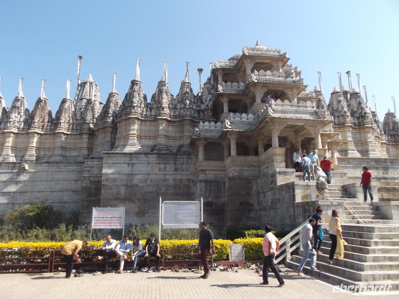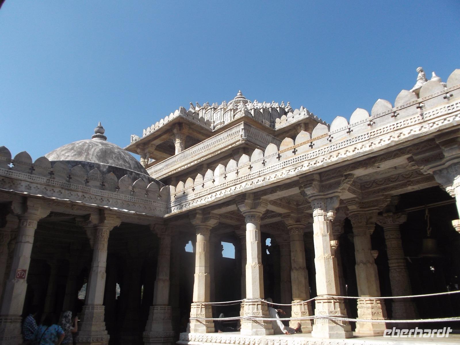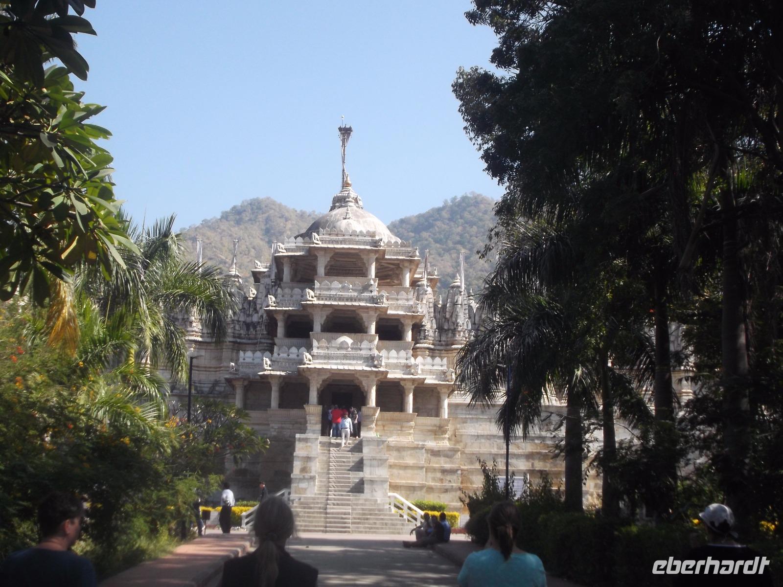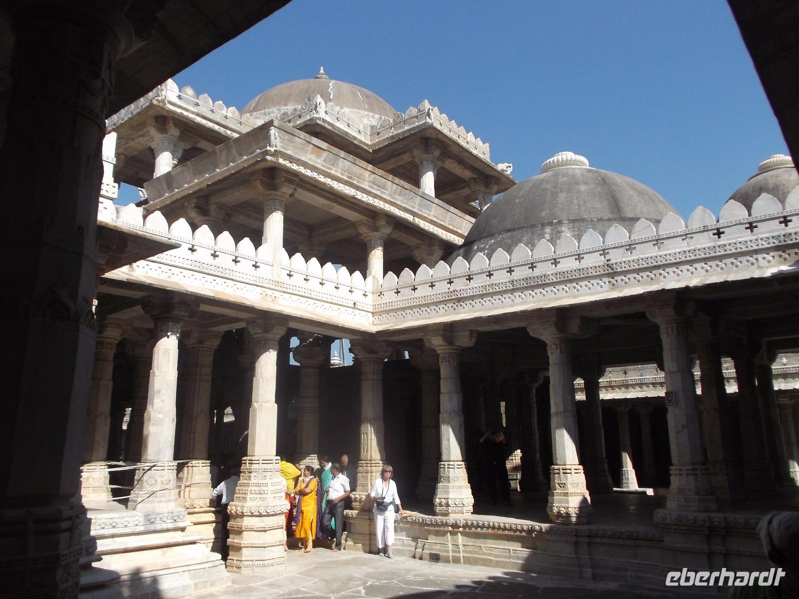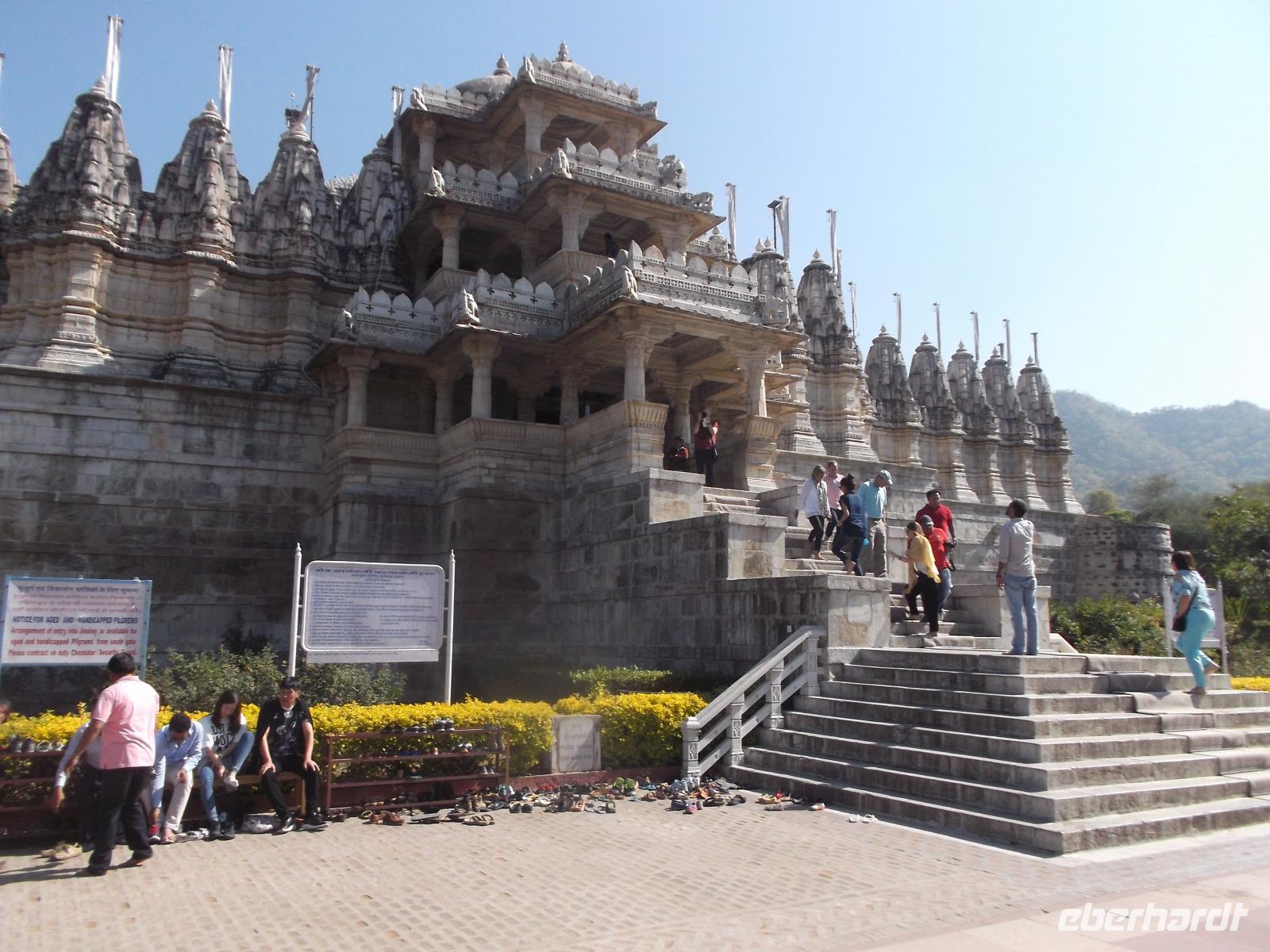 Der Tageshöhepunkt jedoch war die Besichtigung der Tempelanlage von Ranakpur, jenes in der zweiten Hälfte des 15. Jahrhunderts errichteten Jain-Tempels, der eines der wichtigsten Pilgerziele dieser Religionsgemeinschaft darstellt. Ranakpur liegt versteckt in einem Tal des Aravalli-Gebirges und ist größer als die älteren, aber zumeist bekannteren Dilwara-Tempel auf dem Abu-Berg westlich von hier. Der Haupttempel von Ranakpur ist dem „Wegbereiter" der Jain-Religion, Adinath, gewidmet - äußerlich eher unscheinbar, aber im Inneren eine wahre architekturhistorische Sensation. Sein Innenraum ist ausgestaltet mit 1444 Säulen, mit Kerbschnitzerei reich verziert und aus schneeweißem rajasthanischen Marmor. Der besondere Stil und die Motivwahl der Prachtstücke des Tempelinneren von Ranakpur ist ein eindrucksvolles Zeugnis nicht nur der Leistungsfähigkeit sondern auch der schönsten Stücke jainistischen Kunsthandwerks - noch dazu ausgeführt in einem der härtesten zu bearbeitenden Gesteine.