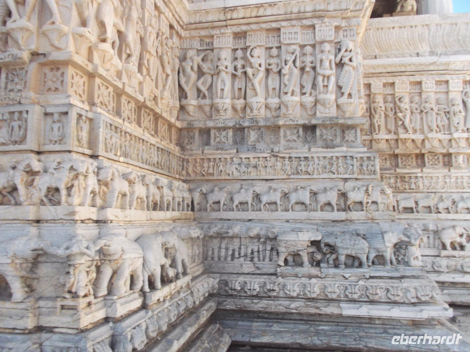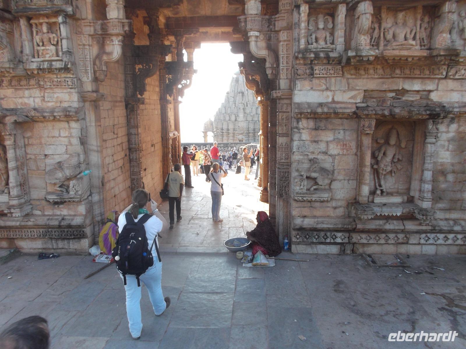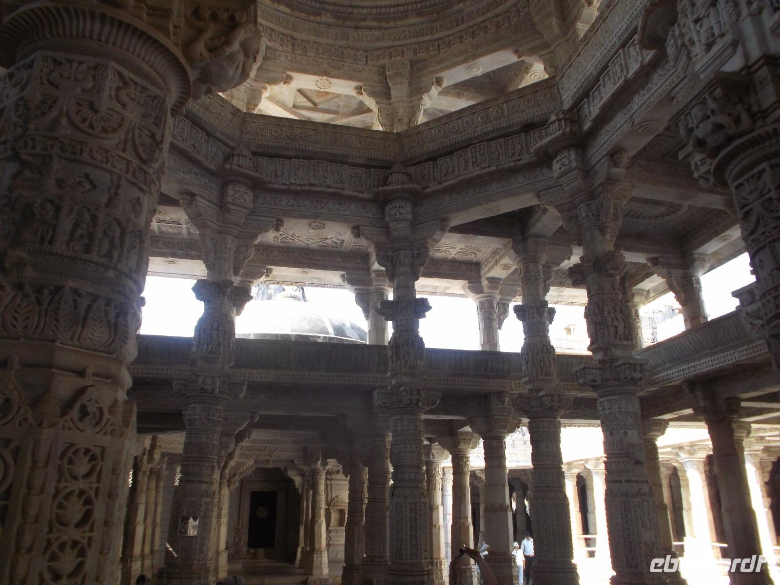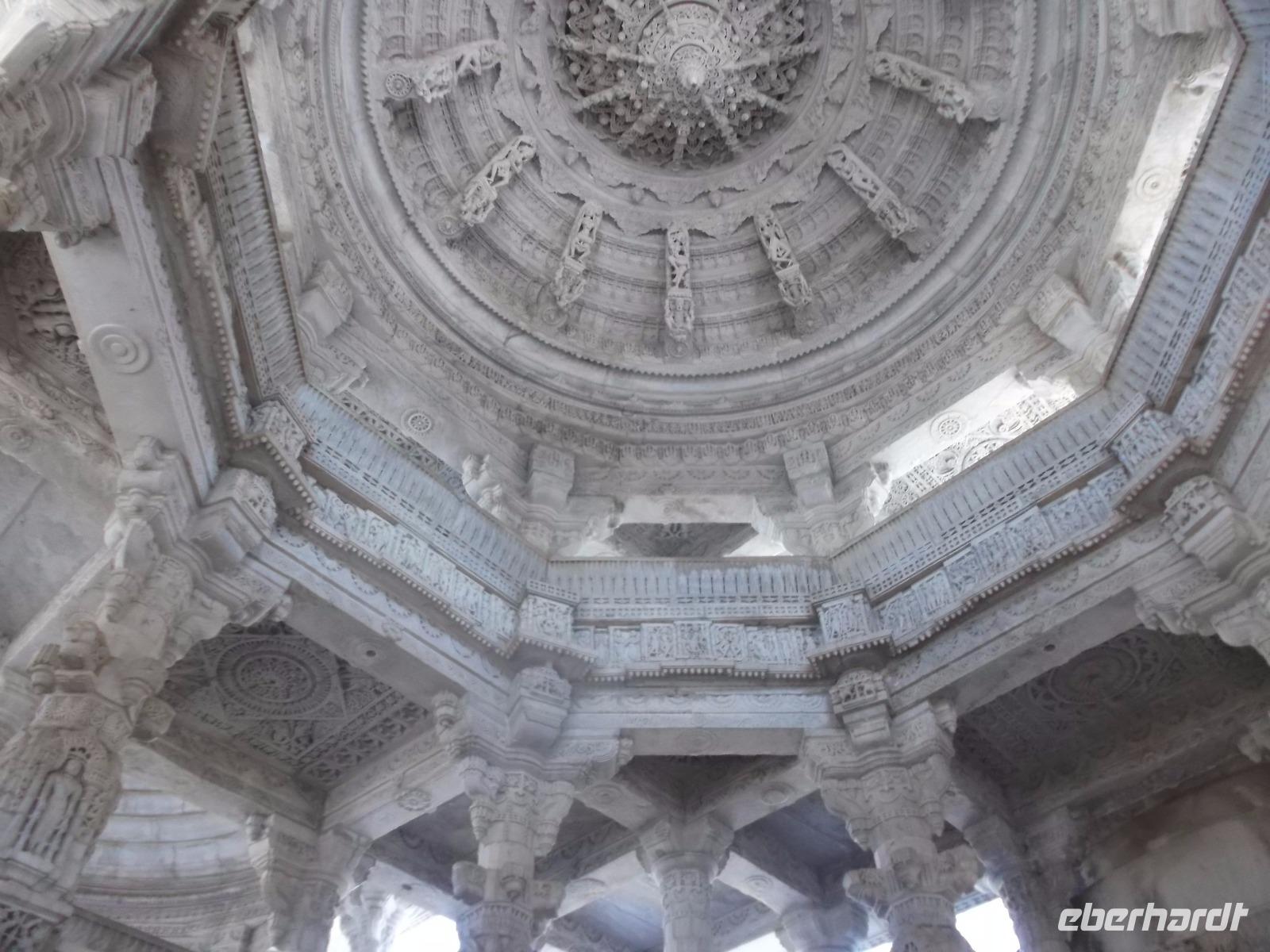 Der Tageshöhepunkt jedoch war die Besichtigung der Tempelanlage von Ranakpur, jenes in der zweiten Hälfte des 15. Jahrhunderts errichteten Jain-Tempels, der eines der wichtigsten Pilgerziele dieser Religionsgemeinschaft darstellt. Ranakpur liegt versteckt in einem Tal des Aravalli-Gebirges und ist größer als die älteren, aber zumeist bekannteren Dilwara-Tempel auf dem Abu-Berg westlich von hier. Der Haupttempel von Ranakpur ist dem „Wegbereiter" der Jain-Religion, Adinath, gewidmet - äußerlich eher unscheinbar, aber im Inneren eine wahre architekturhistorische Sensation. Sein Innenraum ist ausgestaltet mit 1444 Säulen, mit Kerbschnitzerei reich verziert und aus schneeweißem rajasthanischen Marmor. Der besondere Stil und die Motivwahl der Prachtstücke des Tempelinneren von Ranakpur ist ein eindrucksvolles Zeugnis nicht nur der Leistungsfähigkeit sondern auch der schönsten Stücke jainistischen Kunsthandwerks - noch dazu ausgeführt in einem der härtesten zu bearbeitenden Gesteine.