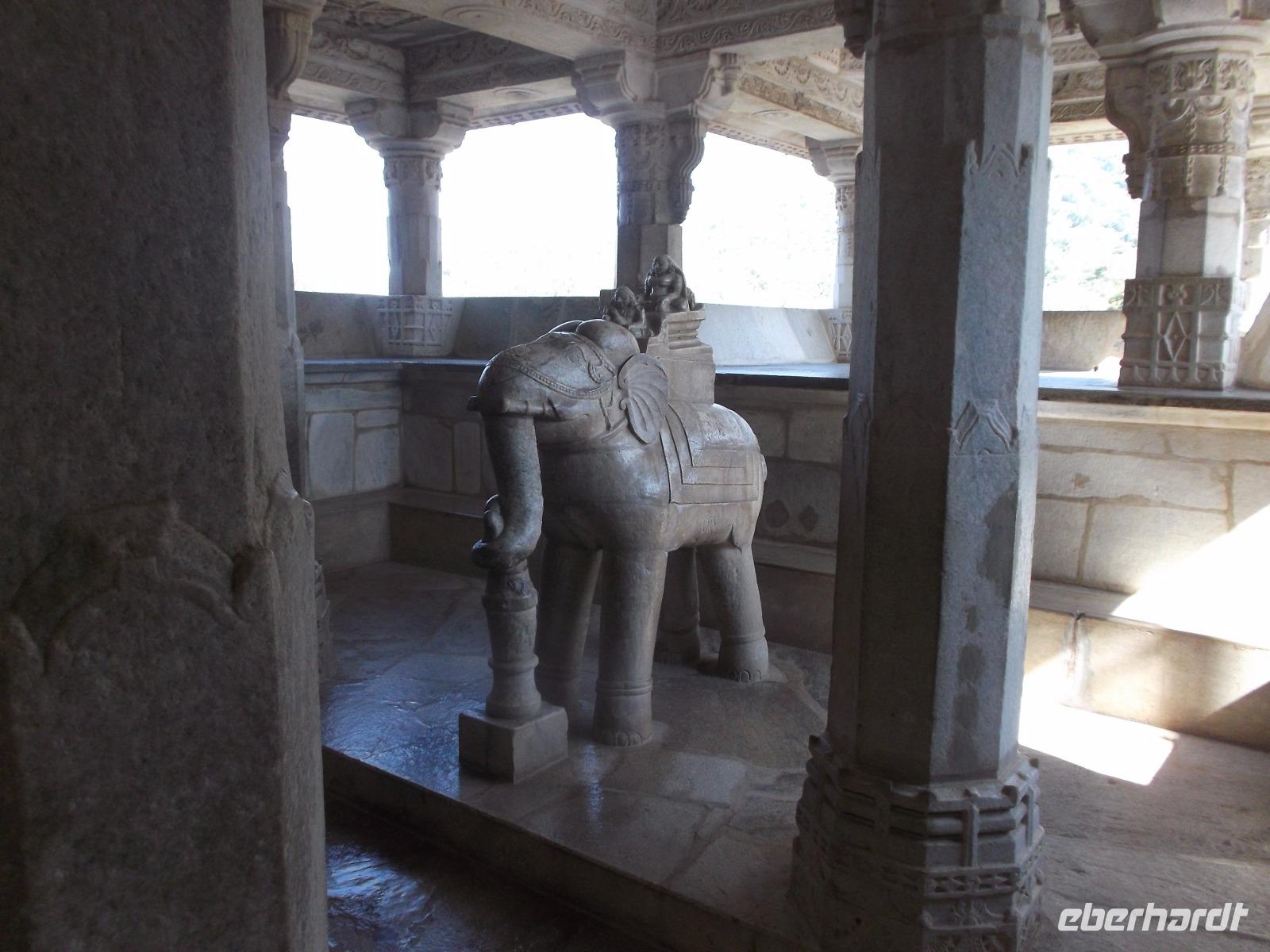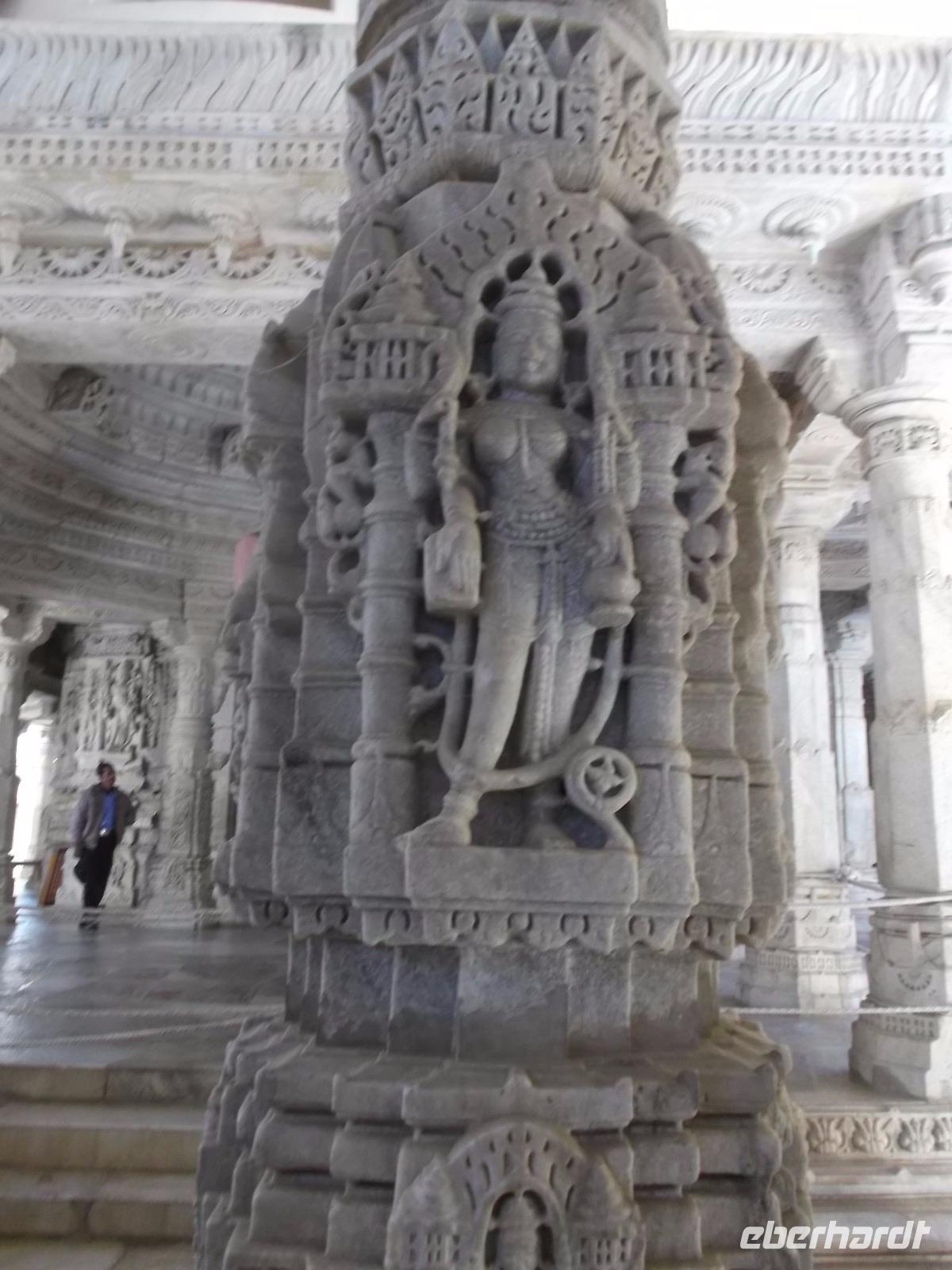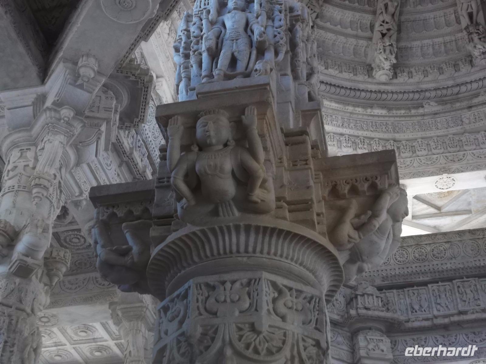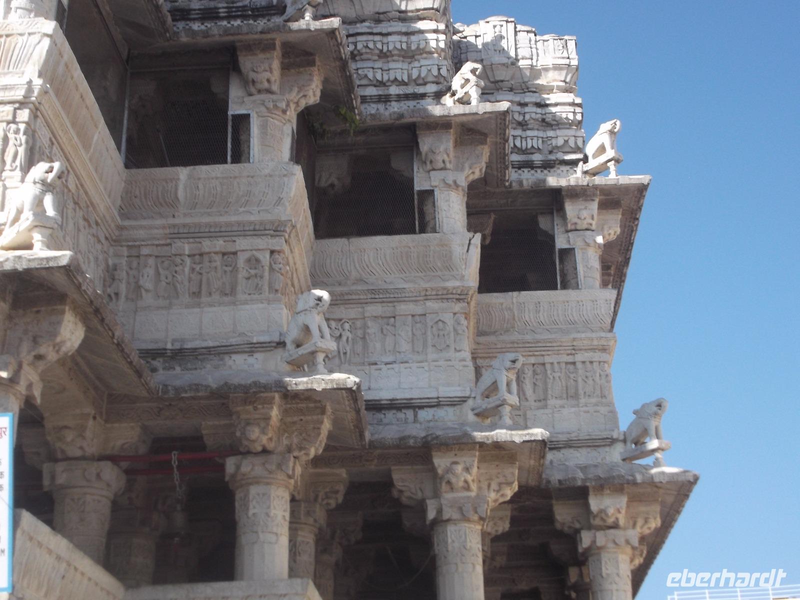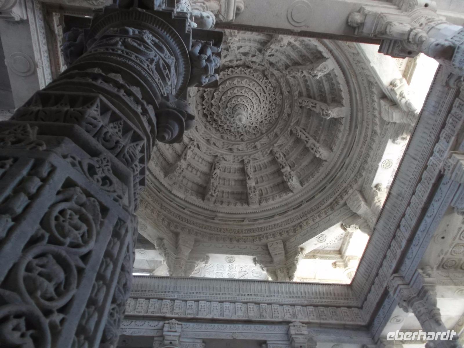 Der Tageshöhepunkt jedoch war die Besichtigung der Tempelanlage von Ranakpur, jenes in der zweiten Hälfte des 15. Jahrhunderts errichteten Jain-Tempels, der eines der wichtigsten Pilgerziele dieser Religionsgemeinschaft darstellt. Ranakpur liegt versteckt in einem Tal des Aravalli-Gebirges und ist größer als die älteren, aber zumeist bekannteren Dilwara-Tempel auf dem Abu-Berg westlich von hier. Der Haupttempel von Ranakpur ist dem „Wegbereiter" der Jain-Religion, Adinath, gewidmet - äußerlich eher unscheinbar, aber im Inneren eine wahre architekturhistorische Sensation. Sein Innenraum ist ausgestaltet mit 1444 Säulen, mit Kerbschnitzerei reich verziert und aus schneeweißem rajasthanischen Marmor. Der besondere Stil und die Motivwahl der Prachtstücke des Tempelinneren von Ranakpur ist ein eindrucksvolles Zeugnis nicht nur der Leistungsfähigkeit sondern auch der schönsten Stücke jainistischen Kunsthandwerks - noch dazu ausgeführt in einem der härtesten zu bearbeitenden Gesteine.