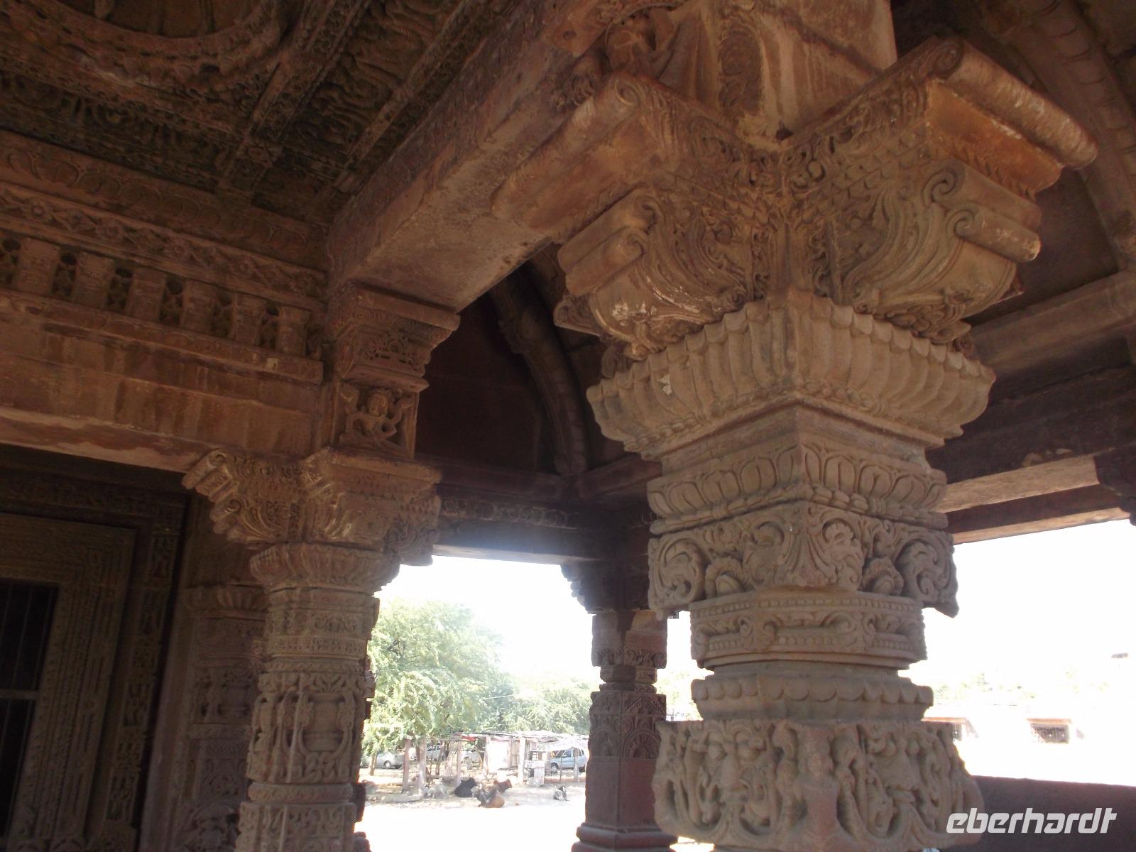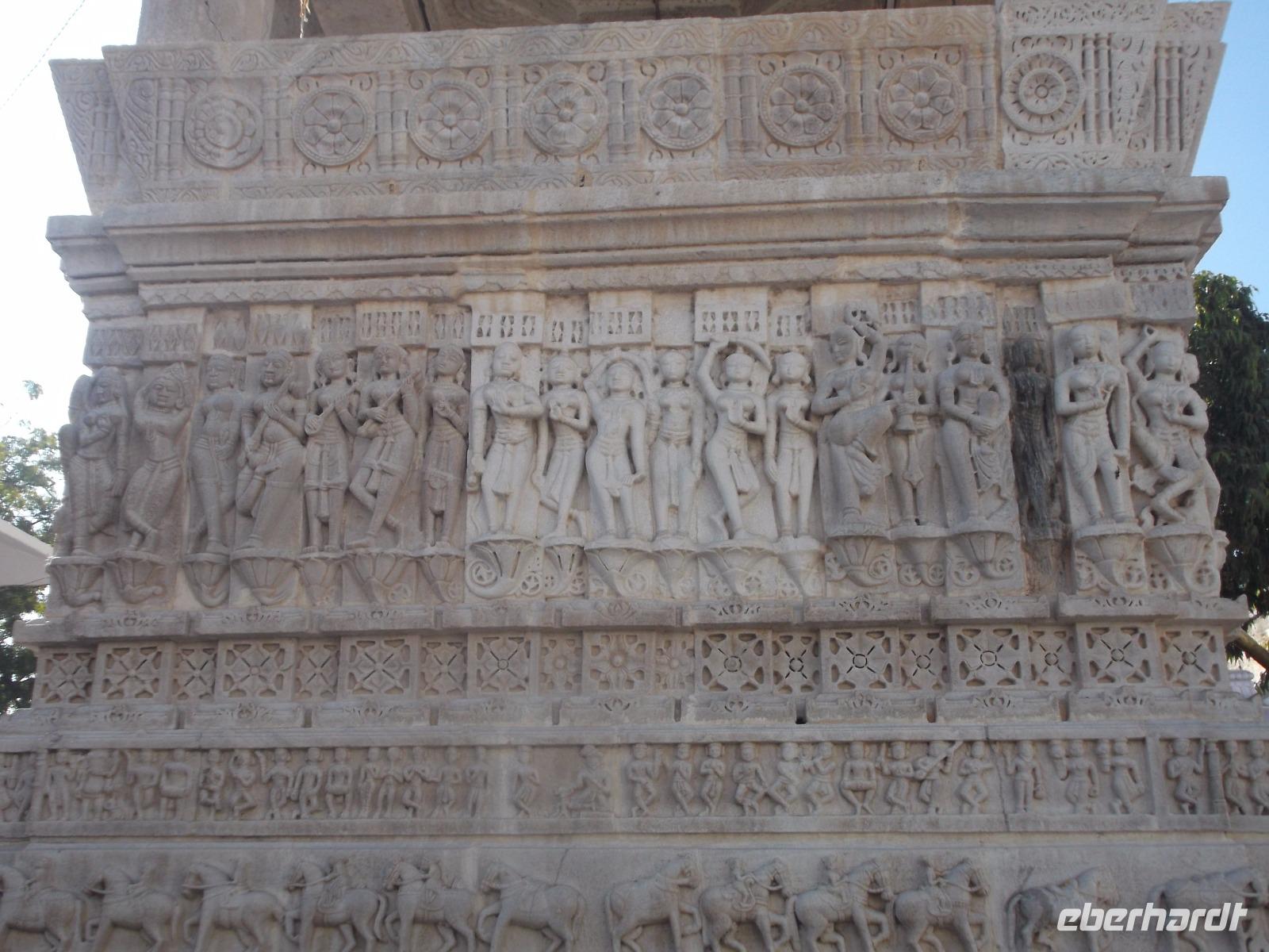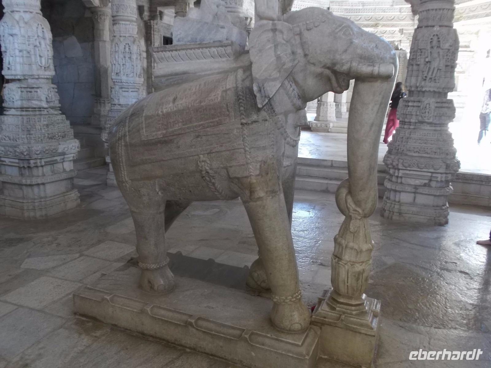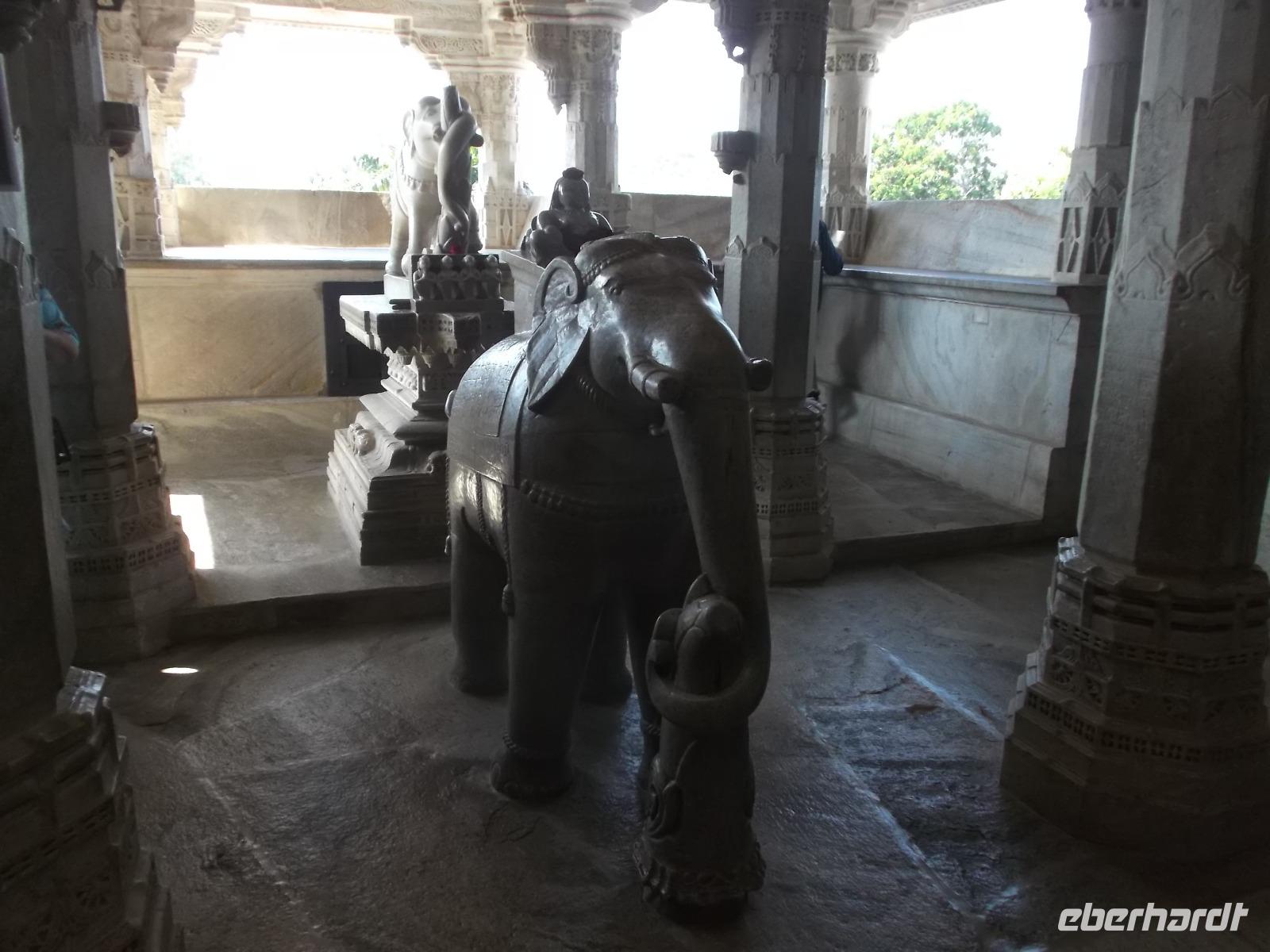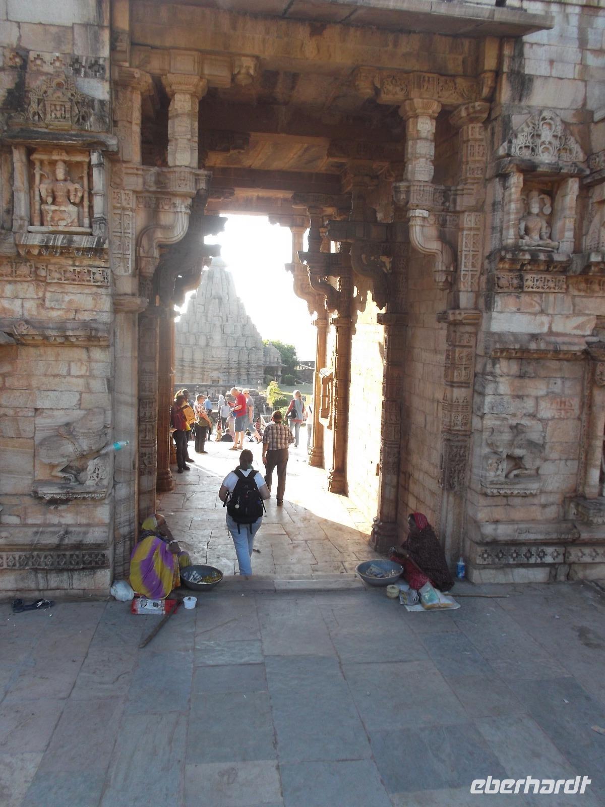 Der Tageshöhepunkt jedoch war die Besichtigung der Tempelanlage von Ranakpur, jenes in der zweiten Hälfte des 15. Jahrhunderts errichteten Jain-Tempels, der eines der wichtigsten Pilgerziele dieser Religionsgemeinschaft darstellt. Ranakpur liegt versteckt in einem Tal des Aravalli-Gebirges und ist größer als die älteren, aber zumeist bekannteren Dilwara-Tempel auf dem Abu-Berg westlich von hier. Der Haupttempel von Ranakpur ist dem „Wegbereiter" der Jain-Religion, Adinath, gewidmet - äußerlich eher unscheinbar, aber im Inneren eine wahre architekturhistorische Sensation. Sein Innenraum ist ausgestaltet mit 1444 Säulen, mit Kerbschnitzerei reich verziert und aus schneeweißem rajasthanischen Marmor. Der besondere Stil und die Motivwahl der Prachtstücke des Tempelinneren von Ranakpur ist ein eindrucksvolles Zeugnis nicht nur der Leistungsfähigkeit sondern auch der schönsten Stücke jainistischen Kunsthandwerks - noch dazu ausgeführt in einem der härtesten zu bearbeitenden Gesteine.