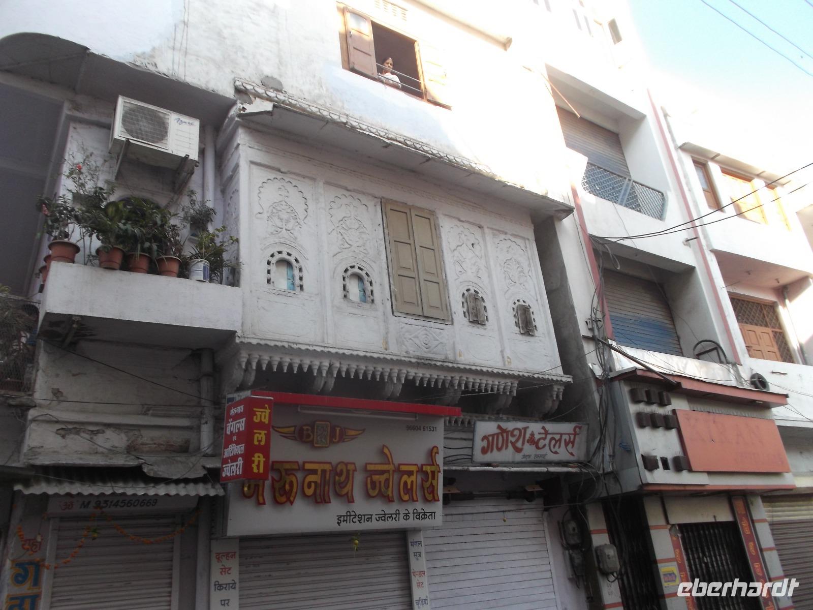 Bei der Weiterfahrt legten wir nachmittags einen Stopp im sogenannten „Shekawati-Gebiet" rund um den Ort Mandawa ein. Es ist bekannt für seine verzierten Kaufmannspaläste - nur dass die Havelis hier nicht wie in Jaisalmer geschnitzte, sondern bemalte Fassaden tragen. . Ein kleiner Rundgang in der alten, hoffnungslos überfüllt scheinenden, Stadt Fatehpur zeigte verwinkelte enge Gassen. Der Ort liegt genau im Herzen des für seine Wandmalereien bekannten „Shekawati"-Gebiets und beherbergt die wohl größte Zahl bemalter alter Händlerhäuser, heute zumeist verlassen oder von Verwalterfamilien bewohnt. Viele sind in schlechter Verfassung, zeigen aber trotz Verblassung und Verkommenheit den Abglanz ihrer einstigen Pracht.