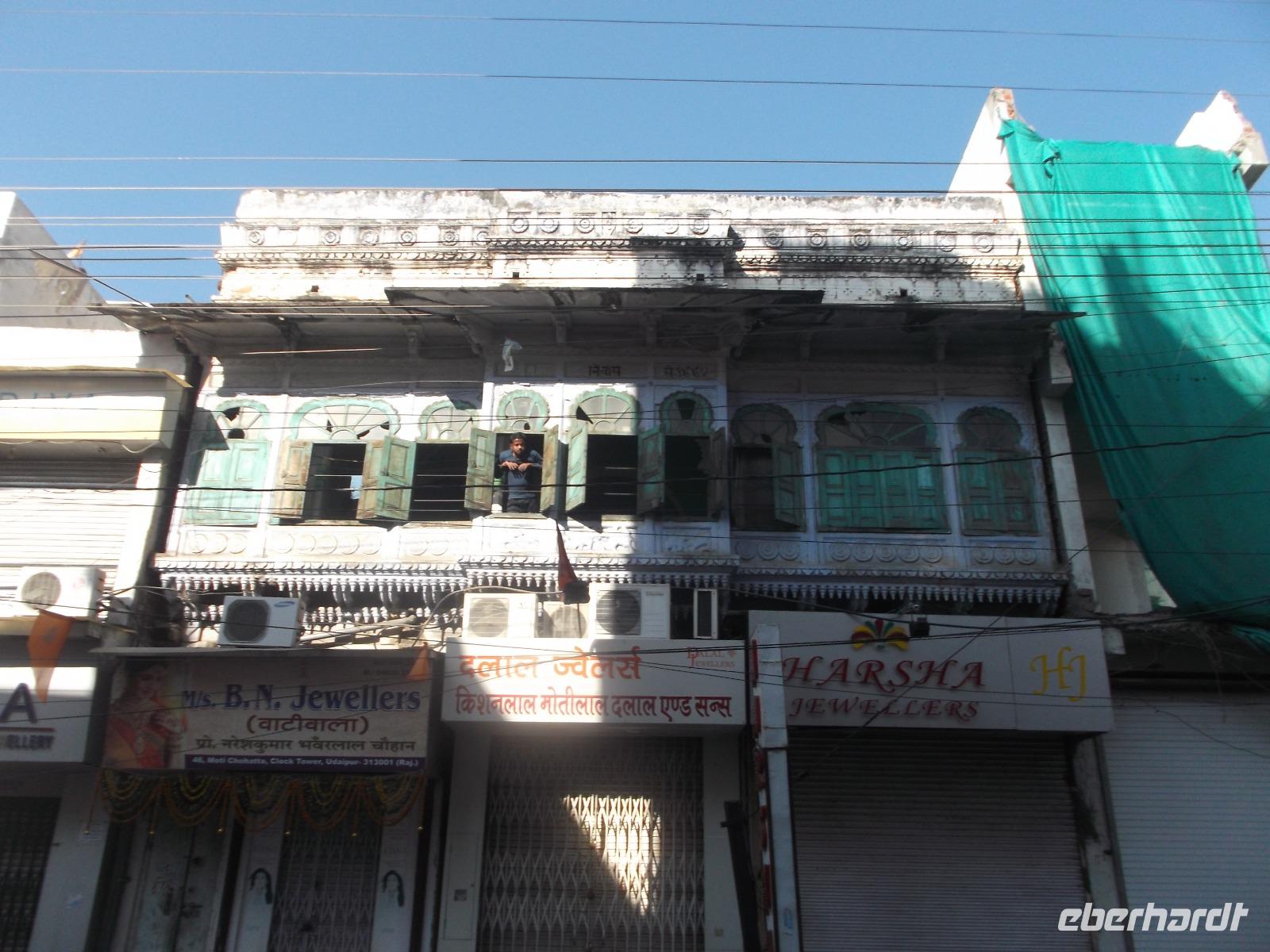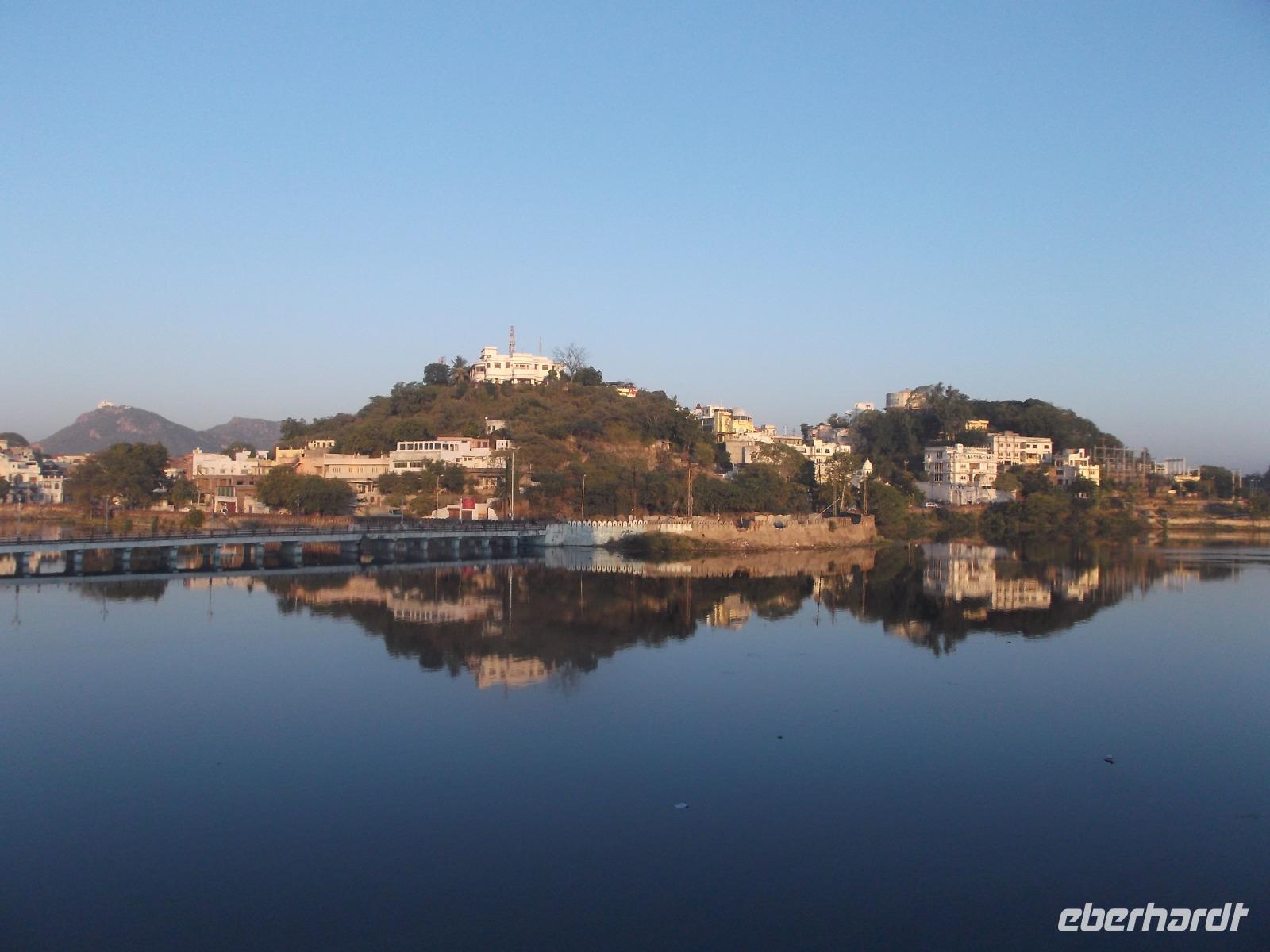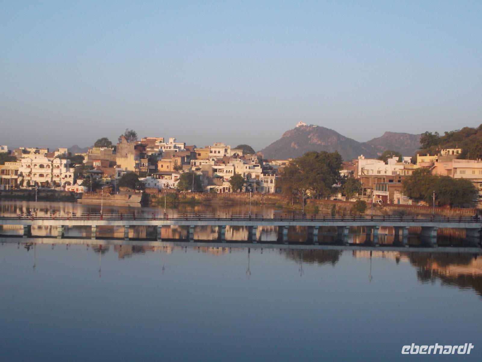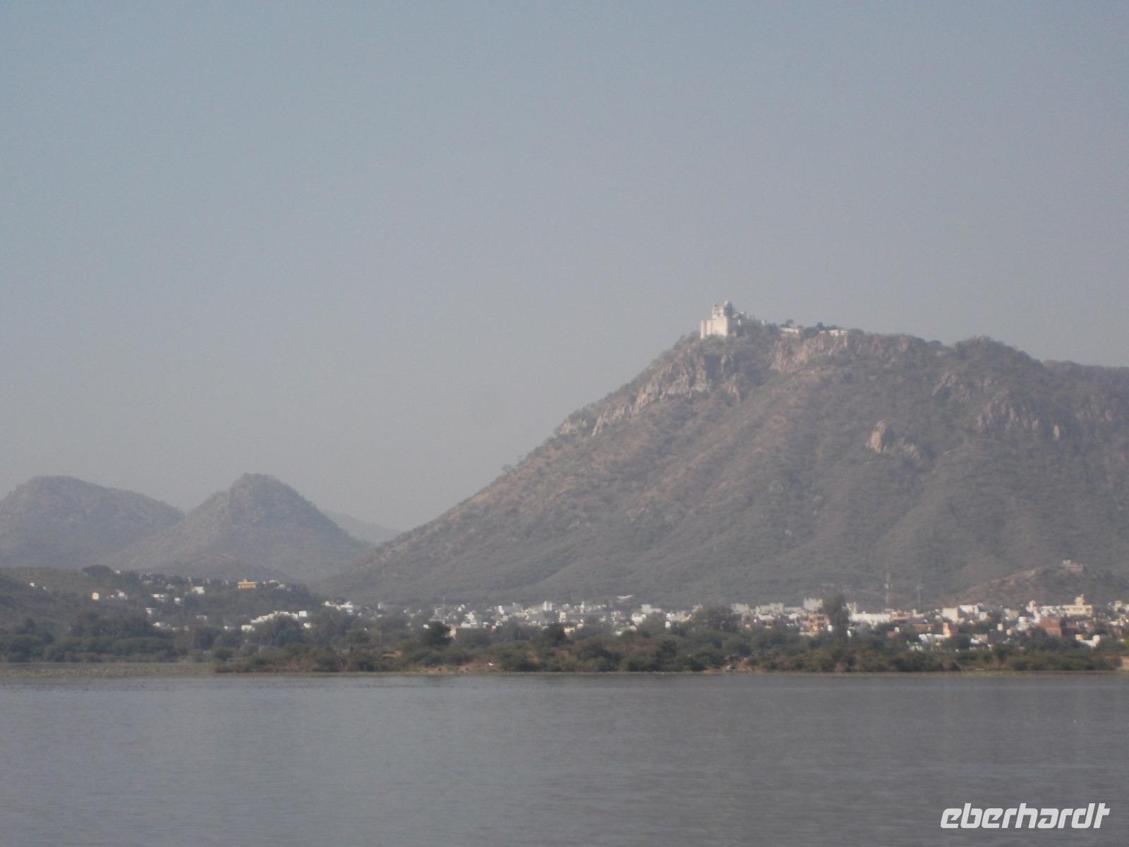 Als im 16. Jh. das Rajputenkönigreich Mewar den Truppen des Mogulkaisers Akhbar unterlag, gründete der besiegte Herrscher Udai Singh in den Bergen des Aravalli-Gebirges eine neue Hauptstadt, da er seine bisherige, die Zitadellenstadt Chittaurgarh, die wir am Vortage besucht hatten, verlassen musste. Herrlich in den Bergen und an mehreren künstlich angelegten Seen gelegen, gehört die nach dem Namen des Gründers „Udaipur" genannte Residenz zu den beliebtesten Touristenorten Indiens. Unser heutiger Tag begann nicht - wie sonst meist - mit einer Busfahrt, sondern von unserem zentral gelegenen Hotel „Rajdarshan" starteten wir zu Fuß zu einem interessanten Bummel durch die Altstadt. Im gerade erwachenden Udaipur - für indische Metropolen vergleichsweise klein, mit gut 500.000 Einwohnern - bummelten wir an Geschäften vorbei, die gerade öffneten, sahen kleine Tempel mit zum Morgengebet versammelten Hindus und erreichten, vorbei an bemalten Hauseingängen und Garküchen den Stadttempel von Udaipur. Mit dem Jagdish-Tempel aus dem 17. Jh., erbaut aus mit Kerbschnitzereien und Reliefsreich verziertem Marmor, erlebten wir zum ersten Mal während unsrer Reise einen gut besuchten Hindutempel, konnten uns umsehen und die Frömmigkeit der Menschen bestaunen. Danach ging es zur Besichtigung in den Stadtpalast, dessen Thronsäle, Herrscherzimmer und Frauengemächer sowie die verzierten Innenhöfe zweifellos zu den Höhepunkten eines Besuchs von Udaipur gehören. Besonders genießen kann man hier die Ausblicke, deren Schauwert sich noch steigerte, als wir den Palast in Richtung Pichola-Stadtsee verließen.