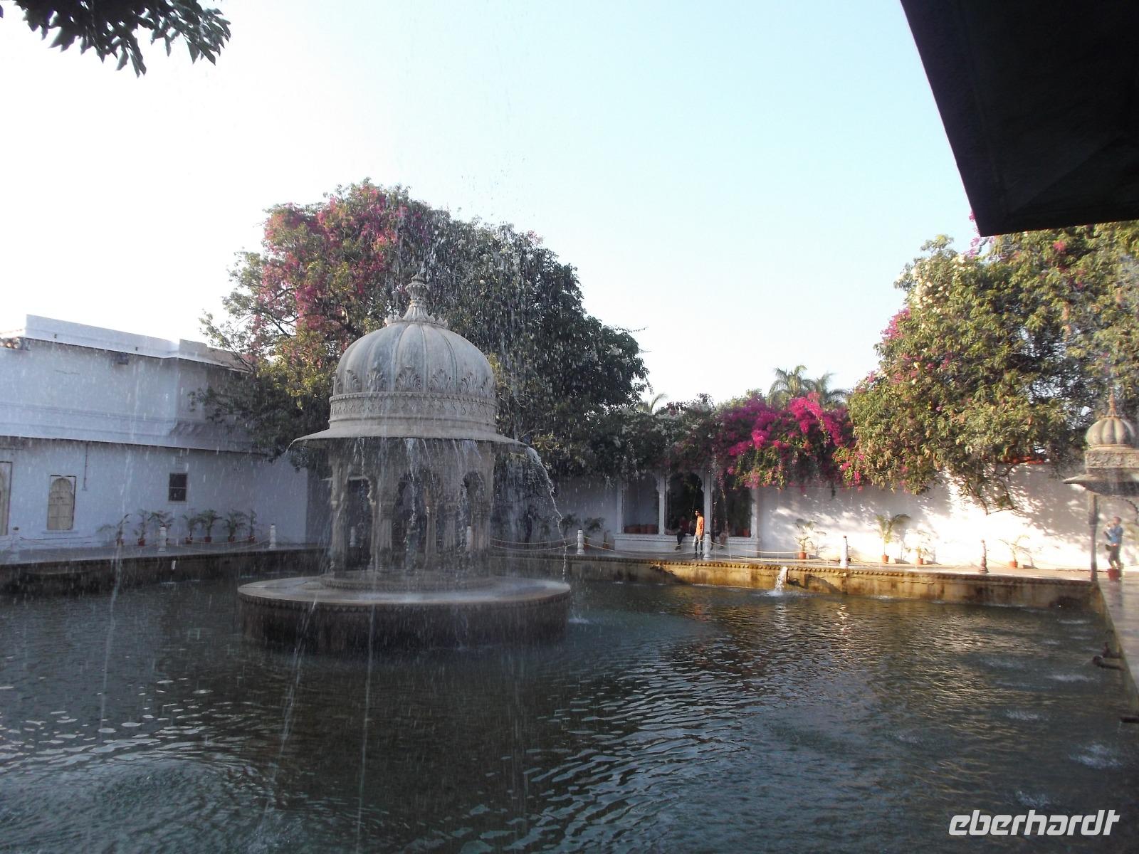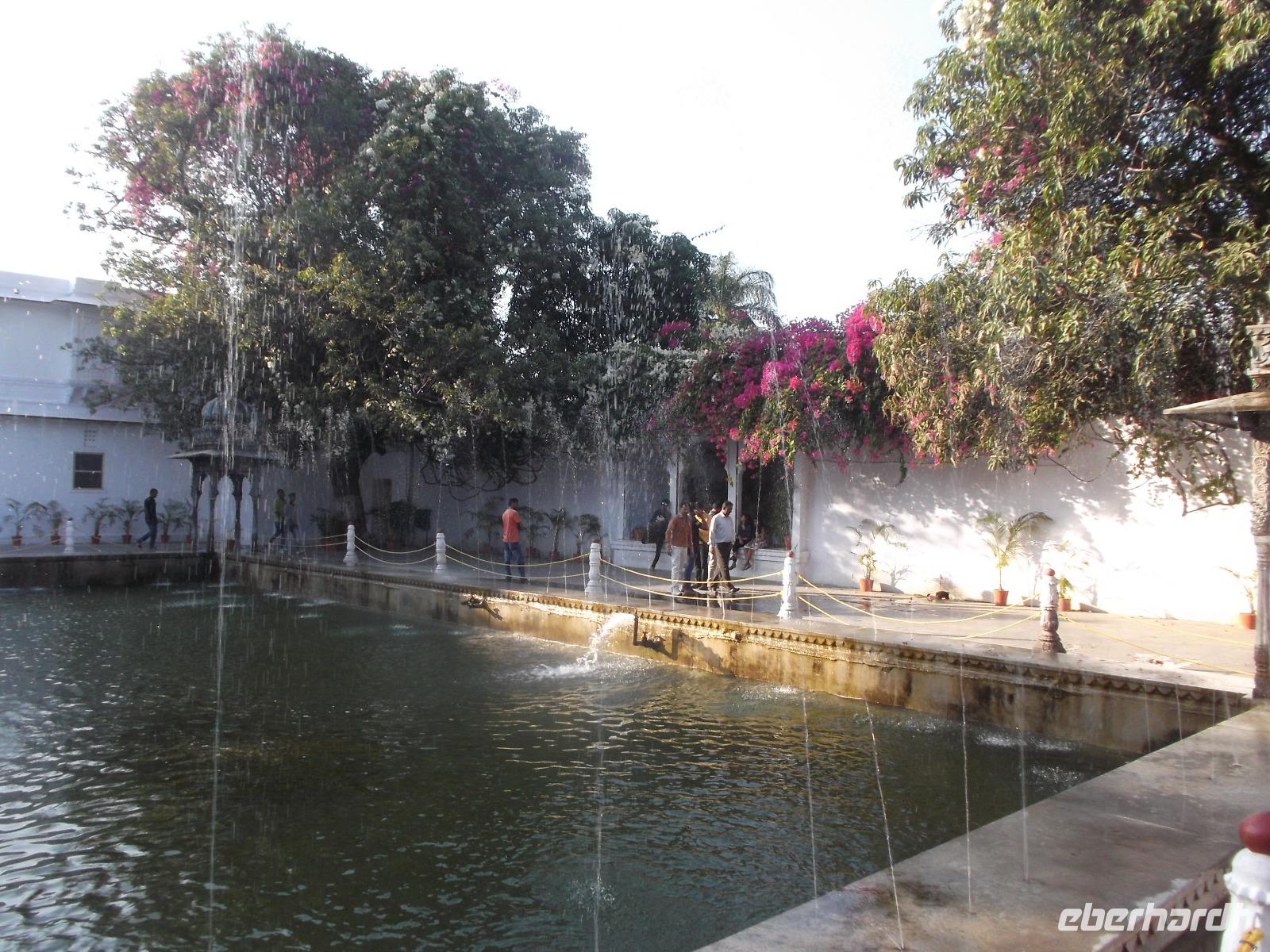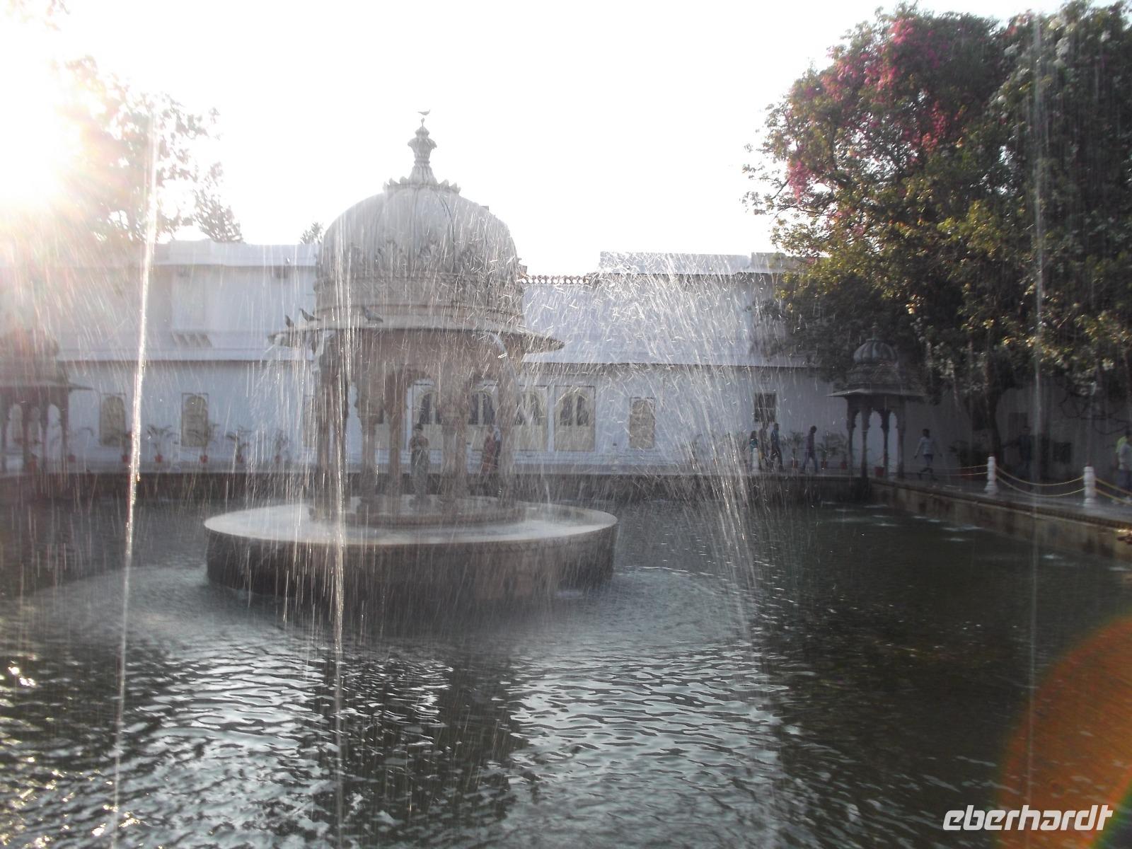 Nach dem Genießen der zahlreichen Ausblicke auf See und Umgebung von der Terrasse vor dem Stadtschloss folgte eine Bootsfahrt. auf dem dieses Jahr vom Monsun reichhaltig mit Wasser gefüllten Pichola-See. Ist schon die Fahrt allein ein besonderer Genuss, wird dieser noch übertroffen von den herrlichen Ausblicken auf das Stadtschloss, dessen gewaltige Ausmaße man erst jetzt erahnt, und auf den Seepalast, in dem sich heute das „Lake-Palace"-Hotel" befindet. Wir unterbrachen die Bootsfahrt auf einer kleinen Insel mit dem berühmten Garten „Jaghmandir" und besuchten danach noch eine weitere Sehenswürdigkeit: Vor allem Einheimischen ist der „Saheliyon Ki Bari" bekannt, der sogenannte „Garten der Jungfrauen". Der versteckte kleine Garten nahe dem Fateh-See wurde mit vielen Wasserspielen und Springbrunnen im 18. Jahrhundert erbaut und angeblich vom König als Geschenk an die Königin und ihre 48 Hofdamen gestaltet.