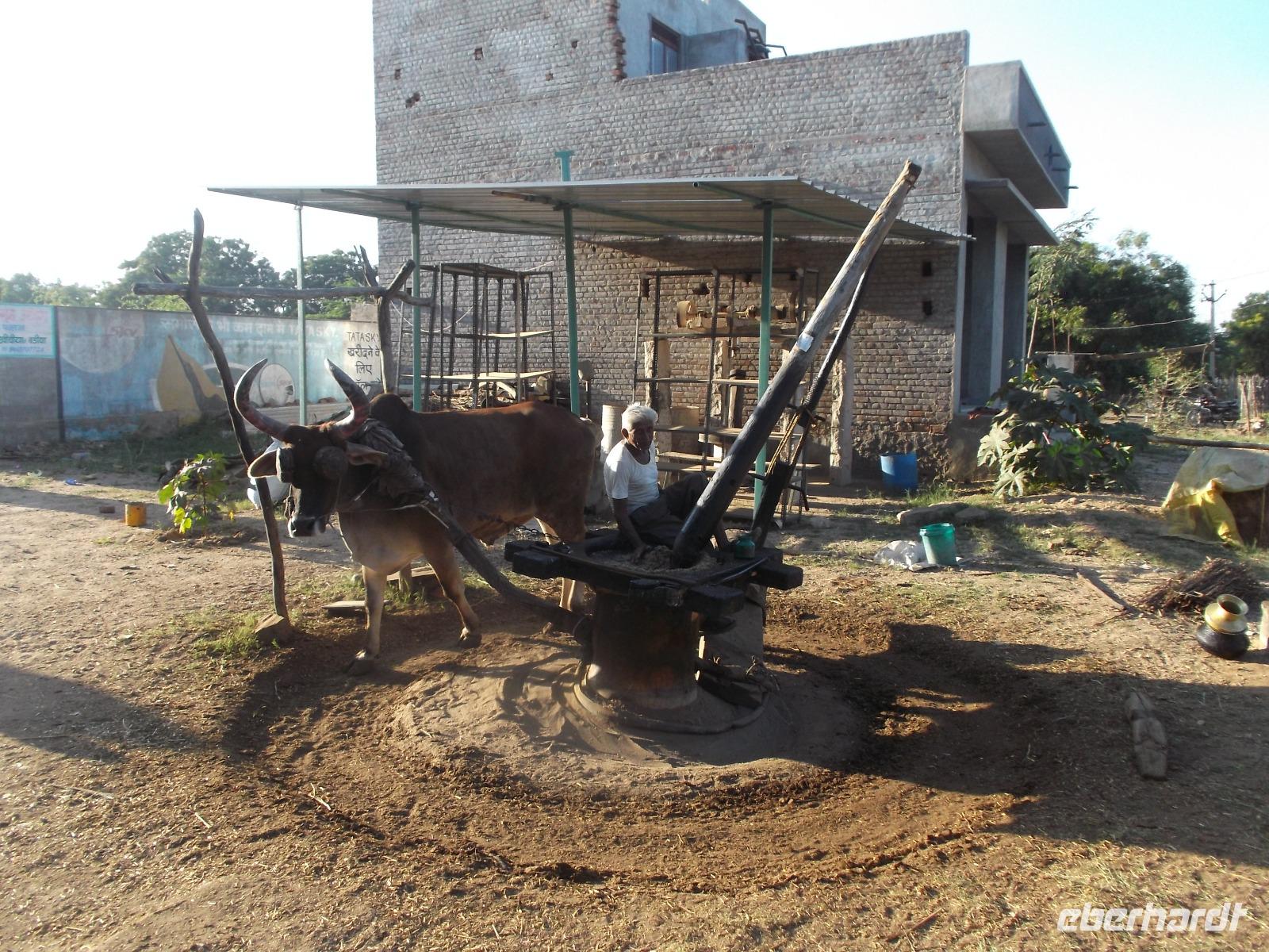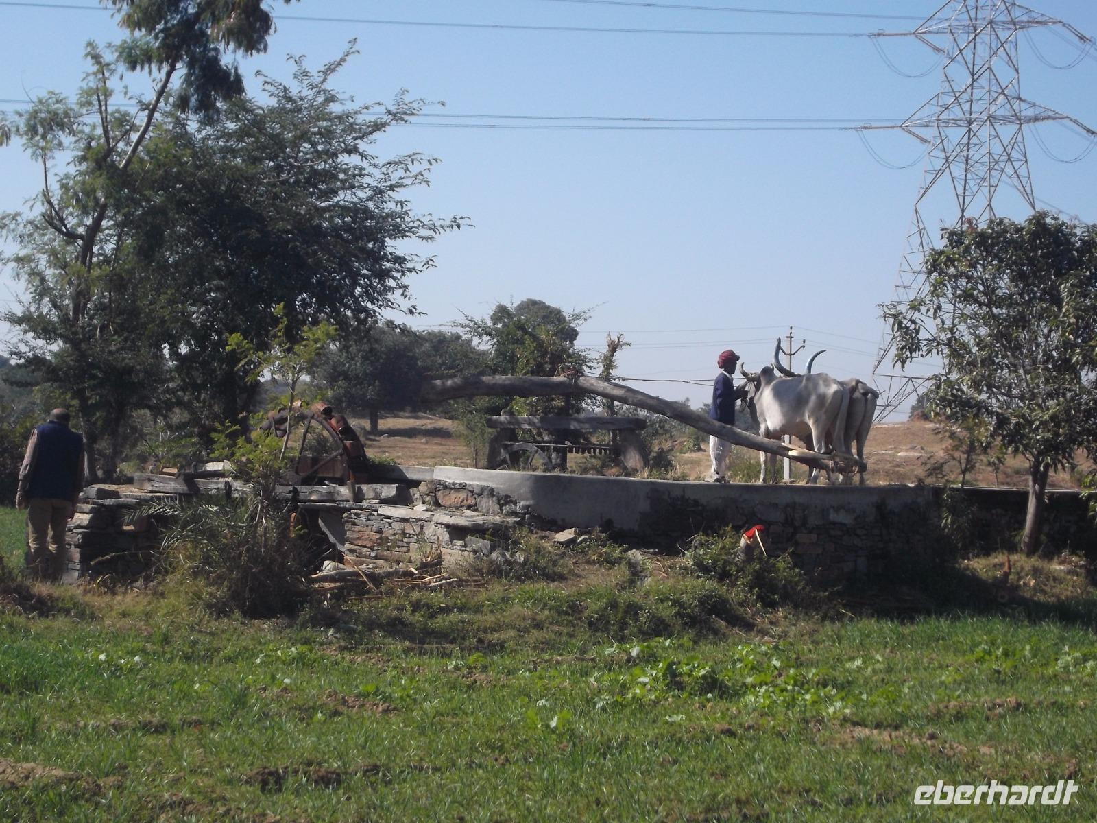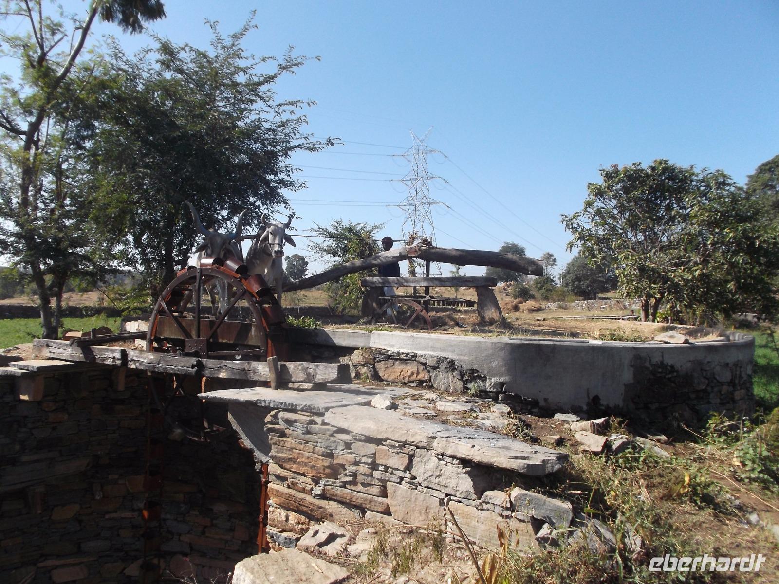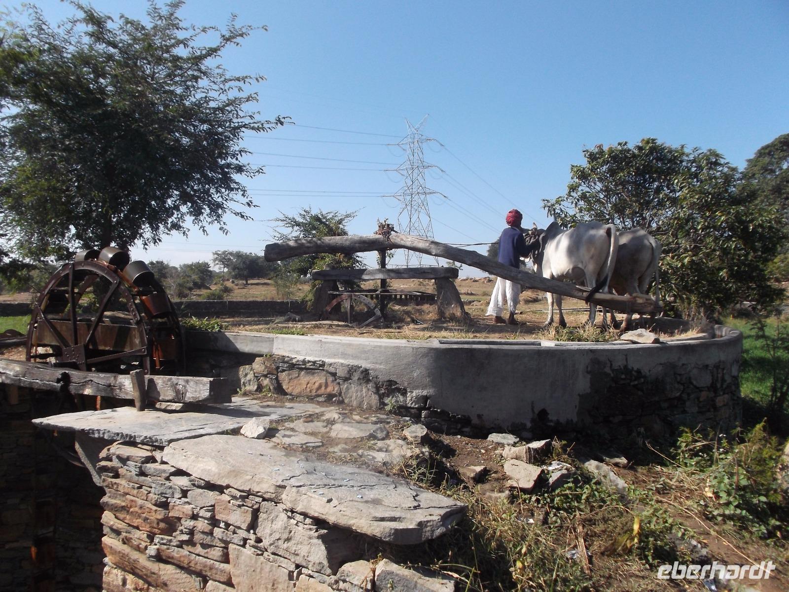 Ziel unserer heutigen Busfahrt waren zunächst die berühmten, wenn auch etwas versteckt liegenden Tempel von Ranakpur, herrliche Höhepunkte der Kunst der Jain-Religion. Aber auch der Weg dorthin hielt Überrschendes bereit: zunächst legten wir einen Fotostopp ein an einem Baum, der von vielen Flughunde in ihrer Ruhephase tagsüber bevölkert wird. Höchst interesssant waren auch die vielen historischen Wasserschöpf-Anlagen, die man hier in den felsigen und normalerweise wasserarmen Höhenzügen des Aravalli-Gebirges findet. Aber viele Teiche und Wasserlöcher sind nach dem Monsun gefüllt, an einigen Stellen gibt es Quell- und Grundwasser-Seen, aus denen die Bauern seit undenklichen Zeiten Wasser schöpfen, das in Auffangbecken gegossen und dann über Kanäle verteilt wird, um über einb einfaches aber ausgeklügeltes System ihre kargen Felder zu bewässern. Langen „Förderbänder" mit fest angebrachten Schöpfkrügen laufen über ein großes Holzrad und reichen senkrecht bis zum Wasser. Das Schöpfrad mit Förderband wiederum wird über ein recht einfach wirkendes System meist hölzerner Zahnräder bewegt, die ein Ochsengespann antreibt. In Europa gab es so etwas erst seit dem Mittelalter.