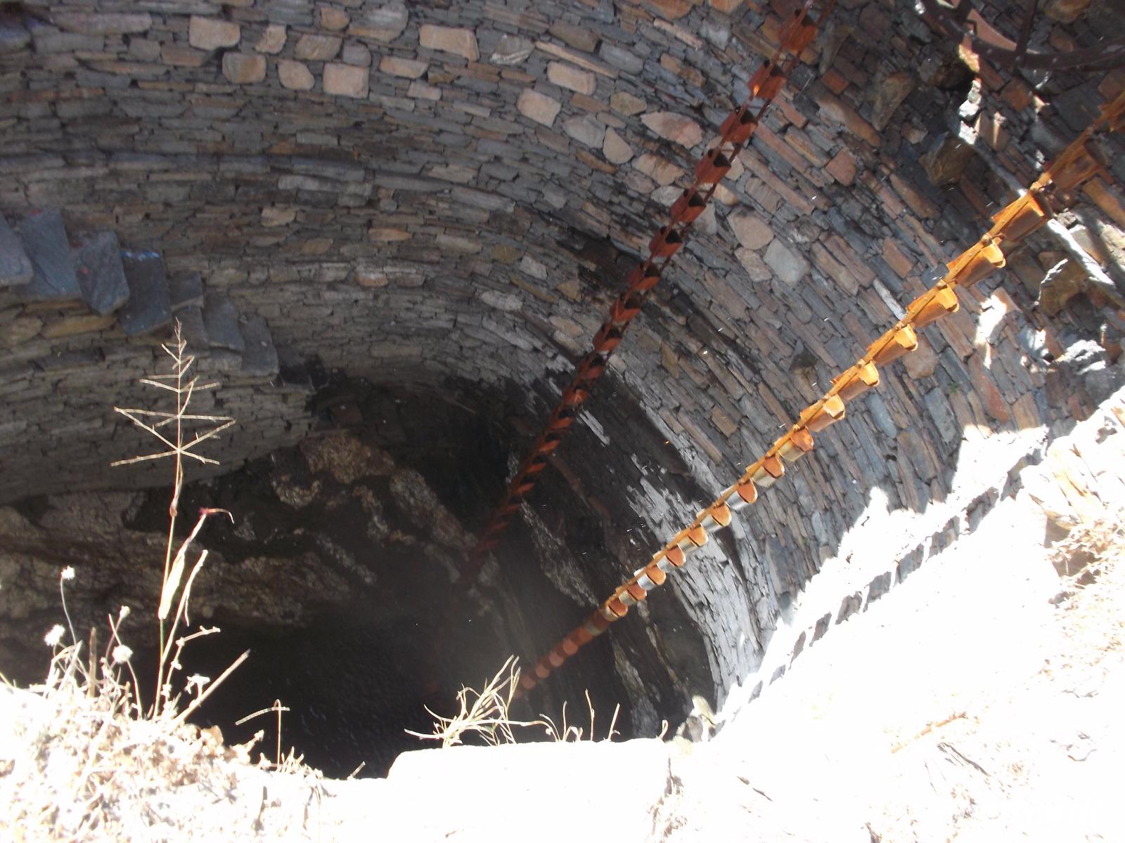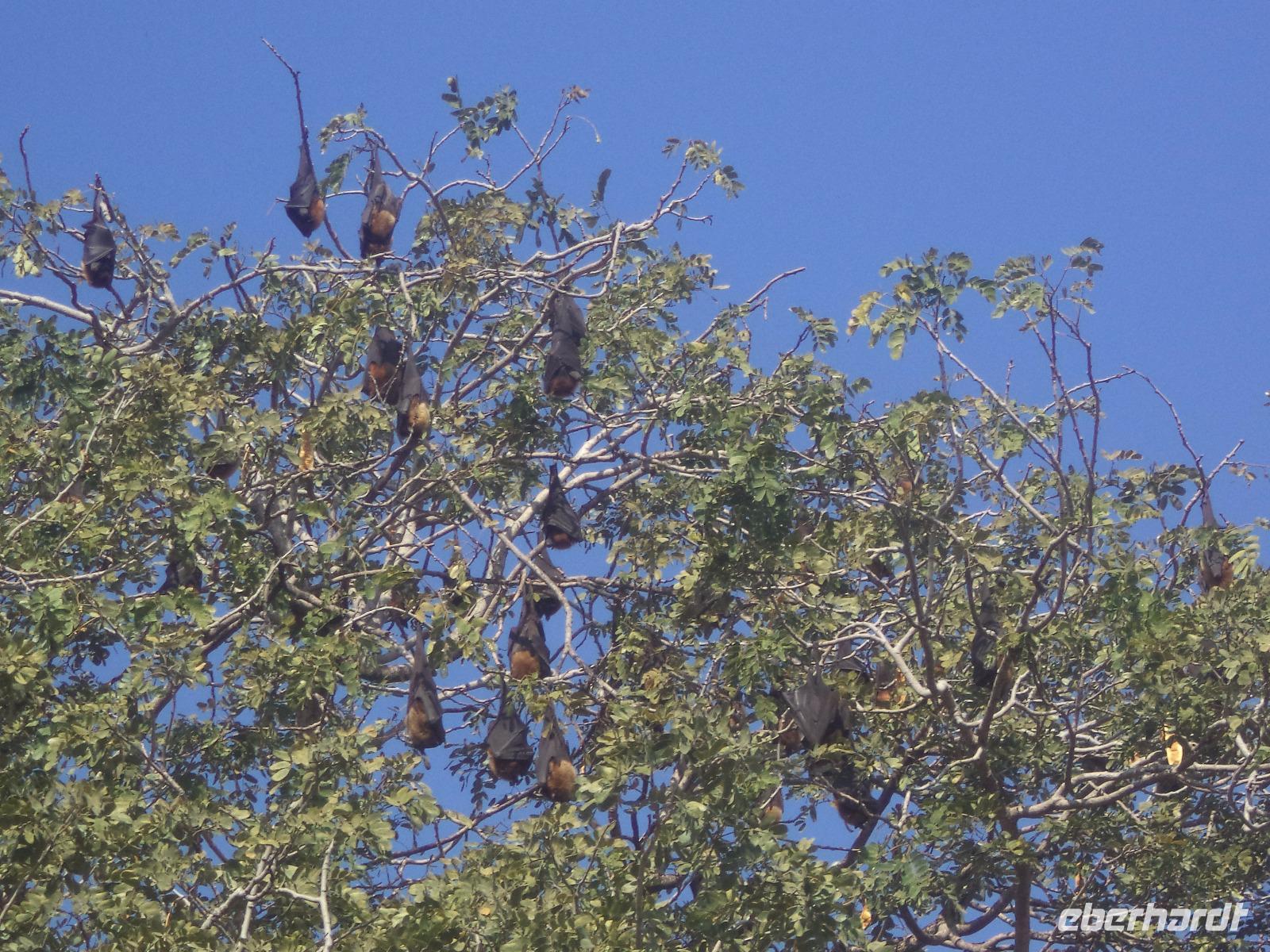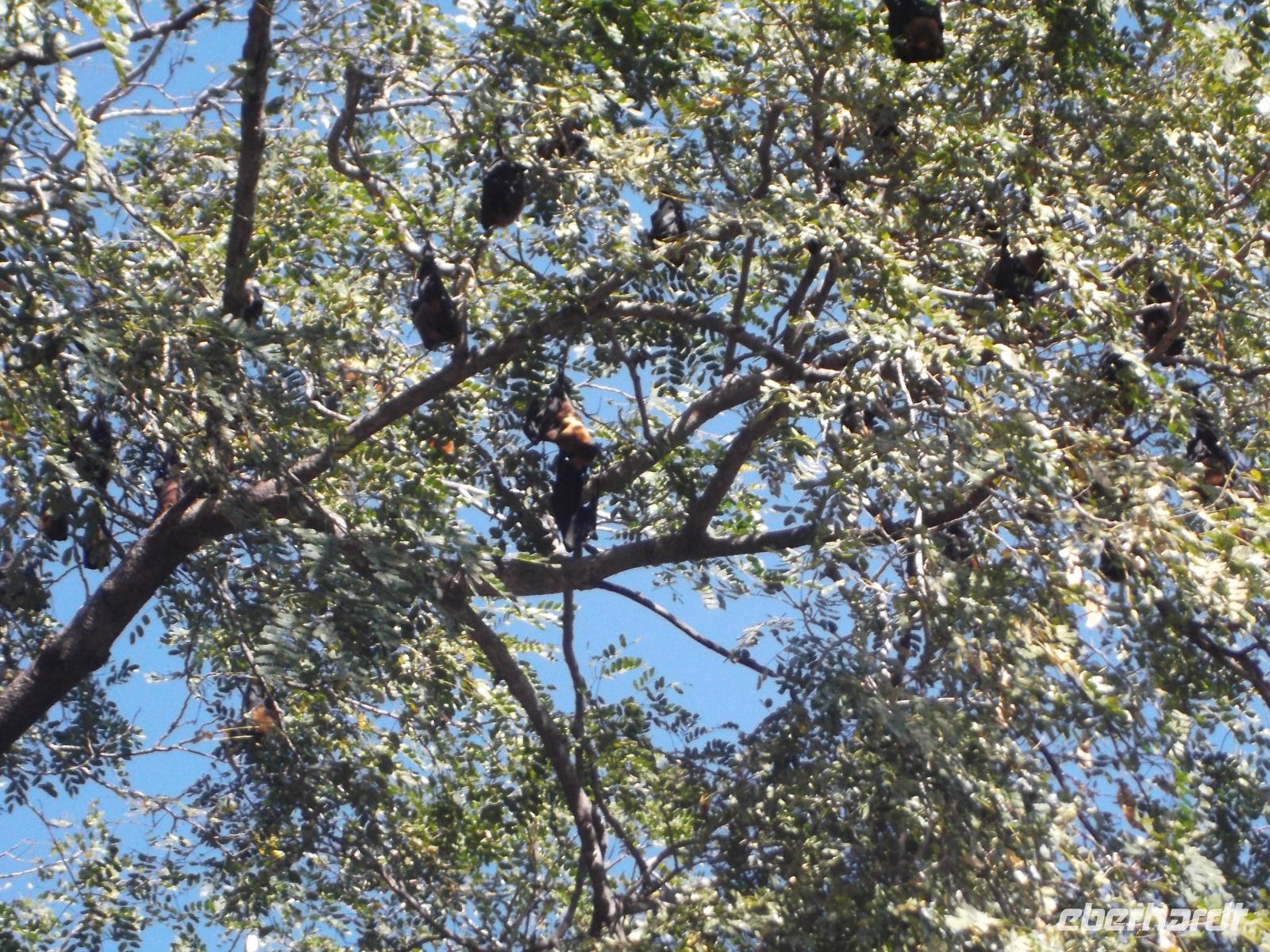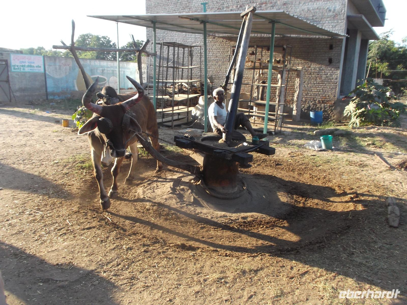 Ziel unserer heutigen Busfahrt waren zunächst die berühmten, wenn auch etwas versteckt liegenden Tempel von Ranakpur, herrliche Höhepunkte der Kunst der Jain-Religion. Aber auch der Weg dorthin hielt Überrschendes bereit: zunächst legten wir einen Fotostopp ein an einem Baum, der von vielen Flughunde in ihrer Ruhephase tagsüber bevölkert wird. Höchst interesssant waren auch die vielen historischen Wasserschöpf-Anlagen, die man hier in den felsigen und normalerweise wasserarmen Höhenzügen des Aravalli-Gebirges findet. Aber viele Teiche und Wasserlöcher sind nach dem Monsun gefüllt, an einigen Stellen gibt es Quell- und Grundwasser-Seen, aus denen die Bauern seit undenklichen Zeiten Wasser schöpfen, das in Auffangbecken gegossen und dann über Kanäle verteilt wird, um über einb einfaches aber ausgeklügeltes System ihre kargen Felder zu bewässern. Langen „Förderbänder" mit fest angebrachten Schöpfkrügen laufen über ein großes Holzrad und reichen senkrecht bis zum Wasser. Das Schöpfrad mit Förderband wiederum wird über ein recht einfach wirkendes System meist hölzerner Zahnräder bewegt, die ein Ochsengespann antreibt. In Europa gab es so etwas erst seit dem Mittelalter.