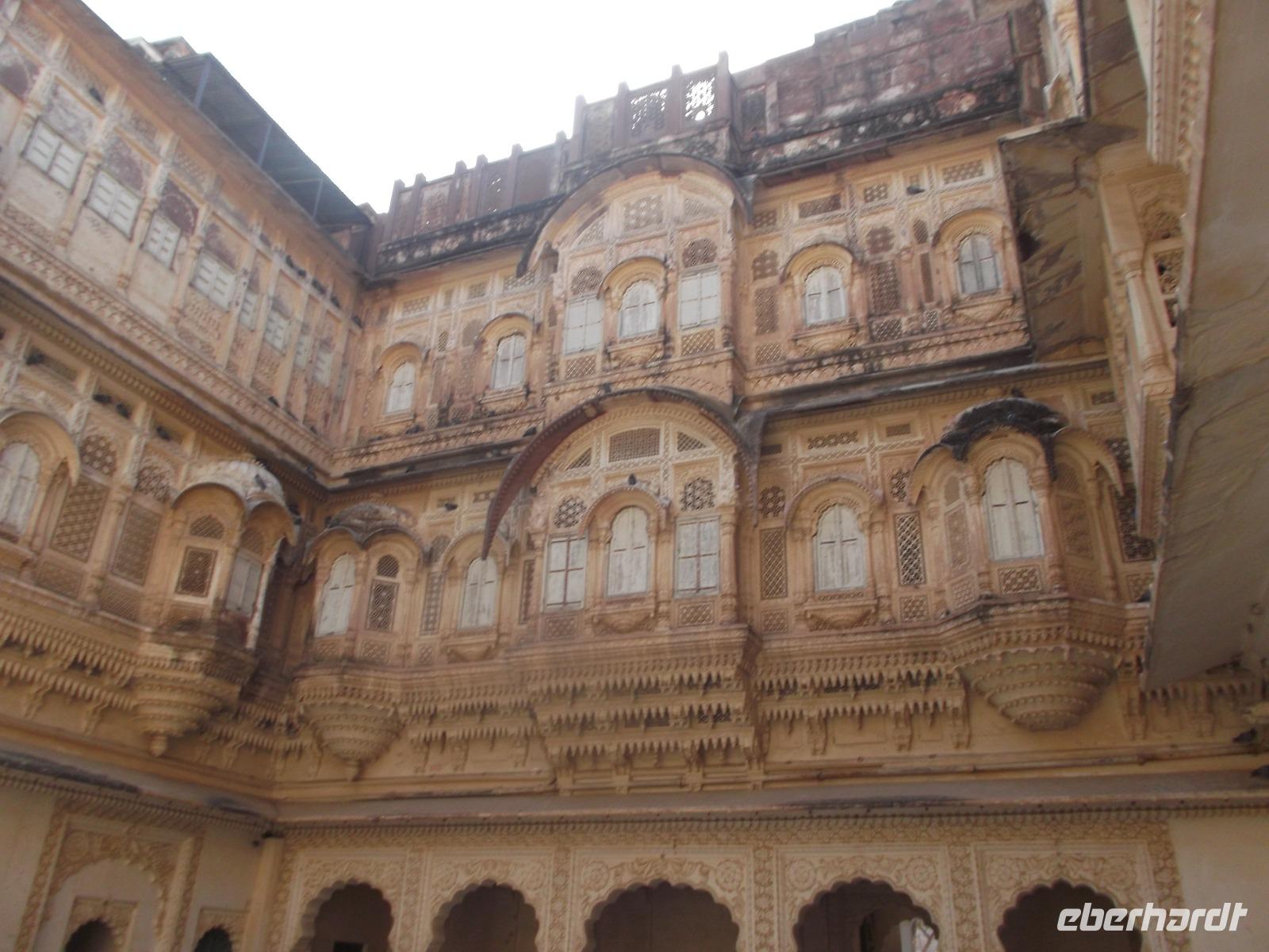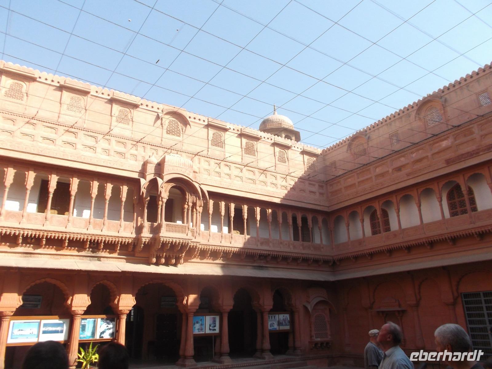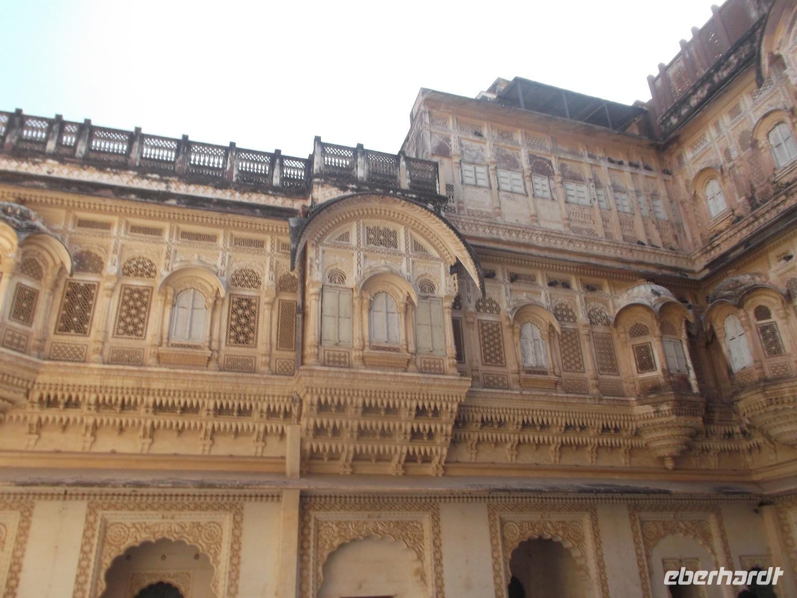 Dessen Besichtigung bildete heute den Tagesauftakt. Das wehrhafte, aber dennoch prunkvolle Junargarh Fort wurde im 16. Jahrhundert zunächst aus Gips errichtet, spätere Umbauten und Modernisierungen ergaben Erweiterungen mit Sandstein-Befestigungen. Es beherbergt als Museum heute herrliche Palasträume, von denen viele nach bestimmten Themen gestaltet sind, wie etwa der Wolken- oder der Blumenpalast. Sie gruppieren sich - wie fast alle Palastbauten in Indien, um hübsche und strahlend weiße Innenhöfe und verzierte Brunnen.