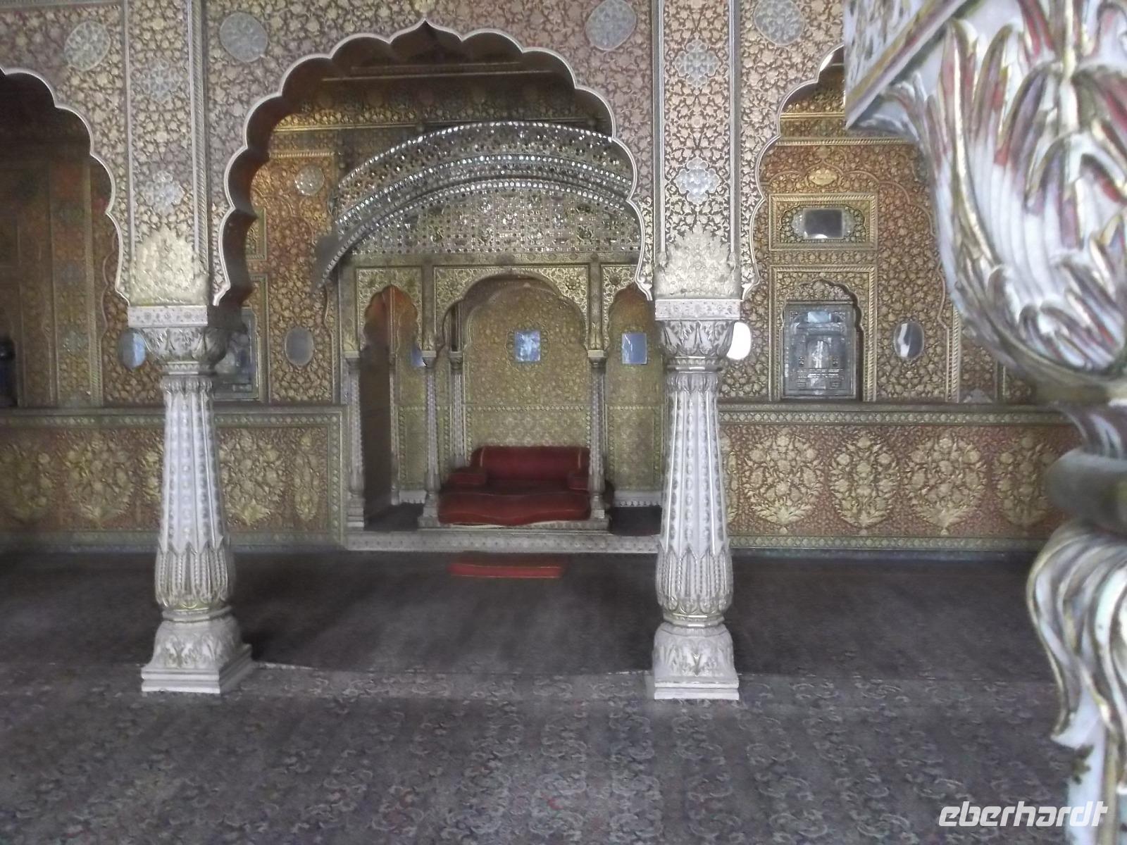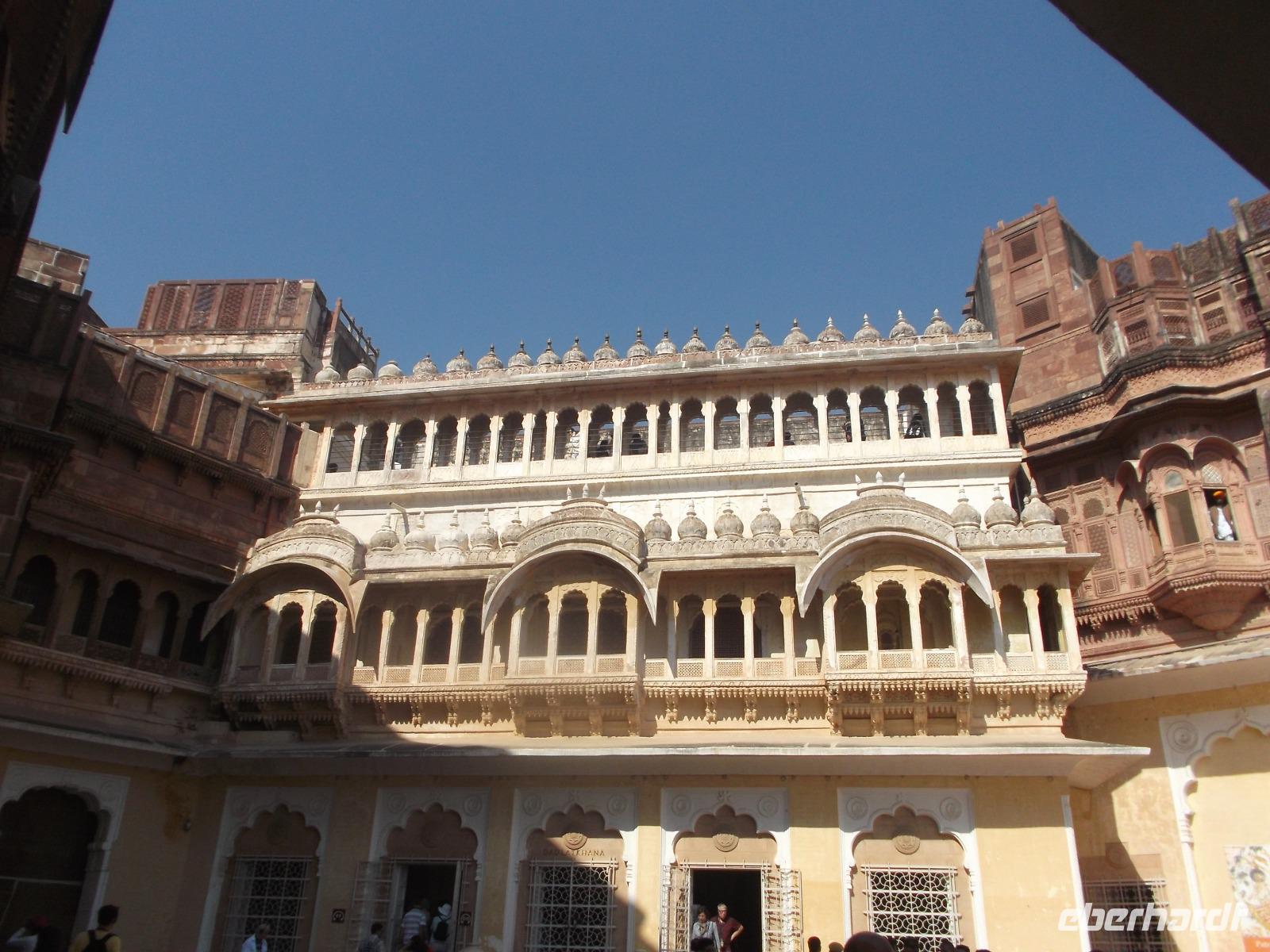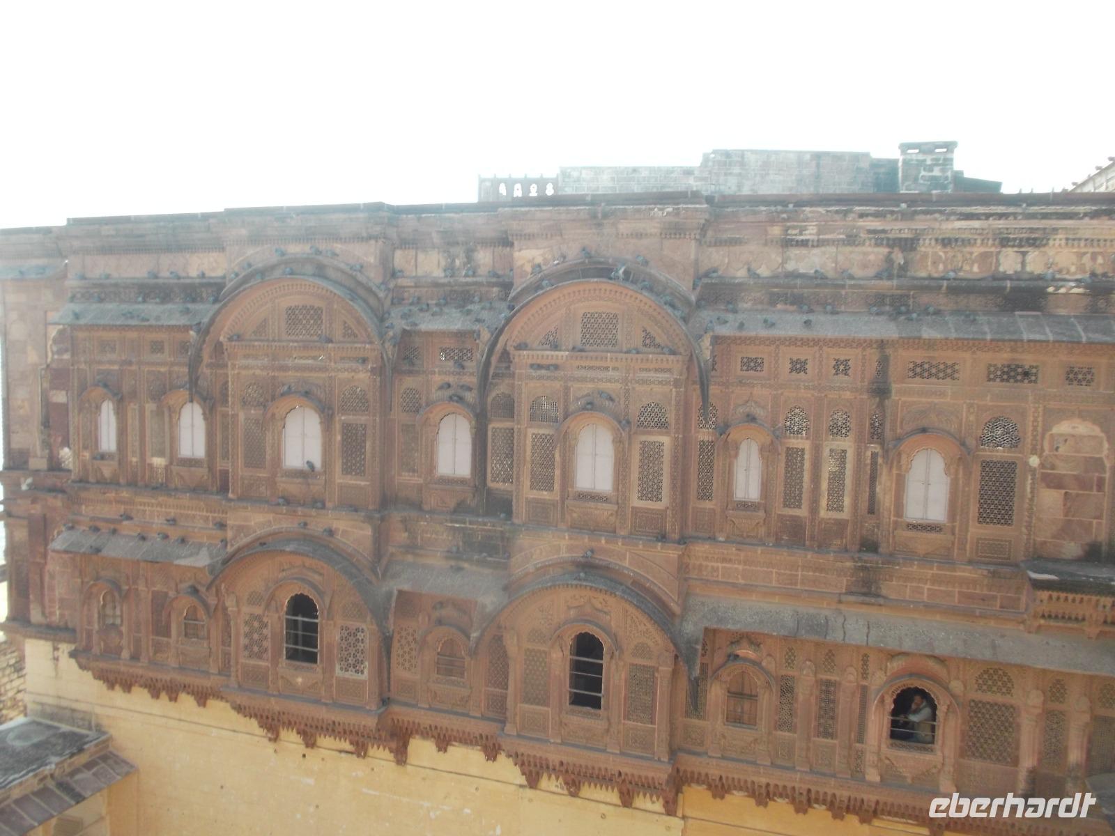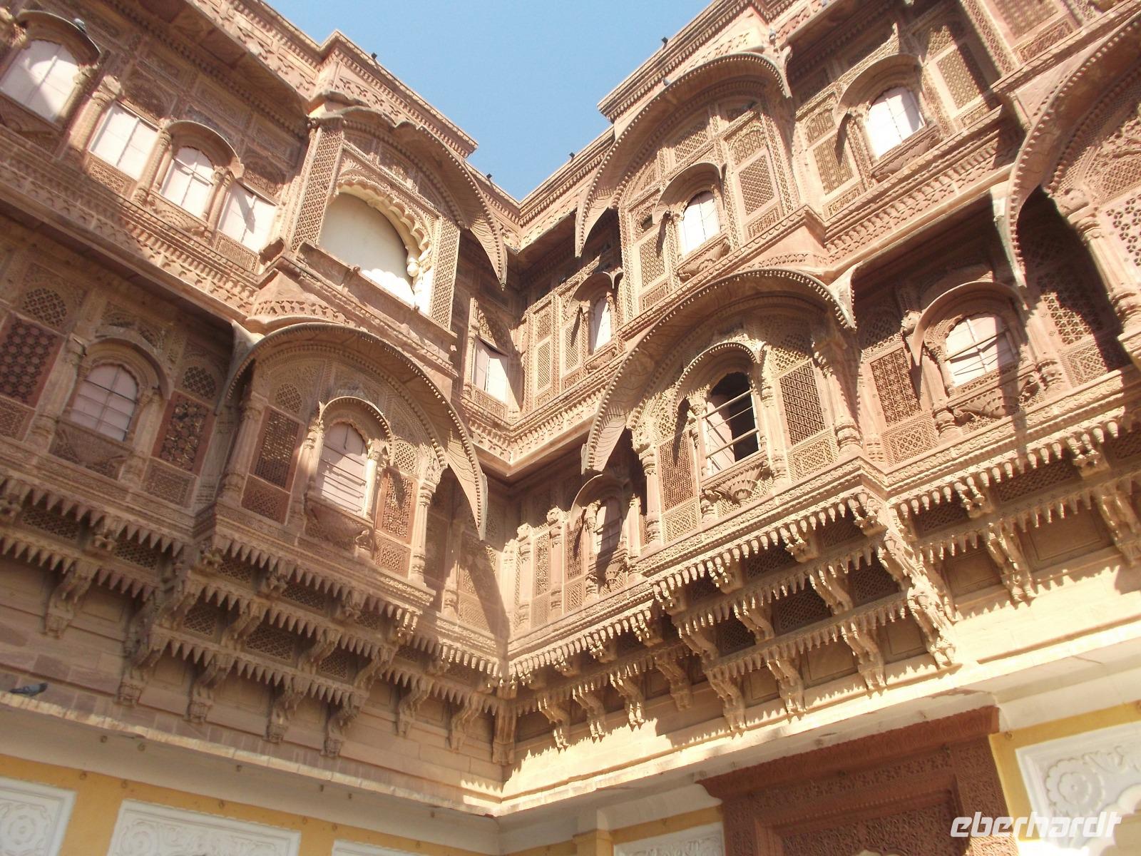 Dessen Besichtigung bildete heute den Tagesauftakt. Das wehrhafte, aber dennoch prunkvolle Junargarh Fort wurde im 16. Jahrhundert zunächst aus Gips errichtet, spätere Umbauten und Modernisierungen ergaben Erweiterungen mit Sandstein-Befestigungen. Es beherbergt als Museum heute herrliche Palasträume, von denen viele nach bestimmten Themen gestaltet sind, wie etwa der Wolken- oder der Blumenpalast. Sie gruppieren sich - wie fast alle Palastbauten in Indien, um hübsche und strahlend weiße Innenhöfe und verzierte Brunnen.