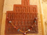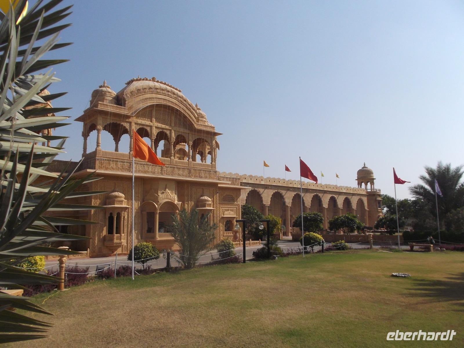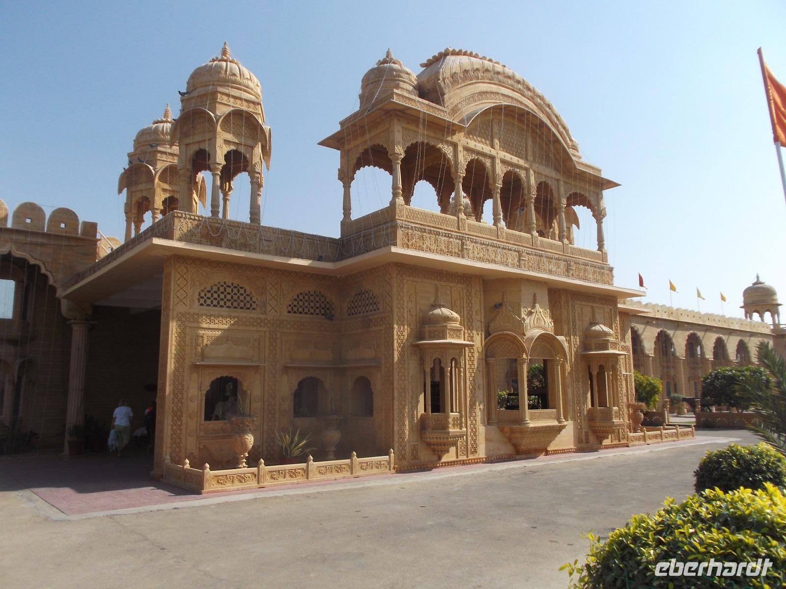 Der Tempel selbst ist durch zahlreiche Steinschnitzereien verziert und dient zur Verehrung von vielen der bedeutenden Hindugötter. Besonders geehrt wird - wie an vielen anderen Orten auch - der mit seinem Dreizack - dem Trishul - gekennzeichnete Zerstörergott Shiva. Nach ausführlichem Tempelbesuch verließen wir Osyan und fuhren weiter in Richtung Zentrum der Thar-Wüste. Nach längerer Fahrt erreichten wir kurz nach Sonnenuntergang die alte Wüstenstadt und Handelsmetropole Jaisalmer, an deren Rand wir in einem herrlichen Palast, heute Luxushotel, wohnten.