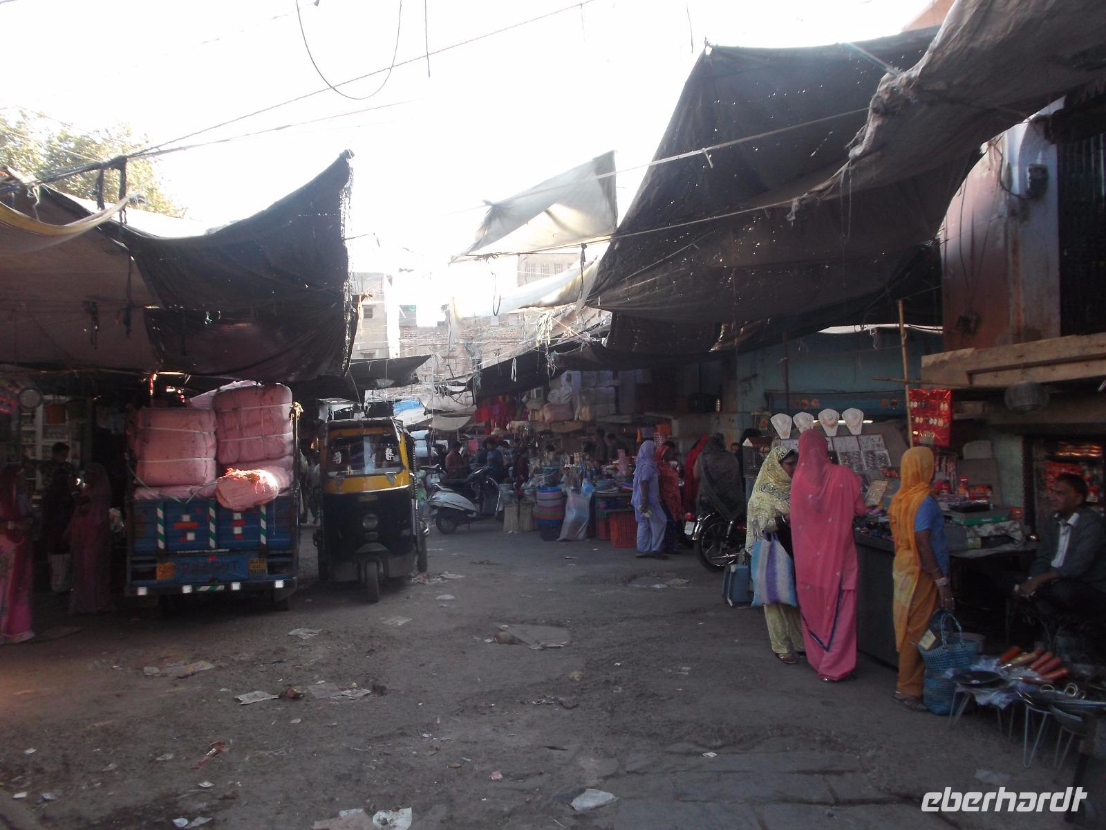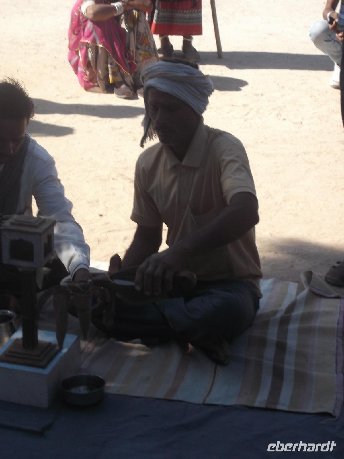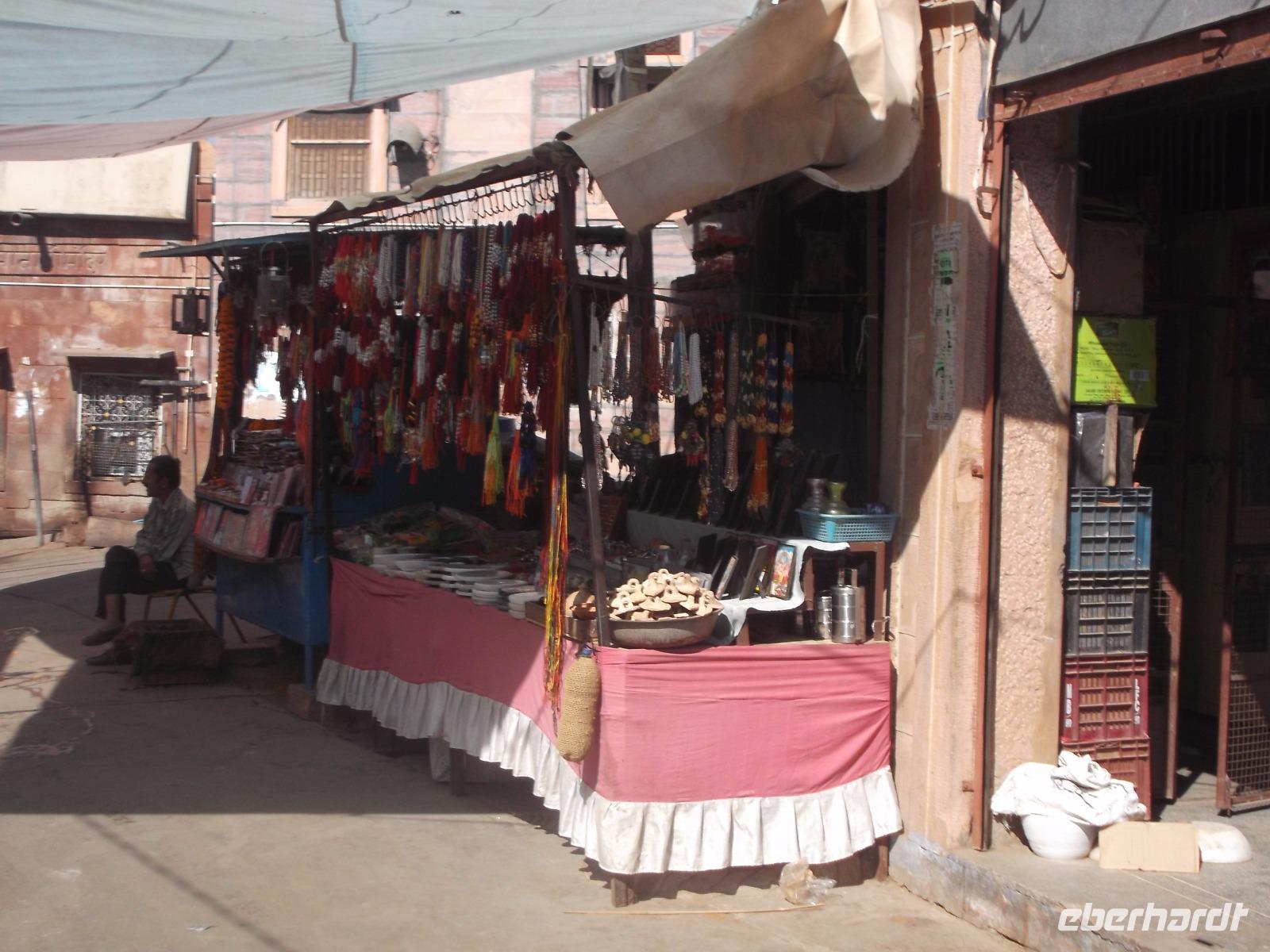 Jodhpurs zweites Wahrzeichen, das hoch auf einem Felsen liegende und aufgrund der strategisch günstigen Lage nie eroberte Meherangarh Fort war einst Residenzschloss und Felsenfestung des Rajputenstaates Marwar. Über fast zehn Kilometer Länge erstrecken sich bis heute die gewaltigen Wehrmauern mit ihren acht Toren und umschließen die Festung, die fast 300 m hoch über der Stadt auf einem Felsen thront. Um uns den beschwerlichen Aufstieg zu ersparen, nutzten wir den kostenpflichtigen Aufzug und standen alsbald auf der dem Schloss vorgelagerten Wehrterrasse hoch über der Stadt. Der Königliche Palast, überall reich verziert und zudem mit mehreren schönen Ausblicken auf die „blaue" Stadt Jodhpur, enthält zunächst den alten Audienzhof mit dem historischen Marmorthron von Jodhpur. Auf unsere Bitte führte die Palastwache vor, wie man einen Turban wickelt - eine acht bis neun Meter lange Stoffbahn legt sich der Turbanträger gekonnt um den Kopf legt - und dann ging es los zu einem Rundgang durch die Prunk- und Repräsentationsgemächer des alten Staates Marwar. Beim Passieren des Ausgangstores sahen wir noch die in die Torfahrt eingelassenen „Sati-Steine", Ehrenmale für die früheren Opfer der berüchtigten Witwenverbrennungen. Auf steilem Weg begaben wir uns dann in die nahegelegenen engen Gassen der Altstadt von Jodhpur. Hier suchten wir einen Gewürzhändler auf, der zu den größten seiner Zunft in der einschlägig bekannten Handelsstadt Jodhpur zählt. Die junge Frau, die den Laden ihres Vaters seit Jahren fortführt, erzählte uns einiges zu den wichtigsten Gewürzen und den vorwiegend verwendeten Mischungen, den „Masalas". Wir konnten einige davon erwerben und nach Gelegenheit zum Mittagessen nahe dem Markt in der anschließenden Freizeit den vielleicht buntesten und aufregendsten Markt von Rajasthan erlebe. Er hat viel Ähnlichkeit mit den einstigen mittelalterlichen Märkten in Europa. Händler, die Lebensmittel, Obst und Gemüse feilbieten, Krämer für Kleidung, Schmuck und Einrichtungsgegenstände, Handwerker, die vor unseren Augen Körbe, Schlösser oder Schuhe prozierten... Natürlich kann man sich hier ein Paar Sandalen im Handumdrehen anfertigen lassen - wahlweise aus Leder oder alten Autoreifen. Auch der Zahnarzt - dessen Sprechzimmer auf dem offenem Markt aus einem Tisch mit Werkzeugen und Gebissen und einem „Behandlungsstuhl" besteht (und dessen Praxis aufgrund der Werkzeuge offen gestanden mehr an eine Fahrrad- oder Autowerkstatt erinnert) - praktiziert hier ...