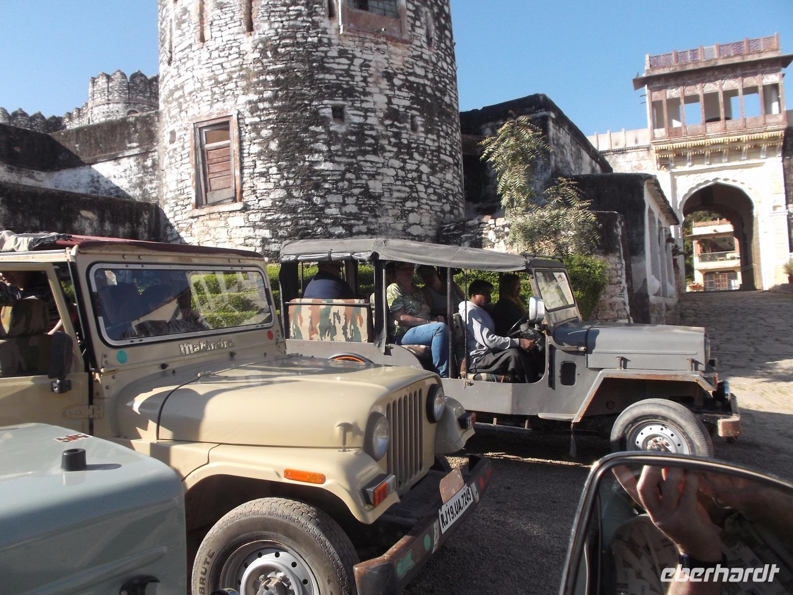 Wir trafen uns nach angemessener Zeit und damit unsere Gäste auch wirklich alle indischen Verkehrsmittel einmal kennenlernen konnten, bestellten wir für die Rückfahrt zum Bus ein paar Pferdekutschen, mit denen wir rasch durch den dichten Verkehr zum Busparkplatz gelangten. Noch eine etwas längere Fahrt war es dann zu unserem Ziel, dem zum Hotel ausgebauten Wüstenfort Khejrala.