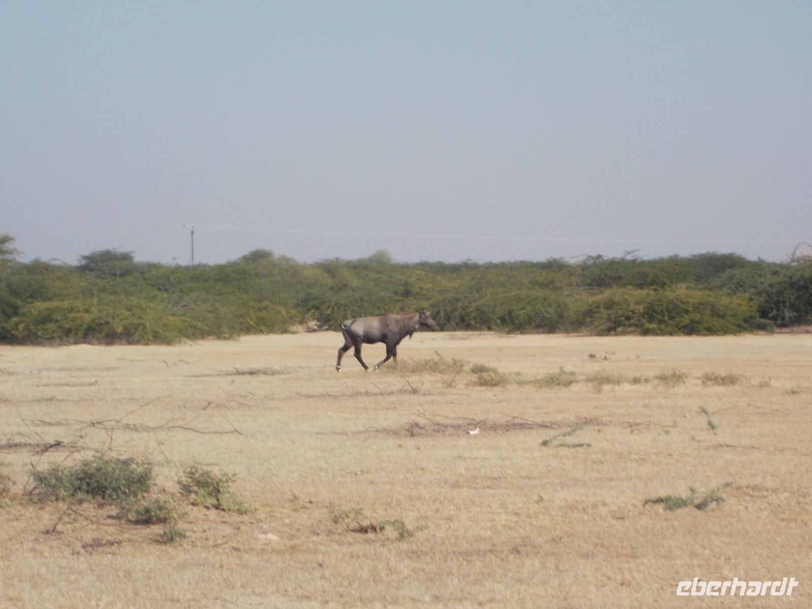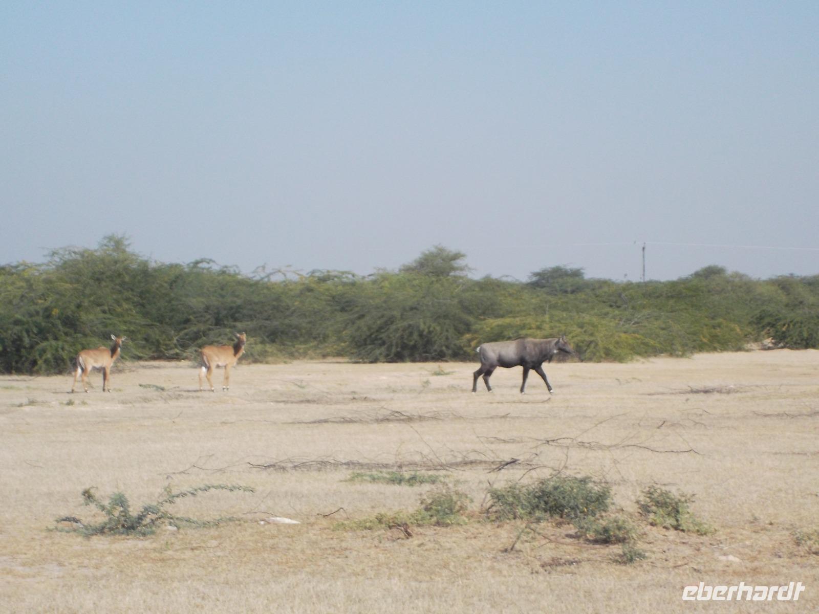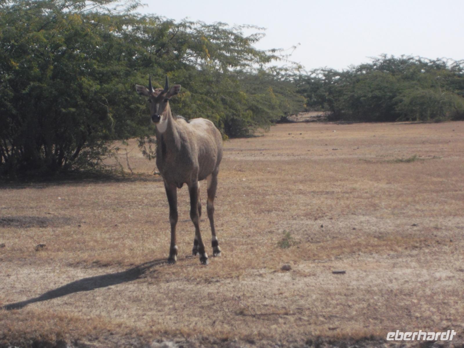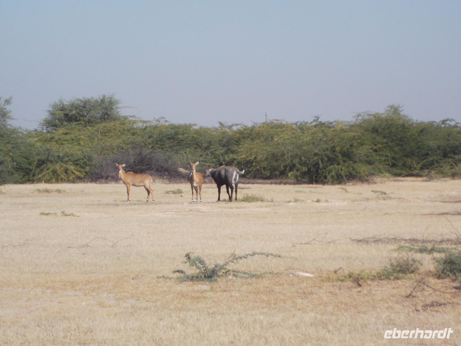Zur zusätzlichen Unterhaltung und zum Kennenlernen auch wenig touristisch frequentierter Gegenden hatten wir eine halbtägige Jeepsafari am Vormittag offeriert, auf der unsere Gäste mehr vom Leben auf dem Land in Indien mitbekommen konnten. Der Nachmittag würde immer noch zur Erholung bleiben. Alle Gäste wollten noch mehr vom „echten" Indien erleben und haben an der Safari teilgenommen. Mit ein paar Jeeps fuhren wir querfeldein durch die Steppe, sahen Nilgai-Antilopen und Axishirsche und legten eine kleine Pause ein an den Überresten der traditionellen historischen Verbrennungsstätten der Rajas von Khejrela.