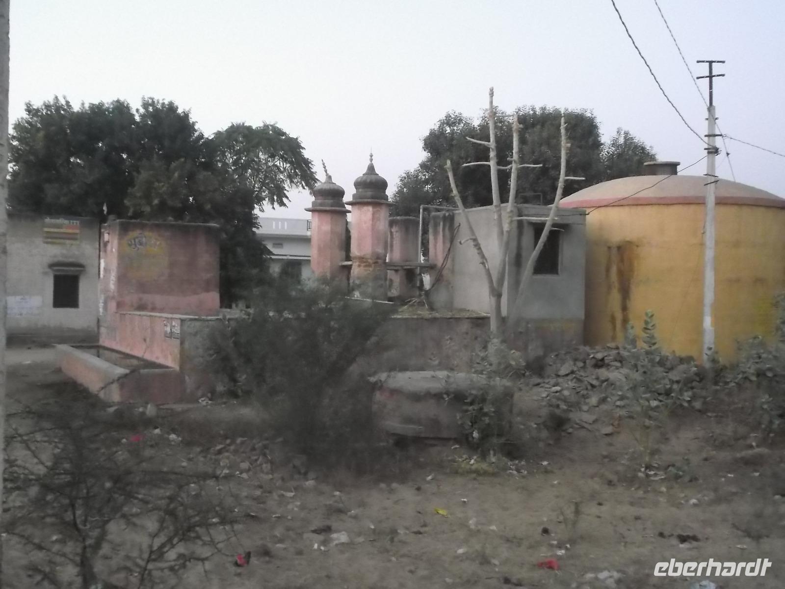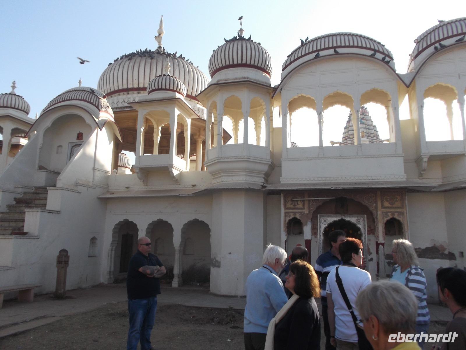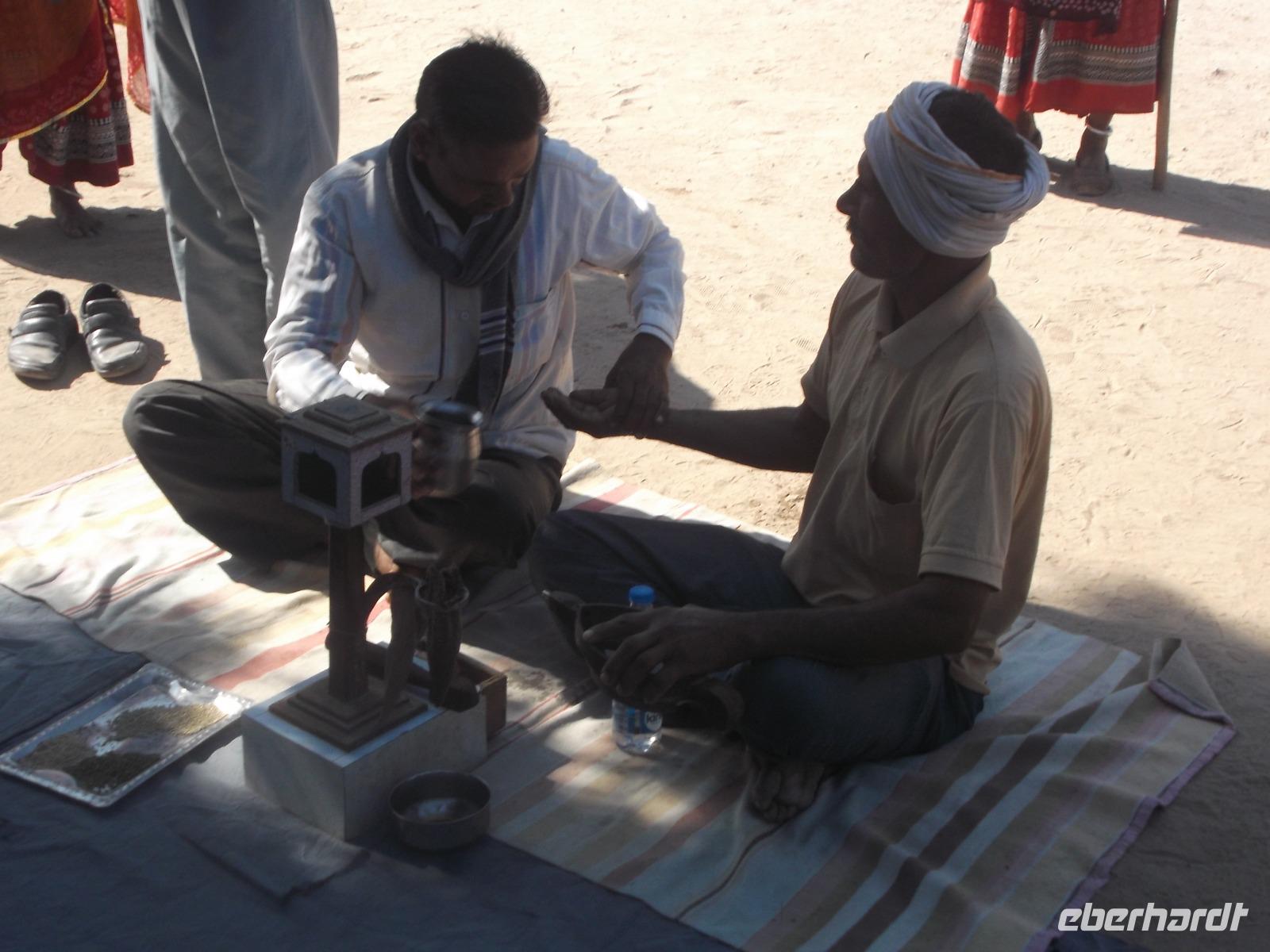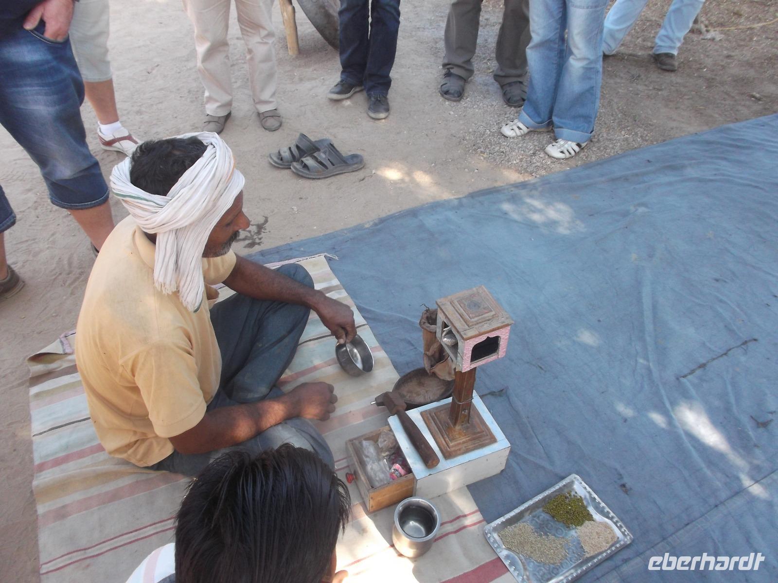 Hier wurden seit Jahrhunderten die Körper der Verstorbenen nach alter Hindusitte den fünf Elementen (Erde, Feuer, Wasser, Luft und Universum) übergeben. Bei wichtigen Persönlichkeiten erinnert eine Steinplattform an die Stätte ihrer Einäscherung und oft wird an späteren Jahrestagen der Verbrennung ein steinerner Baldachin darüber errichtet. In Khejrala gelten diese Kenotaphe, die man in Indien „Chhatris" nennt, als die wichtigsten Gedenkstätten der Umgebung. Nach kurzem Besuch in einem einfachen Tempel an einem See mit Wasserschildkröten fuhren wir in ein traditionelles Dorf der Einheimischen. Wir betraten ein größeres Gehöft, in dem in kleinen verstreuten Wohnhäusern mehrere Generationen einer Großfamilie zusammenwohnen. Für uns hatte man die Gewohnheit, dass sich die Männer hier nachmittags zu gemeinsamen Zeremonien treffen, ein wenig vorgezogen und nachgestellt. Dennoch konnten wir uns einen recht interessanten Eindruck machen und einen gewissen Einblick in authentisches Dorfleben des Stammes der Bishnoi erhalten