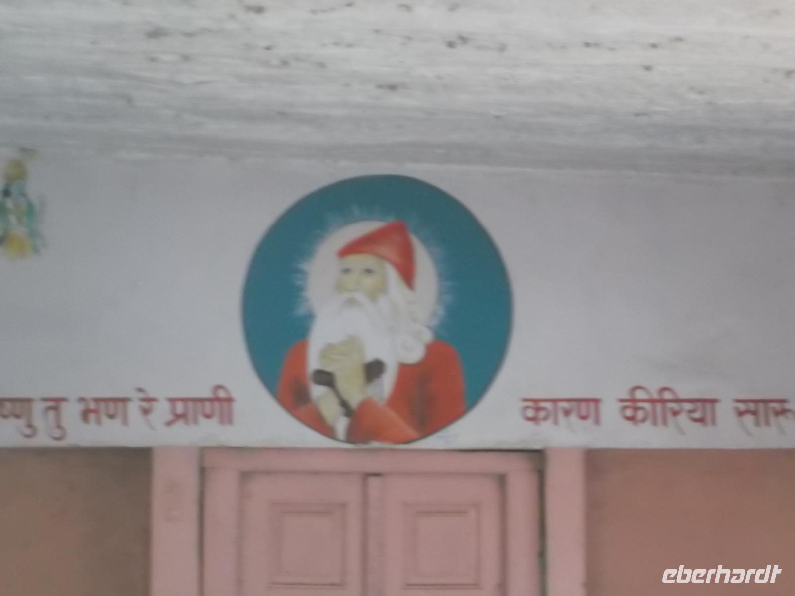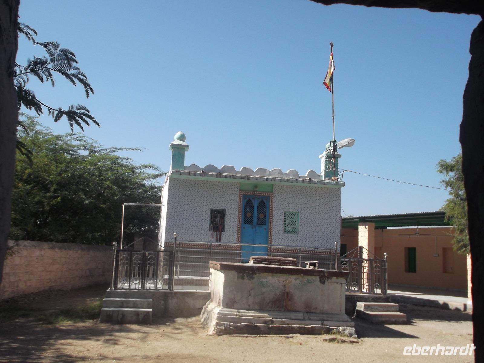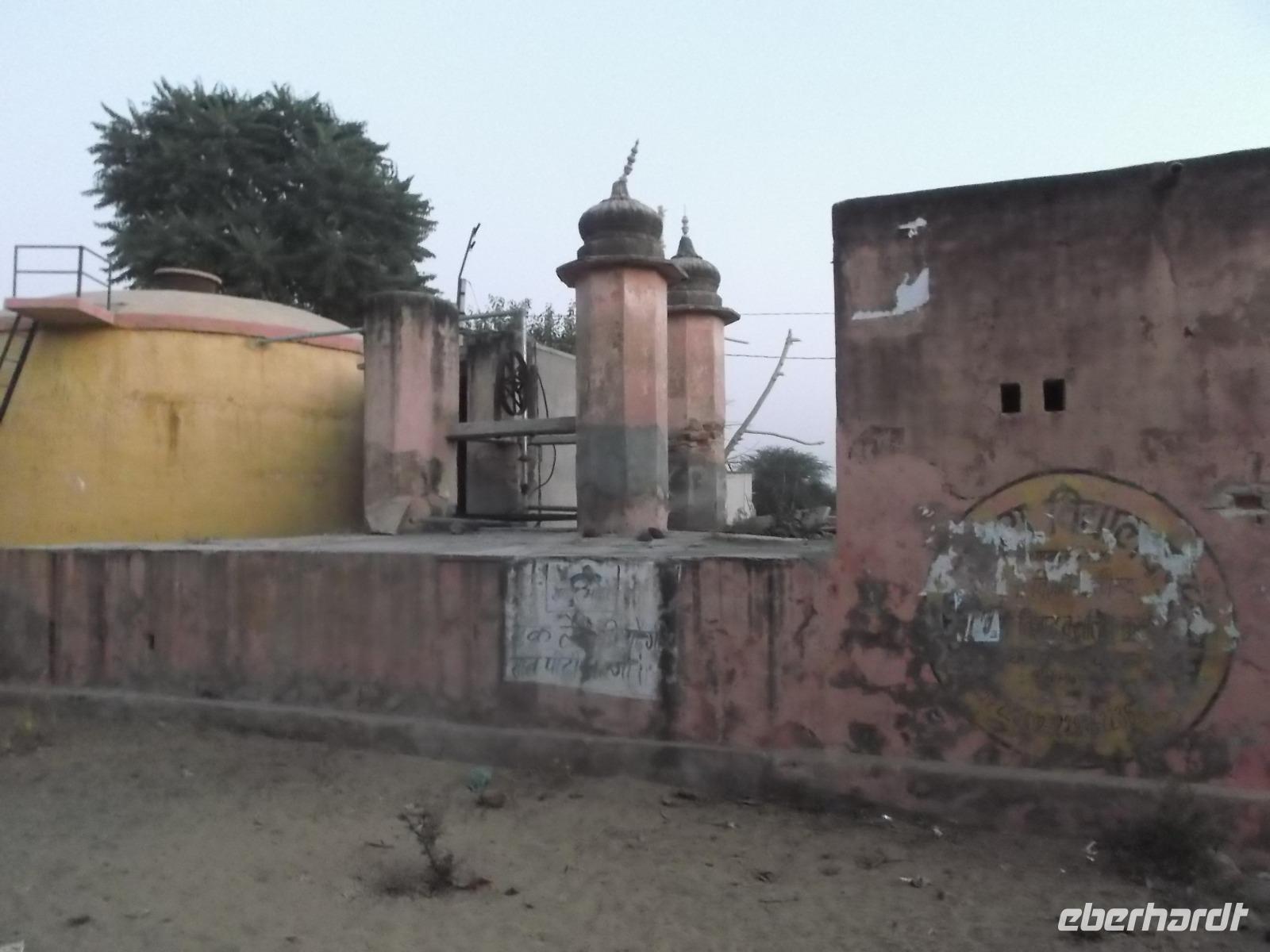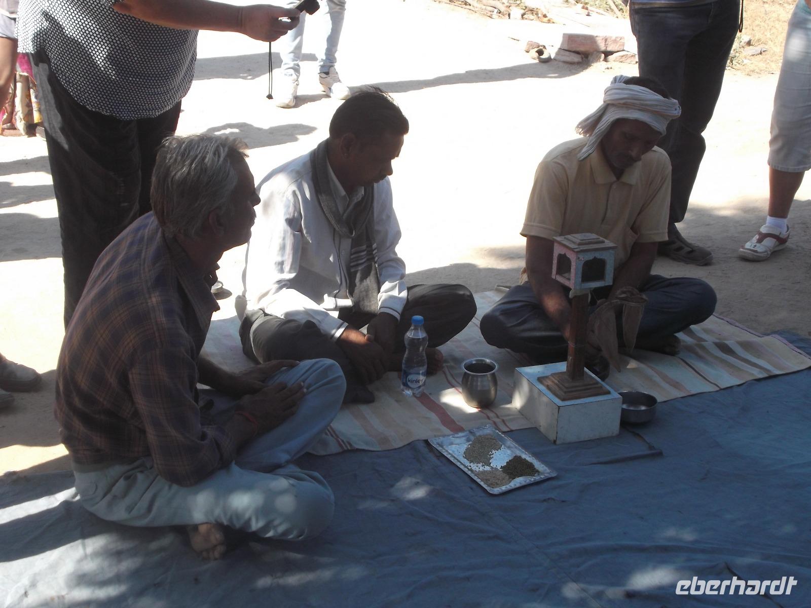 Hier wurden seit Jahrhunderten die Körper der Verstorbenen nach alter Hindusitte den fünf Elementen (Erde, Feuer, Wasser, Luft und Universum) übergeben. Bei wichtigen Persönlichkeiten erinnert eine Steinplattform an die Stätte ihrer Einäscherung und oft wird an späteren Jahrestagen der Verbrennung ein steinerner Baldachin darüber errichtet. In Khejrala gelten diese Kenotaphe, die man in Indien „Chhatris" nennt, als die wichtigsten Gedenkstätten der Umgebung. Nach kurzem Besuch in einem einfachen Tempel an einem See mit Wasserschildkröten fuhren wir in ein traditionelles Dorf der Einheimischen. Wir betraten ein größeres Gehöft, in dem in kleinen verstreuten Wohnhäusern mehrere Generationen einer Großfamilie zusammenwohnen. Für uns hatte man die Gewohnheit, dass sich die Männer hier nachmittags zu gemeinsamen Zeremonien treffen, ein wenig vorgezogen und nachgestellt. Dennoch konnten wir uns einen recht interessanten Eindruck machen und einen gewissen Einblick in authentisches Dorfleben des Stammes der Bishnoi erhalten