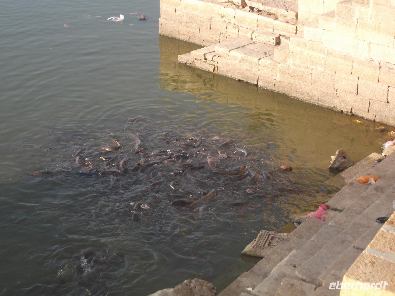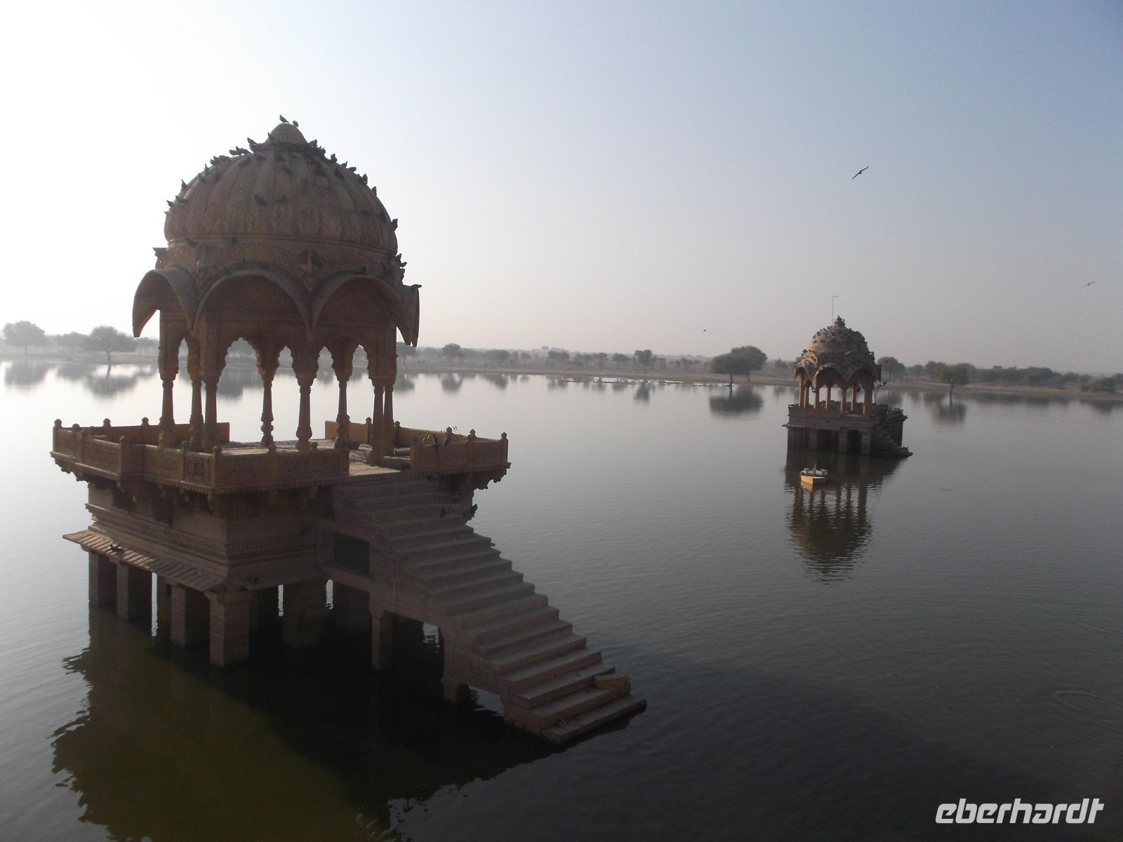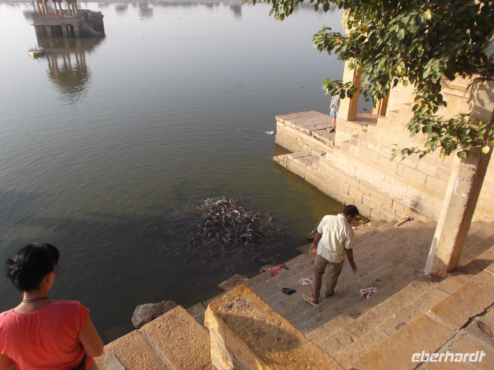 Zu Beginn des bevorstehenden ereignisreichen Tages brachte uns der Bus an den „heiligen" See vor den Toren Jaisalmers. Der „Gadi Sagar" wurde an einem Tempelkomplex als Monsunstausee mit altem Tor und einem Shivatempel angelegt. Eine Besonderheit sind die riesigen, in großen Mengen hier lebenden Welse, die man füttern kann und die dann in ihrer Gier nach Futter gewaltige Knäuel aus Fischleibern bildeten.